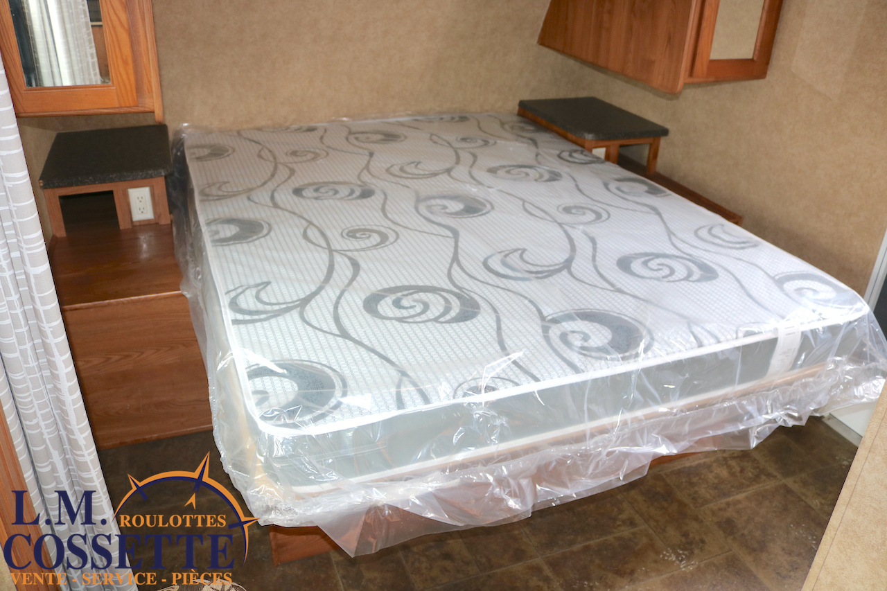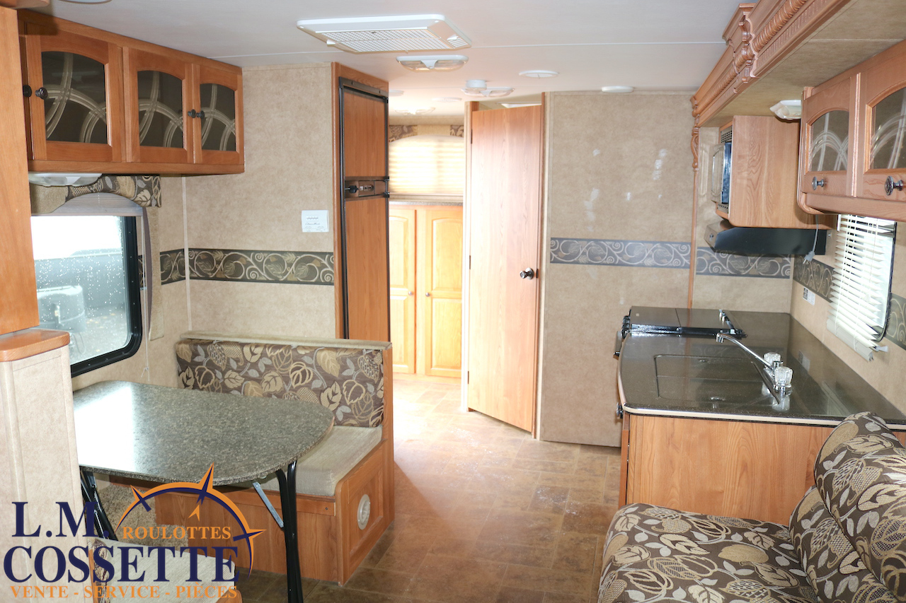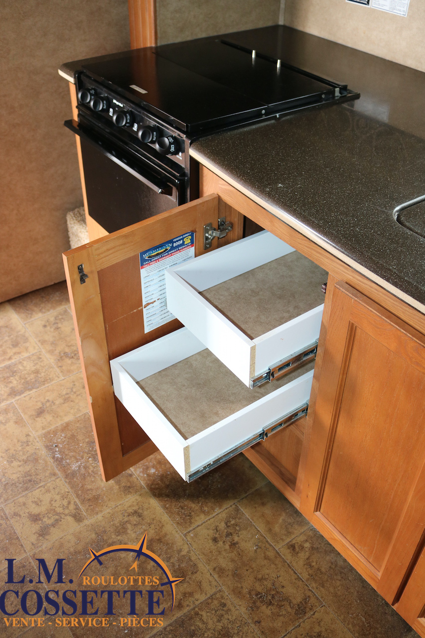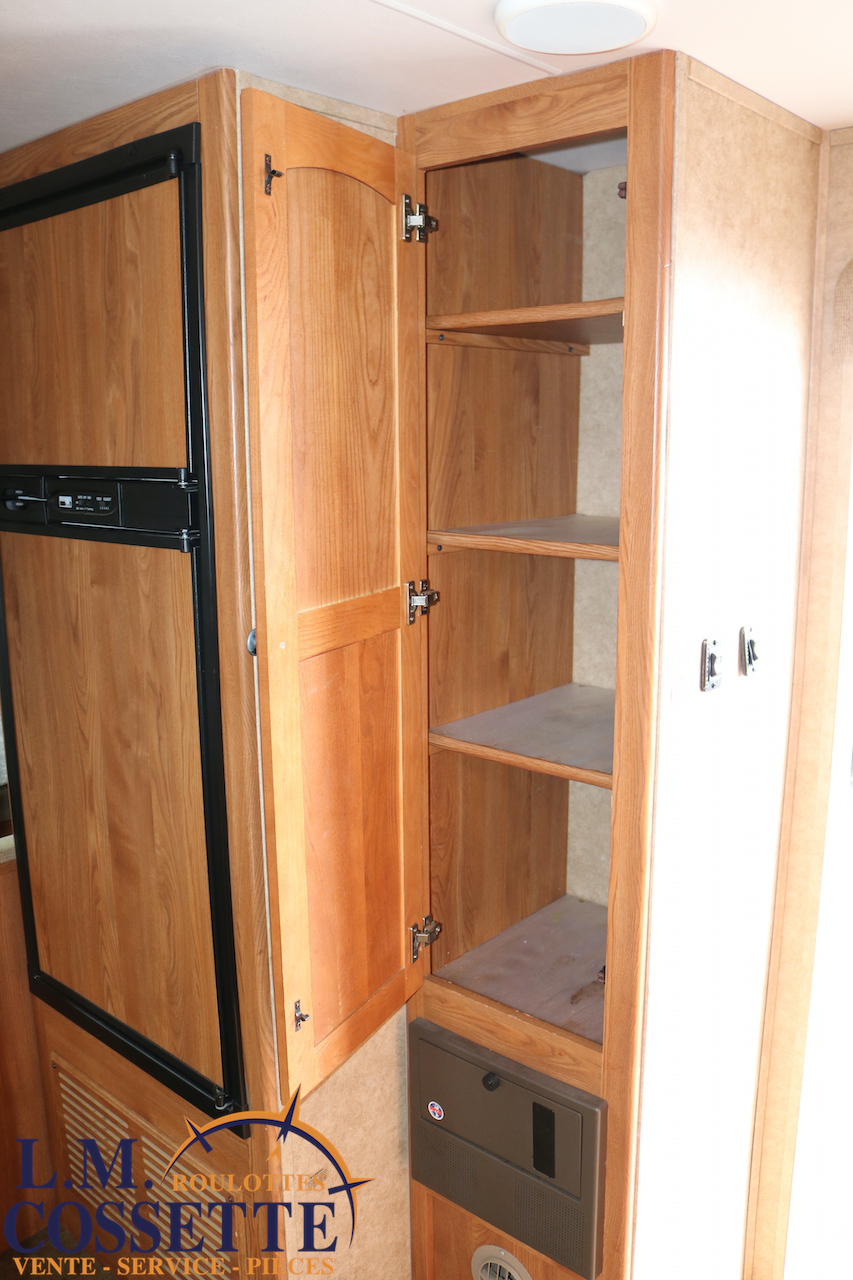 RAVISSANTE ROULOTTE POUR COUPLE !!! Elle possède une rallonge pour le comptoir et le divan . Ce même comptoir est moulé et son plan de travail est très grand . La chambre possède un lit accessible des deux côtés , et un rideau peut fermer la chambre . Elle possède , de plus , un bel espace de rangement en entrant , ainsi qu’un pratique garde-manger . La salle de bain est superbement bien aménagé ! Venez la voir , ses boiseries luxueuses vous ravirons ! Vous pouvez nous rejoindre au (819)378-2491 .