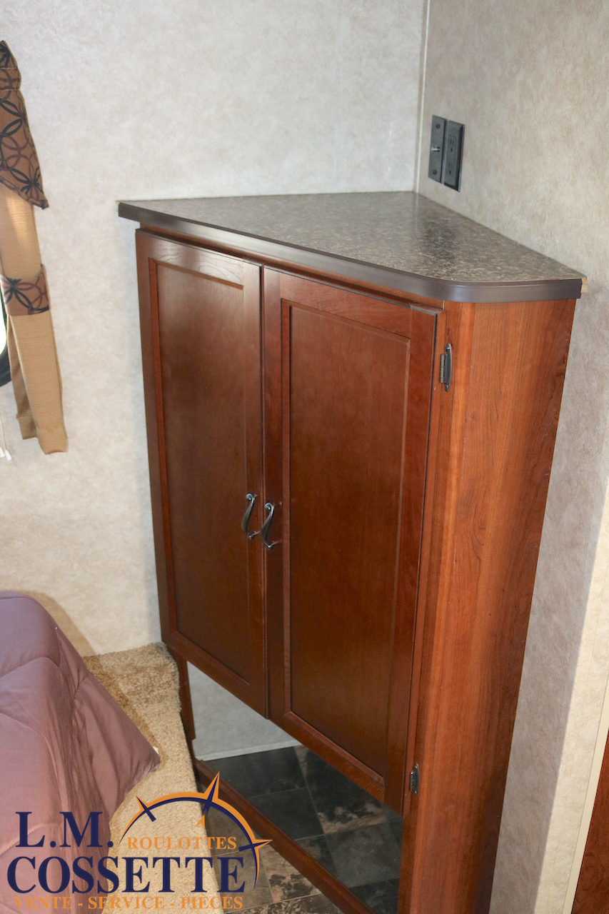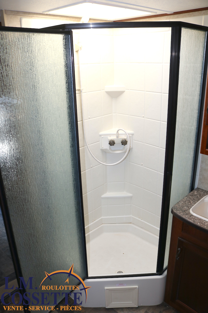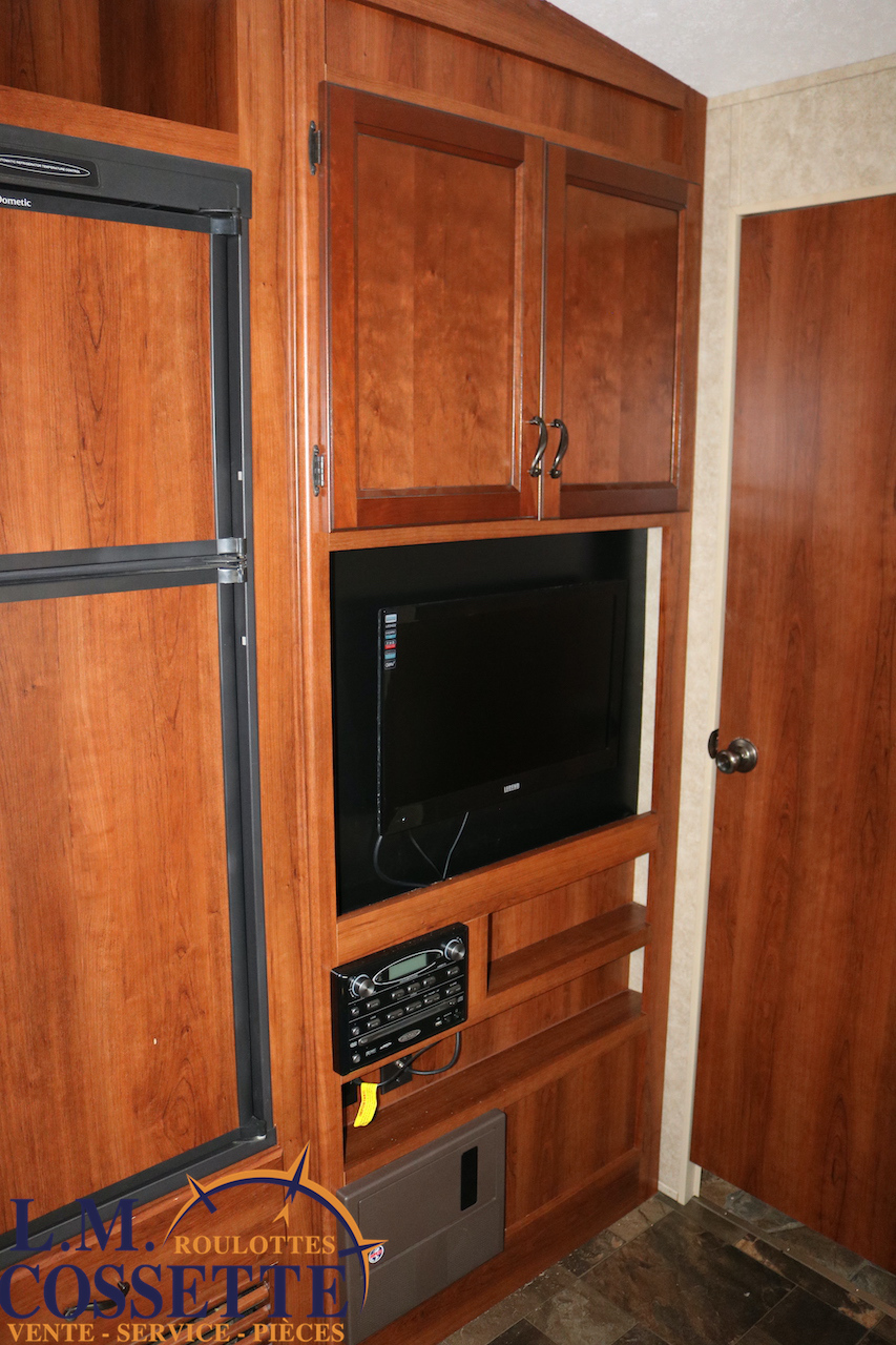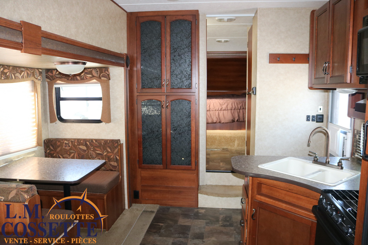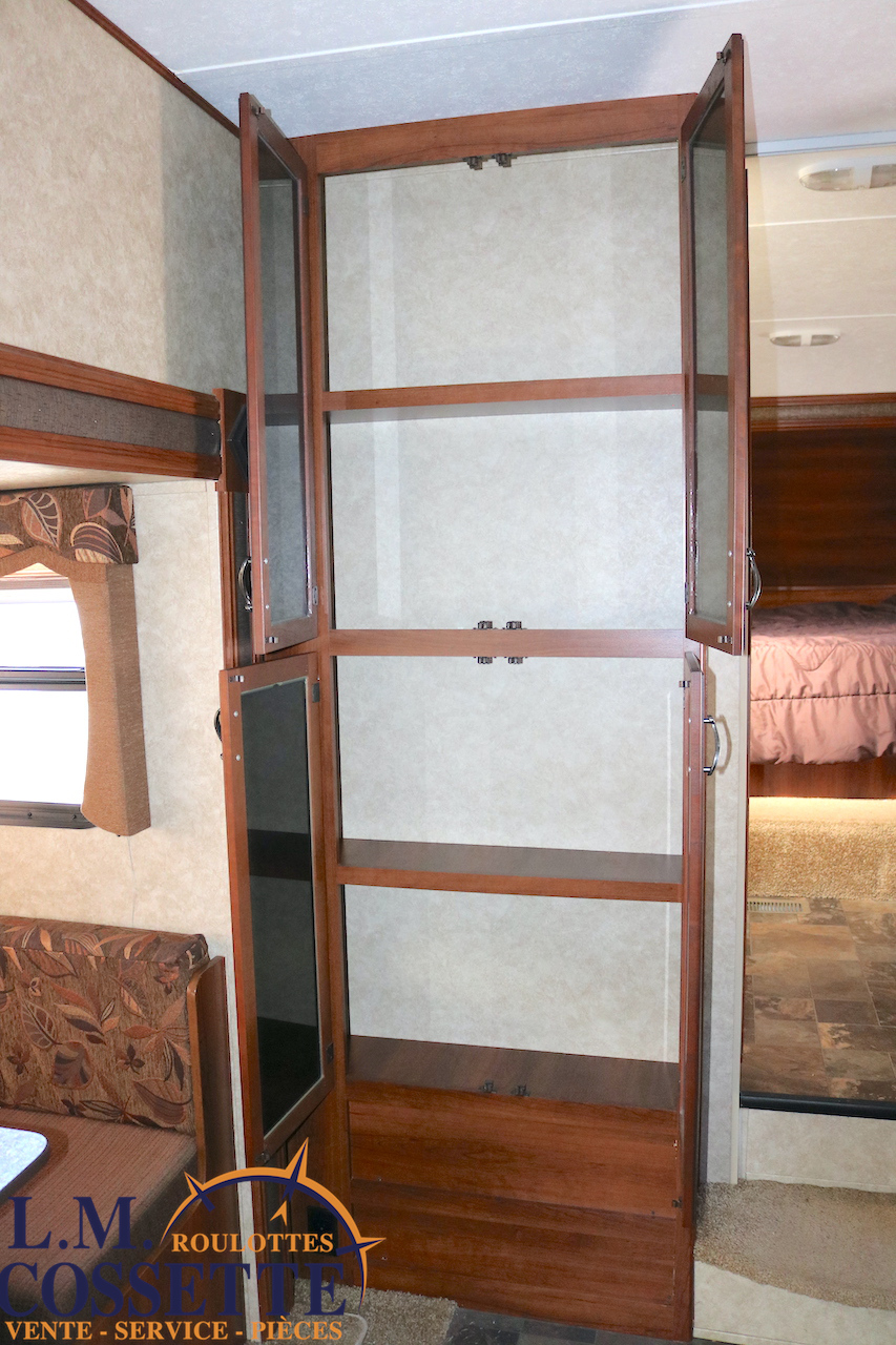 BELLE GRANDE FIFTH WHEEL AVEC CHAMBRE FERMÉ POUR LES ENFANTS !!! La chambre d’enfants comprend deux petits lits , ainsi que deux fauteuils cube pouvant se déplier pour y coucher deux autres enfants ! Le meuble télé est installé face au divan . Elle possède beaucoup d’armoires , de tiroirs et garde-robe . Son coffre extérieur est immense . Elle est équipé , de plus , d’une grande cuisine extérieure comprenant un frigo 110 volts , un évier et un petit poêle ! Venez la voir , vous tomberez sous le charme de cette belle fifth wheel ! Vous pouvez nous rejoindre au (819)378-2491 .