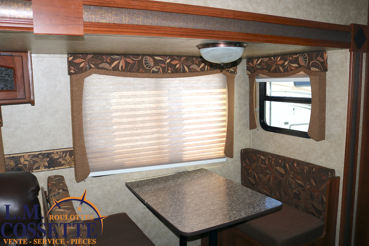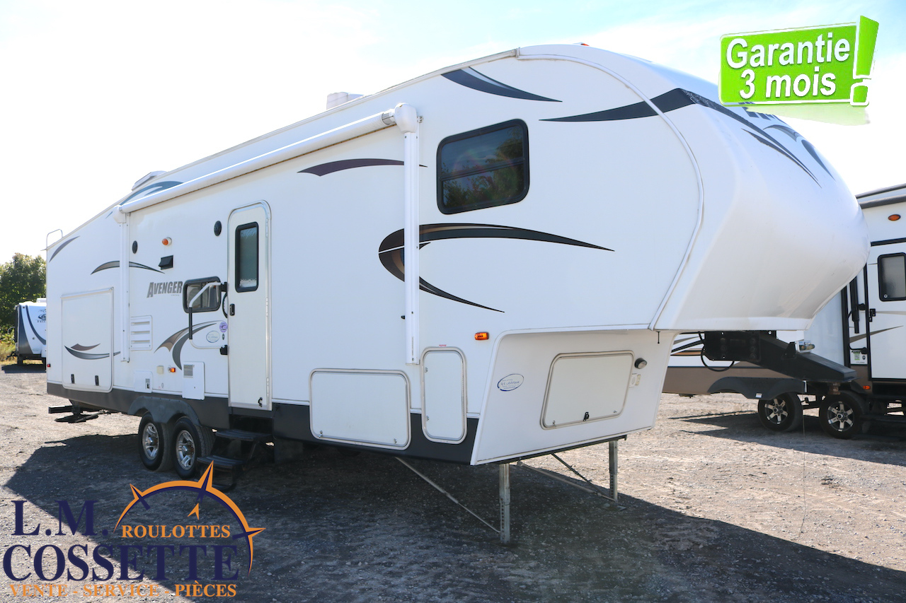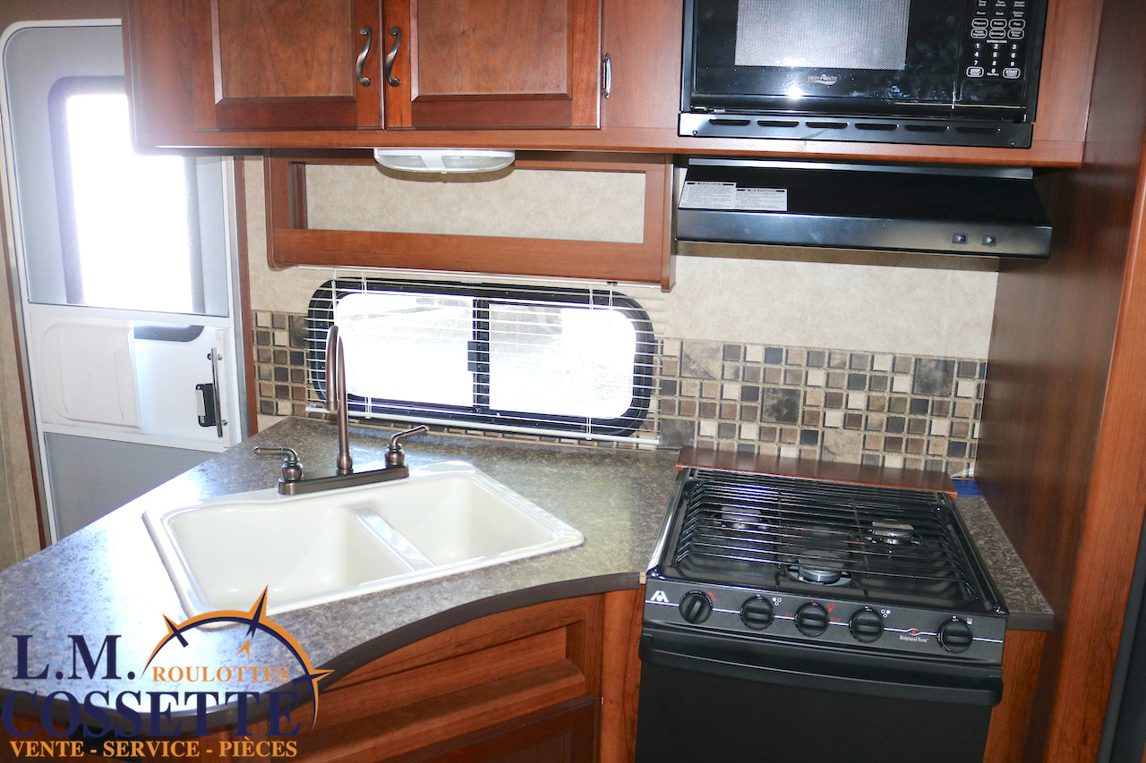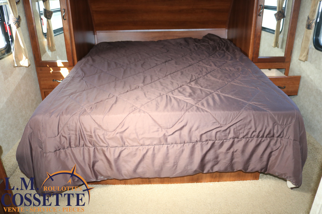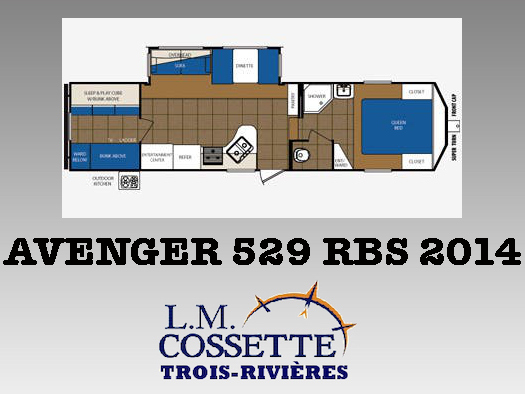 BELLE GRANDE FIFTH WHEEL AVEC CHAMBRE FERMÉ POUR LES ENFANTS !!! La chambre d’enfants comprend deux petits lits , ainsi que deux fauteuils cube pouvant se déplier pour y coucher deux autres enfants ! Le meuble télé est installé face au divan . Elle possède beaucoup d’armoires , de tiroirs et garde-robe . Son coffre extérieur est immense . Elle est équipé , de plus , d’une grande cuisine extérieure comprenant un frigo 110 volts , un évier et un petit poêle ! Venez la voir , vous tomberez sous le charme de cette belle fifth wheel ! Vous pouvez nous rejoindre au (819)378-2491 .