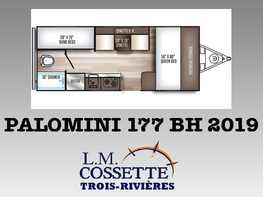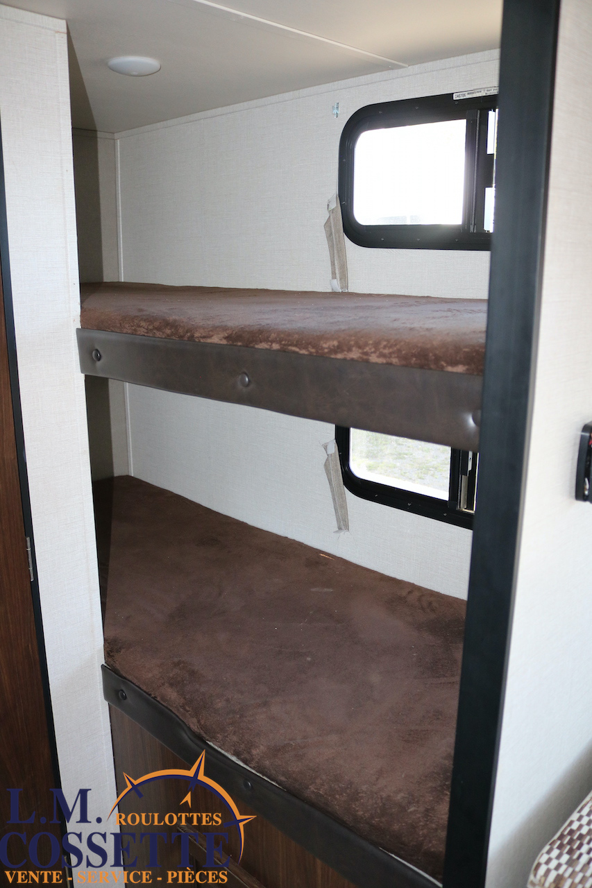 ADORABLE PETITE ROULOTTE AVEC LITS SUPERPOSÉS !!! Elle possède plusieurs armoires en hauteur , ainsi qu’un pratique meuble tout juste à côté de la porte d’entrée . Ses boiseries sont luxueuses ! Elle possède , de plus , un grand coffre extérieur qui fait la largeur de la roulotte , et un autre à l’arrière , qui se trouve en-dessous du lit d’enfant ! Elle est idéale pour la famille désirant une petite roulotte pouvant être remorqué par un petit VUS , car elle ne pèse que 2814 lbs ! Venez la voir , vous allez l’adorer ! Vous pouvez nous rejoindre au (819)378-2491 .