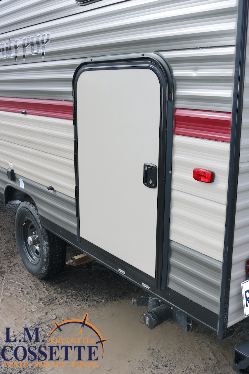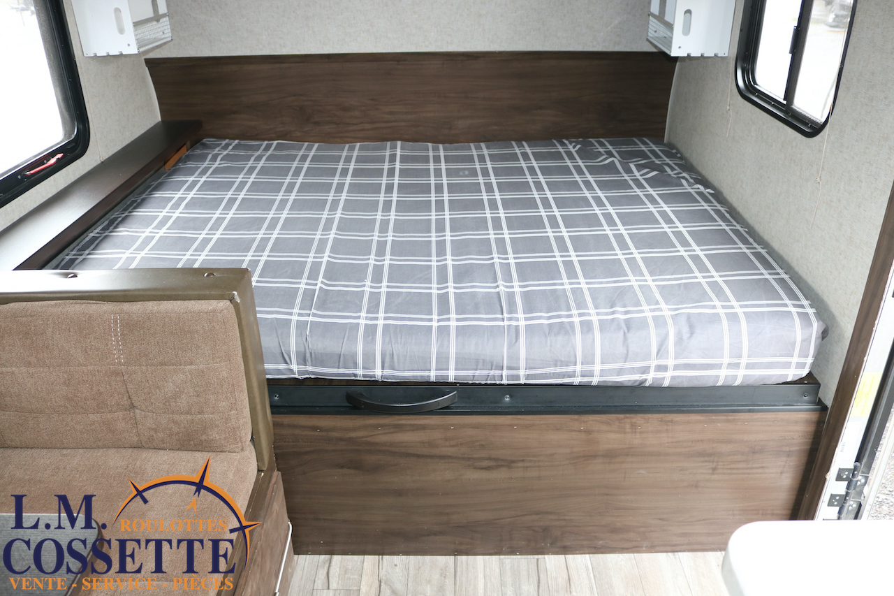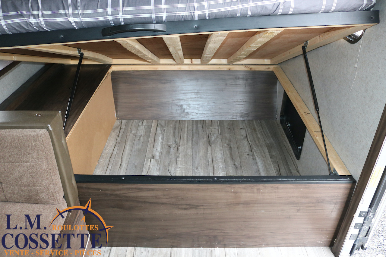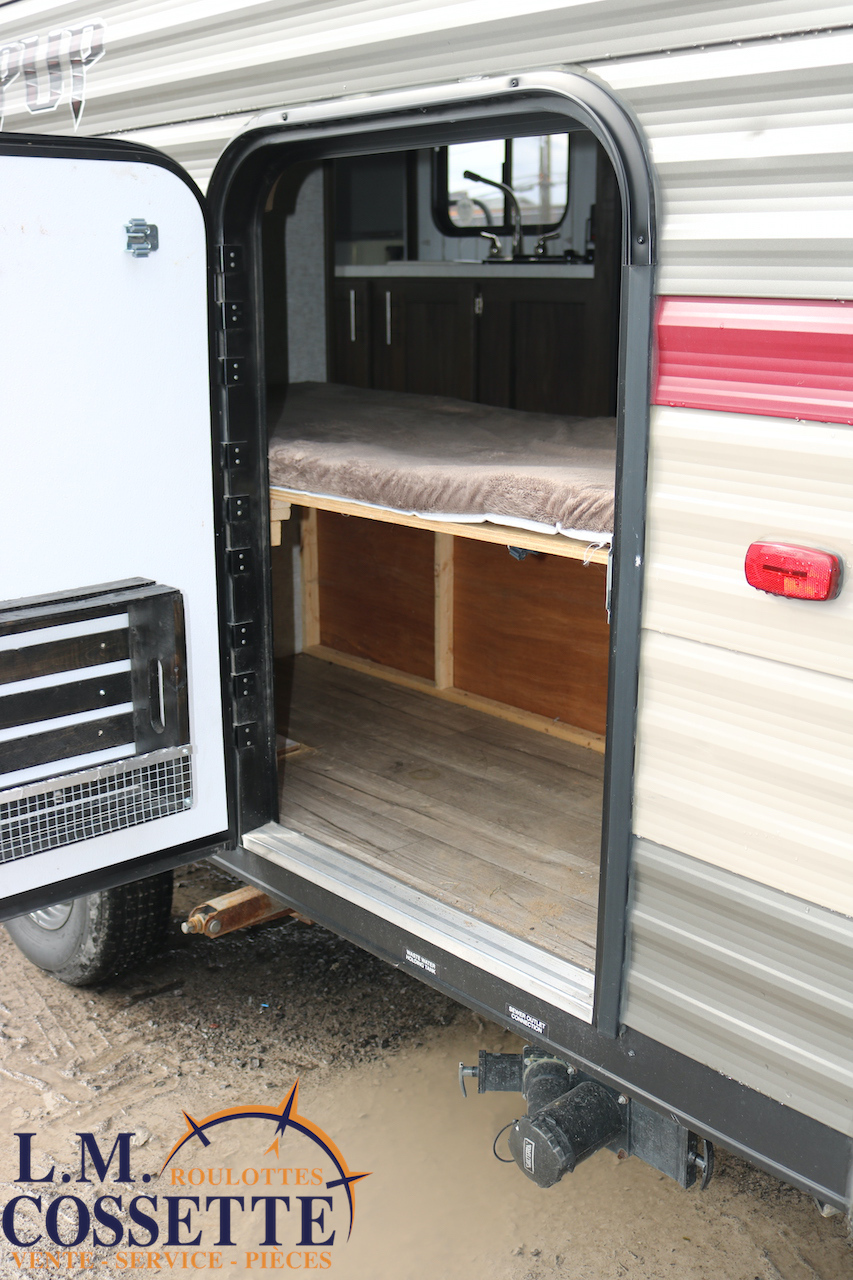 SPLENDIDE PETITE ROULOTTE FAMILIALE !!! Elle possède deux petit lits superposés , dont celui du bas qui peut se basculer pour y ranger de gros bagages par la porte qui est vis-à-vis ! À l’avant , le grand lit peut se lever pour avoir accès à un immense espace de rangement . Elle possède , de plus , un bel espace de travail sur le comptoir . Venez la voir , la multitude de rangement ajoutés , vous surprendra ! Vous pouvez nous rejoindre au (819)378-2491 .