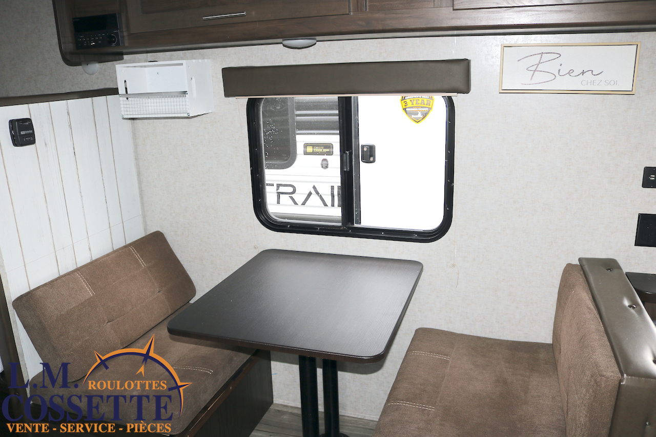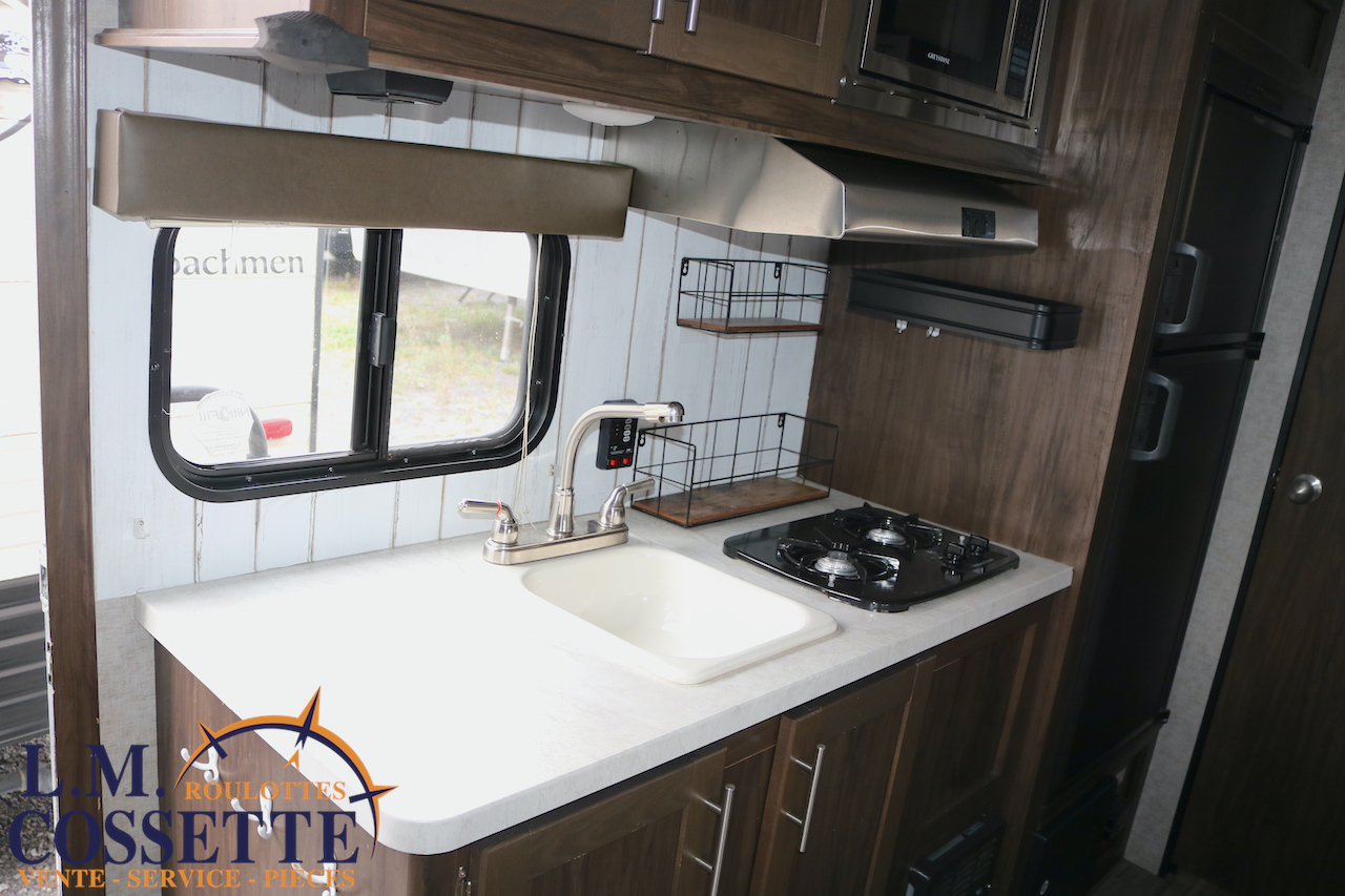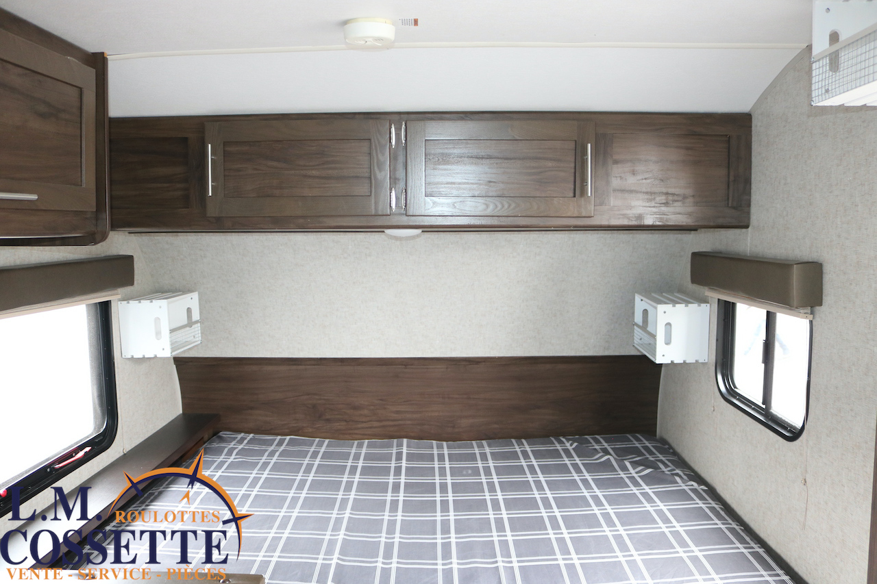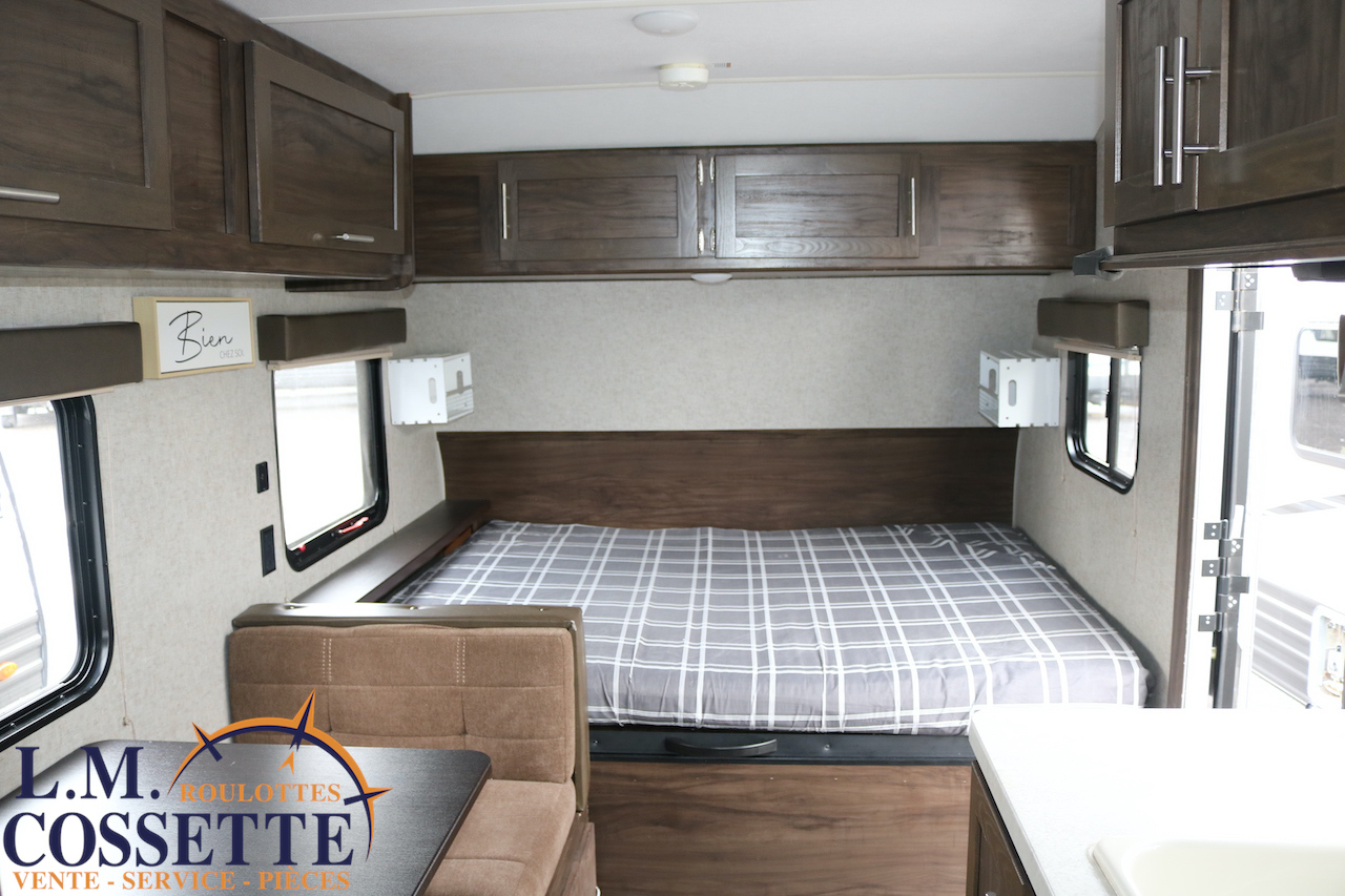 SPLENDIDE PETITE ROULOTTE FAMILIALE !!! Elle possède deux petit lits superposés , dont celui du bas qui peut se basculer pour y ranger de gros bagages par la porte qui est vis-à-vis ! À l’avant , le grand lit peut se lever pour avoir accès à un immense espace de rangement . Elle possède , de plus , un bel espace de travail sur le comptoir . Venez la voir , la multitude de rangement ajoutés , vous surprendra ! Vous pouvez nous rejoindre au (819)378-2491 .