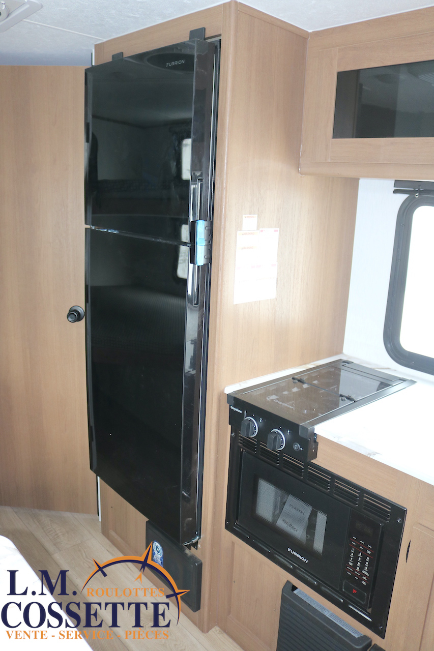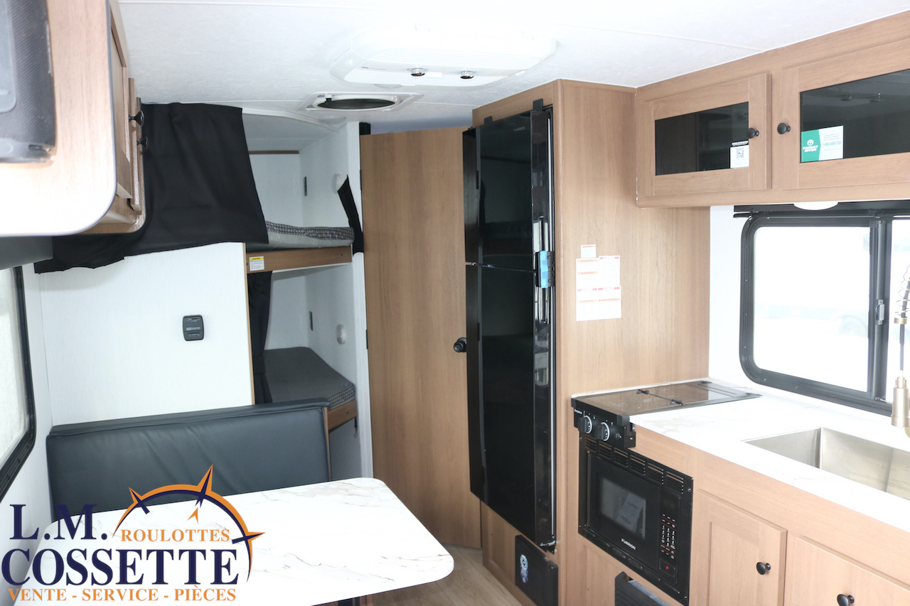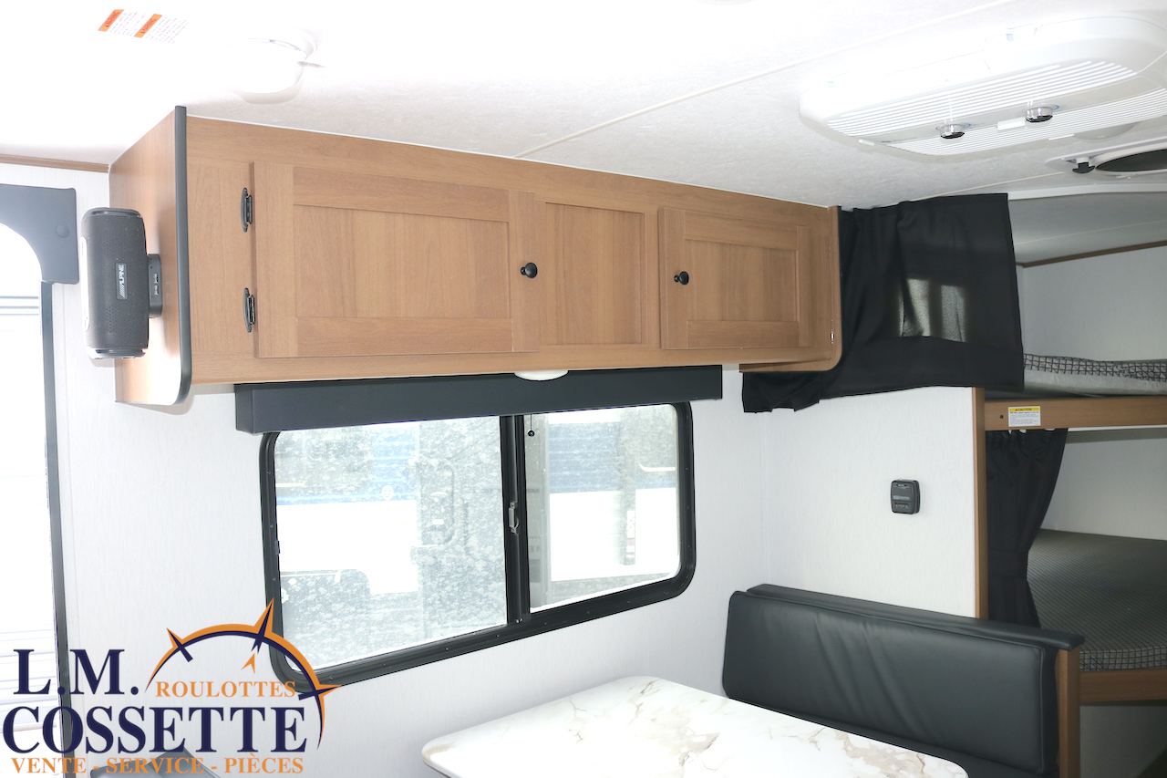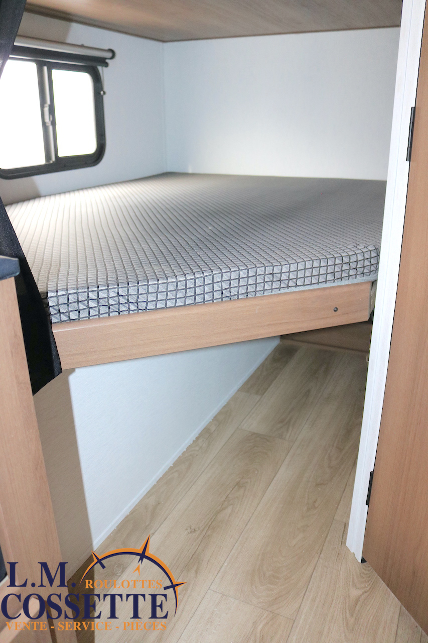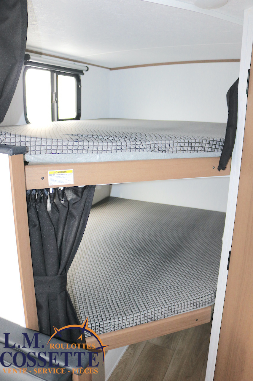SUBLIME PETITE ROULOTTE FAMILIALE !!! Elle possède deux lits double superposés , muni chacun d’une fenêtre ! Le comptoir comprend un beau plan de travail , un grand évier muni d’un couvert , ainsi que deux pratiques tiroirs . De grandes fenêtres dans la cuisine , permettent d’avoir un éclairage intérieur sensationnel . Il y a sous le lit à l’avant , un espace de rangement en levant le matelas . Elle est équipé , de plus , d’une petite cuisine extérieure muni d’un grill et d’un petit frigo 110 volts . Venez la voir , elle comblera toutes vos attentes ! Vous pouvez nous rejoindre au (819)378-2491 .