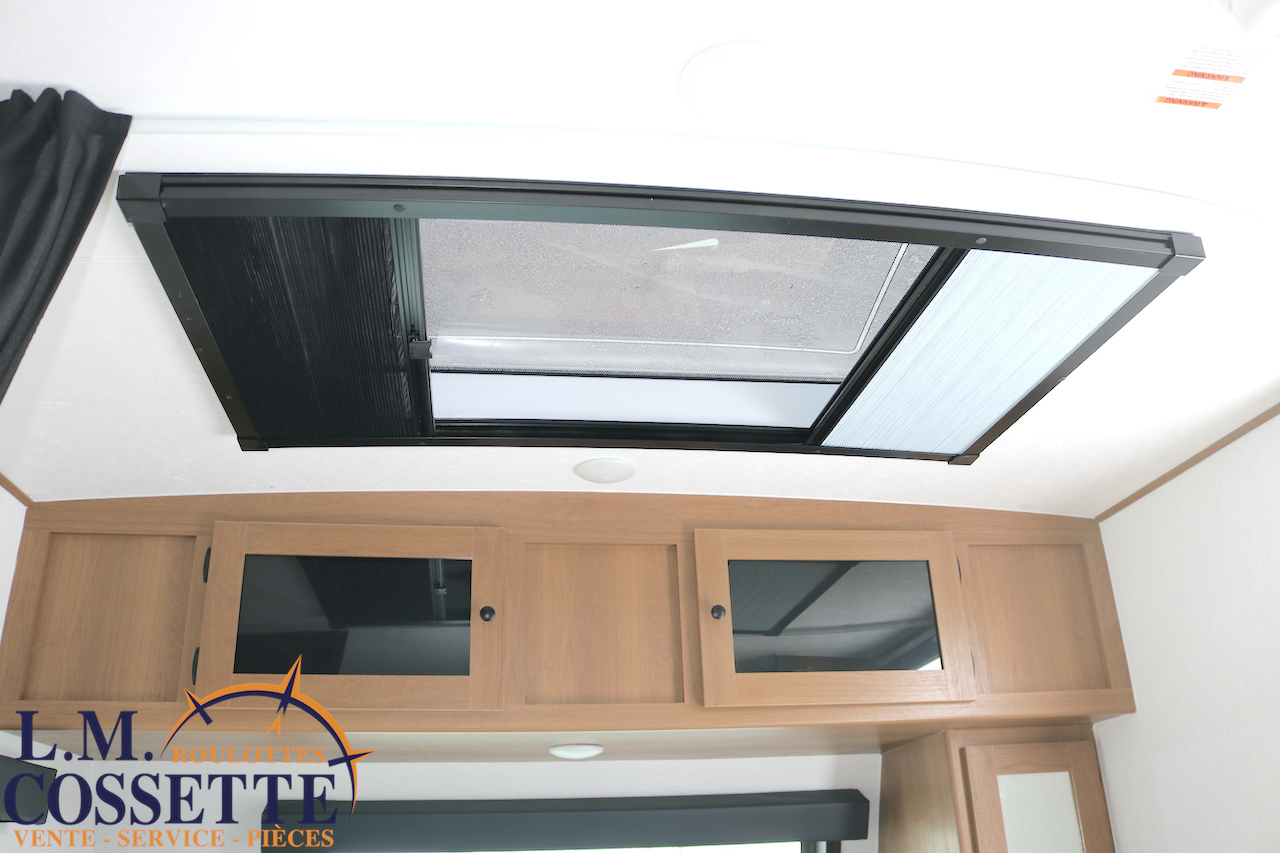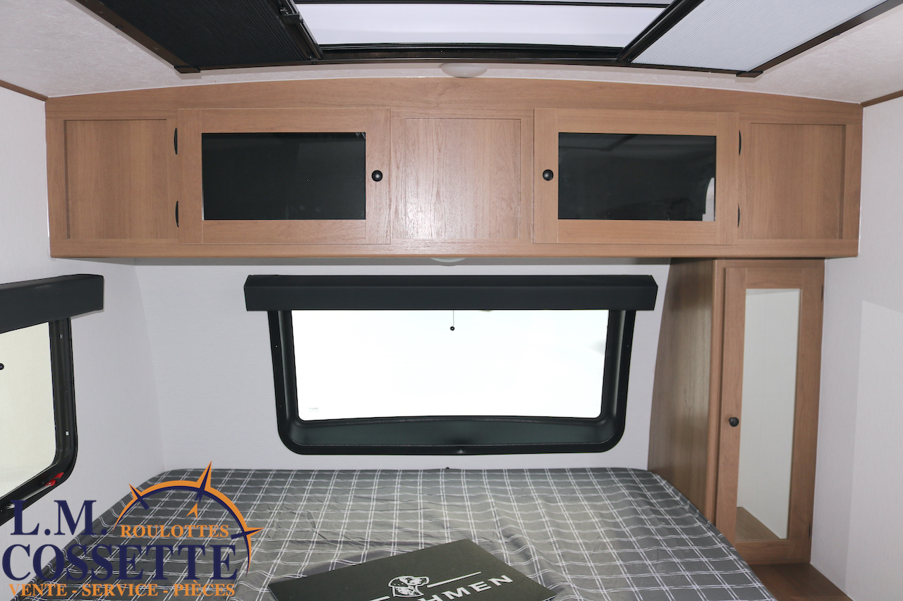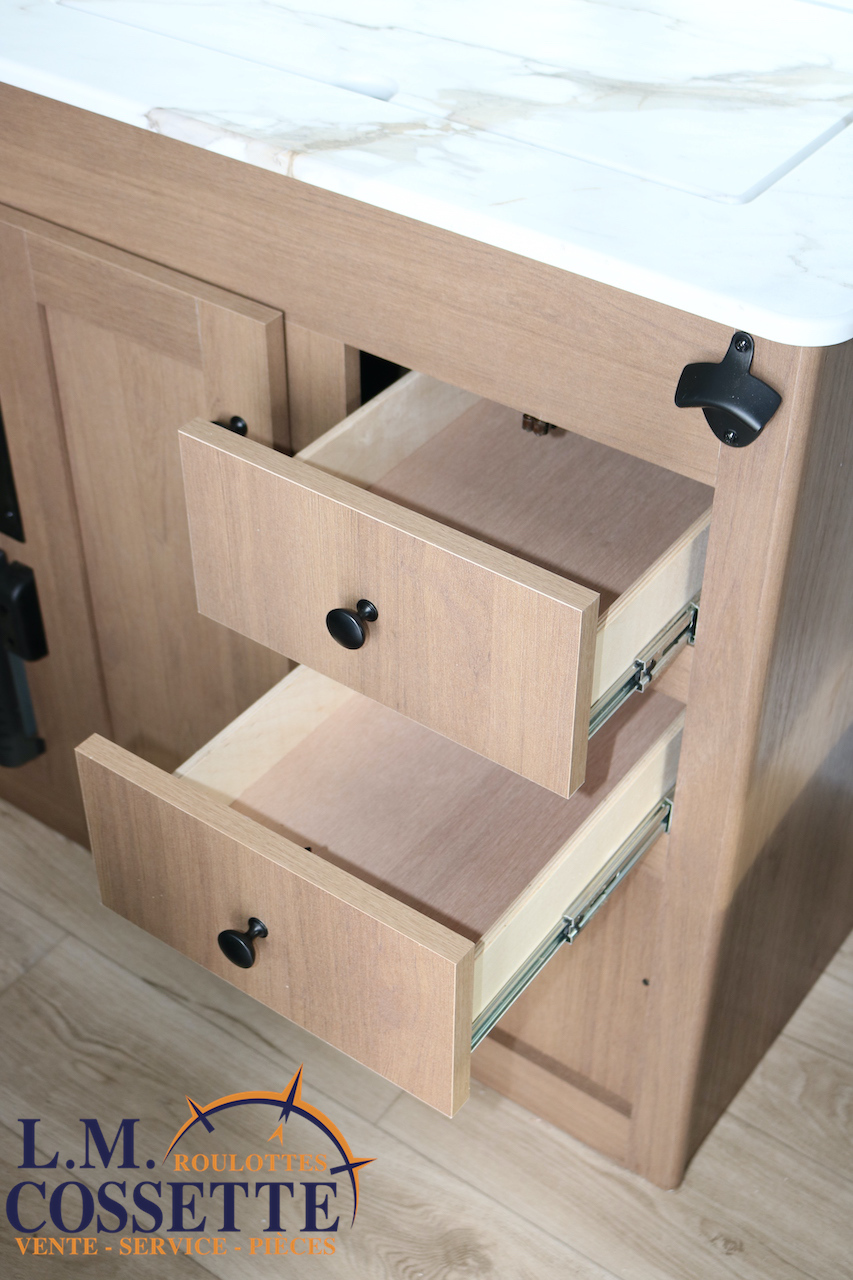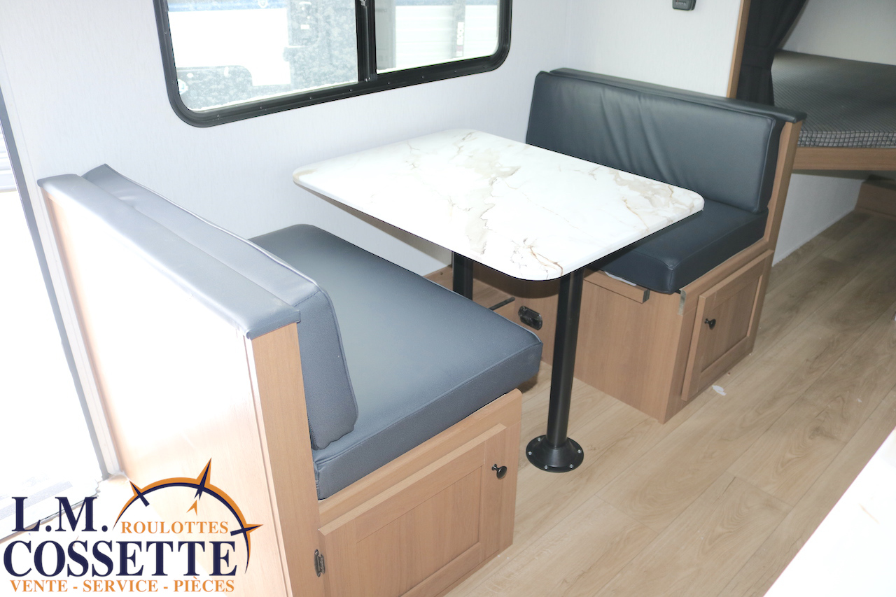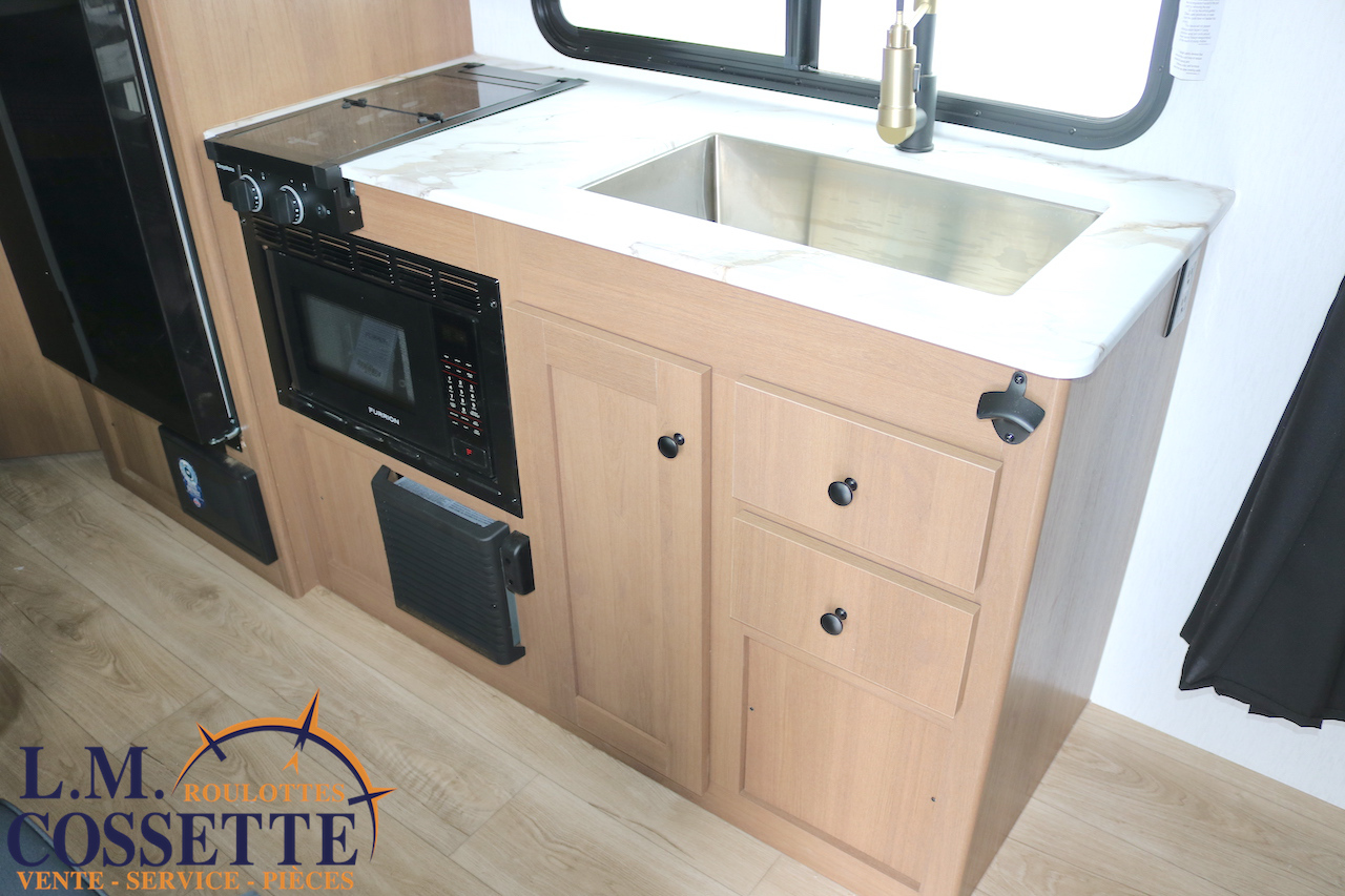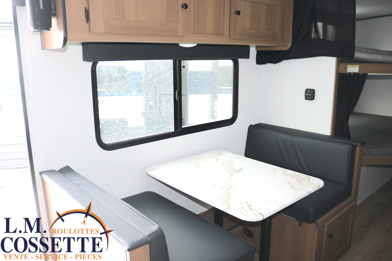 SUBLIME PETITE ROULOTTE FAMILIALE !!! Elle possède deux lits double superposés , muni chacun d’une fenêtre ! Le comptoir comprend un beau plan de travail , un grand évier muni d’un couvert , ainsi que deux pratiques tiroirs . De grandes fenêtres dans la cuisine , permettent d’avoir un éclairage intérieur sensationnel . Il y a sous le lit à l’avant , un espace de rangement en levant le matelas . Elle est équipé , de plus , d’une petite cuisine extérieure muni d’un grill et d’un petit frigo 110 volts . Venez la voir , elle comblera toutes vos attentes ! Vous pouvez nous rejoindre au (819)378-2491 .
