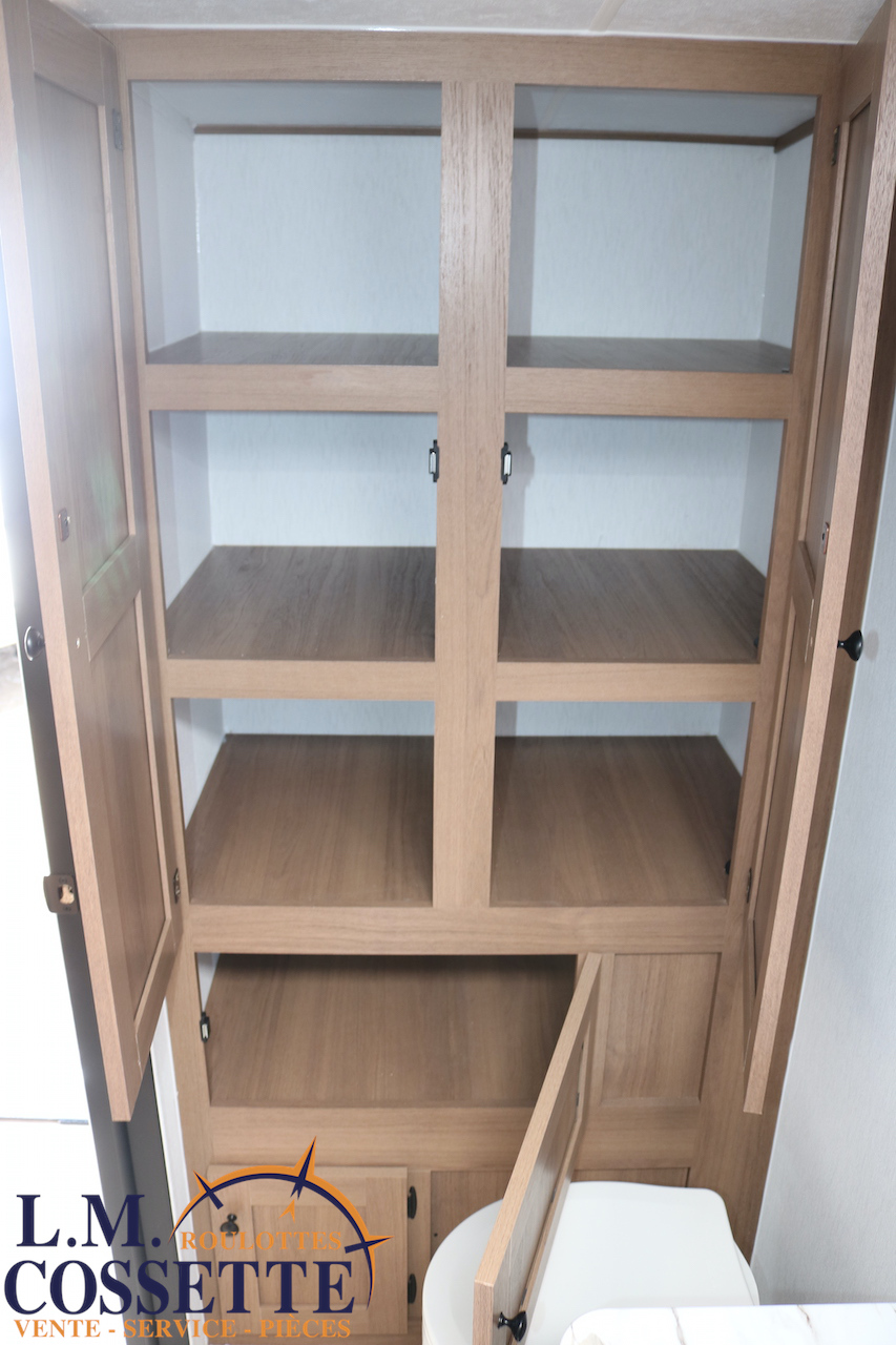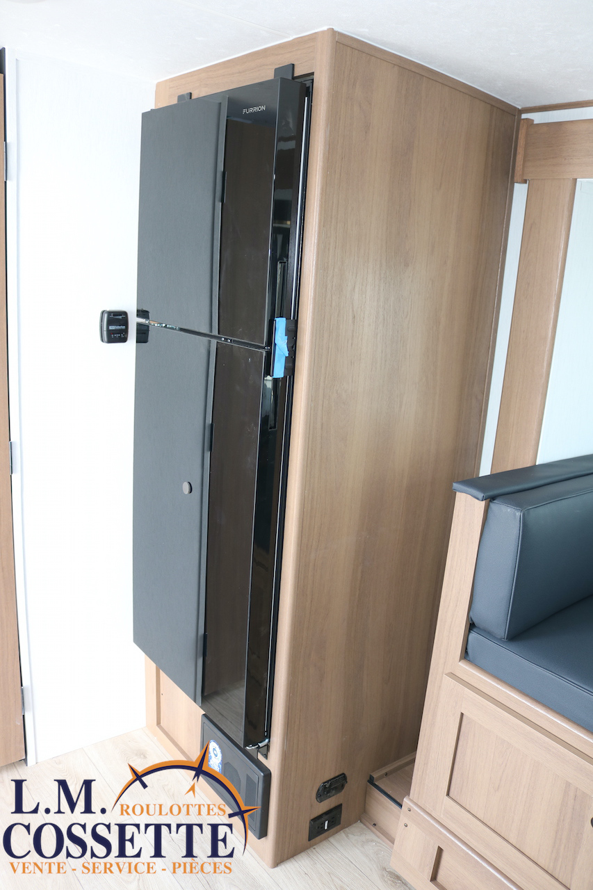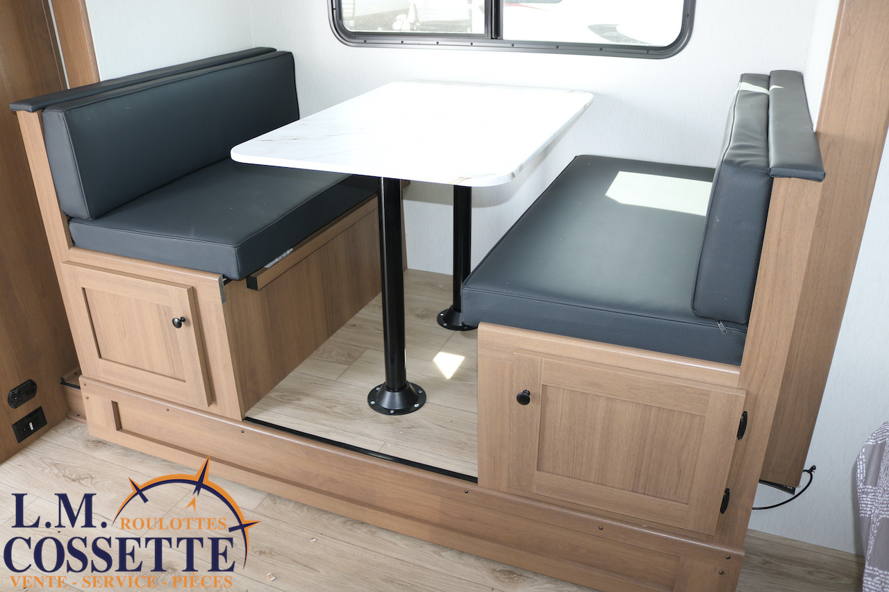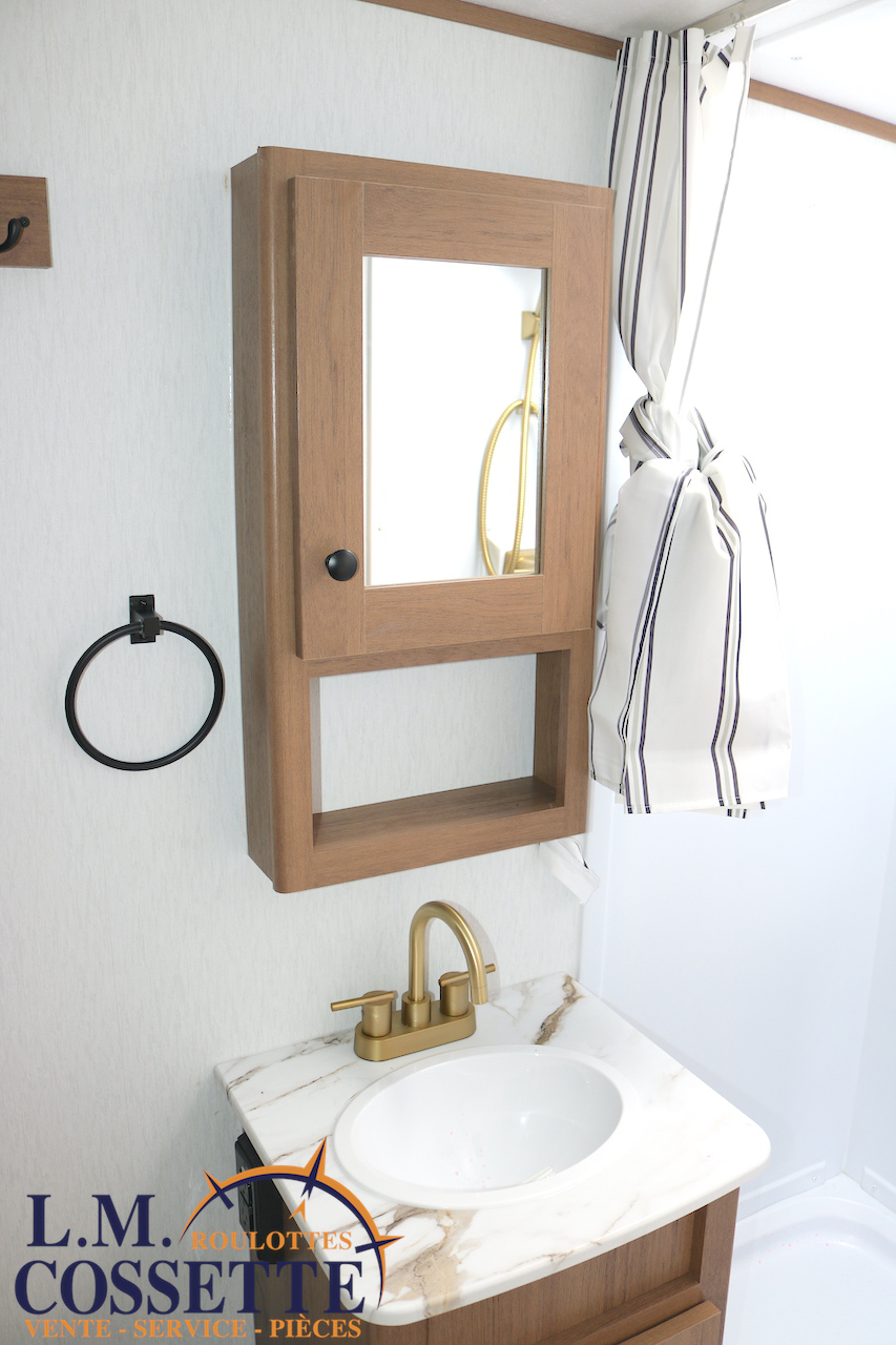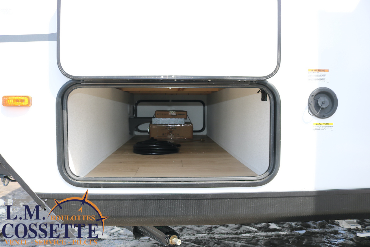 ÉPATANTE ROULOTTE POUR COUPLE !!! Son aménagement intérieur permet d’avoir un immense espace central , tout en ayant énormément d’espaces de rangement . Le comptoir est vaste et très fonctionnel , avec beaucoup d’armoires ainsi que 4 tiroirs . Son lit est accessible des deux côtés . La salle de bain est très bien aménagée , et pourvu d’une magnifique lingerie . Le coffre extérieur fait la largeur de la roulotte . Venez la voir , son côté lumineux vous ravira ! Vous pouvez nous rejoindre au (819)378-2491 .