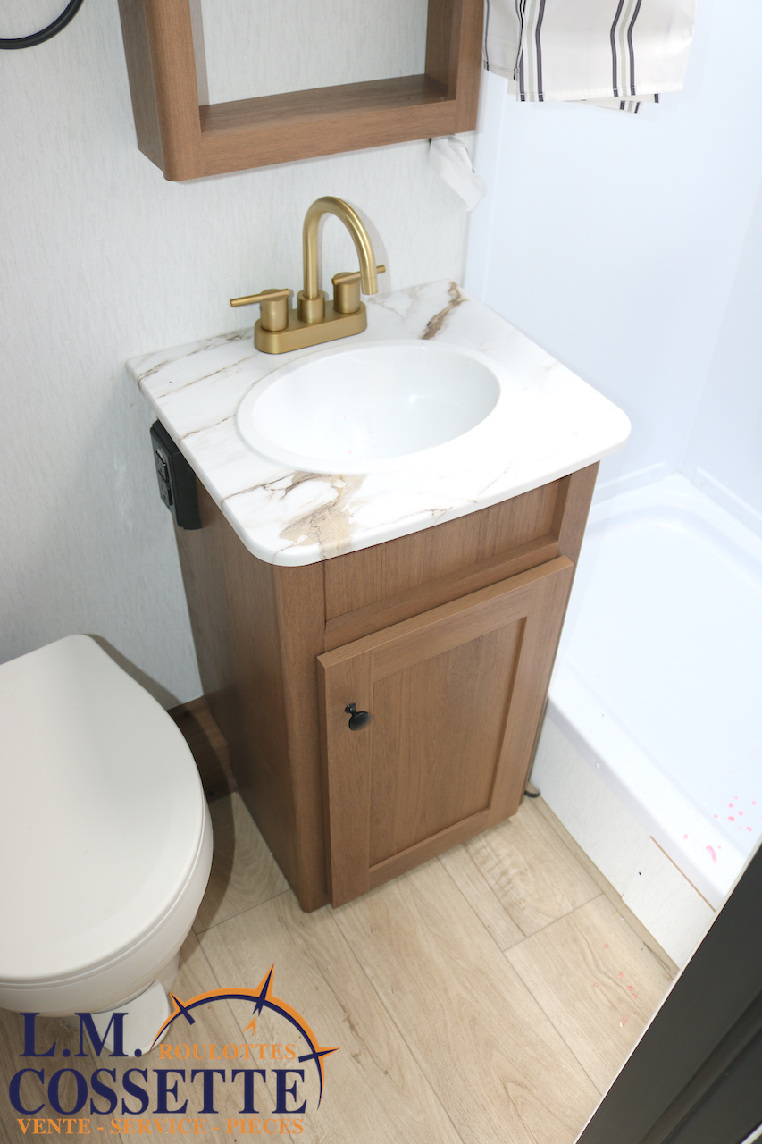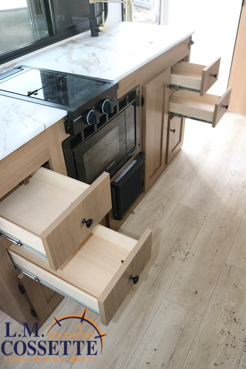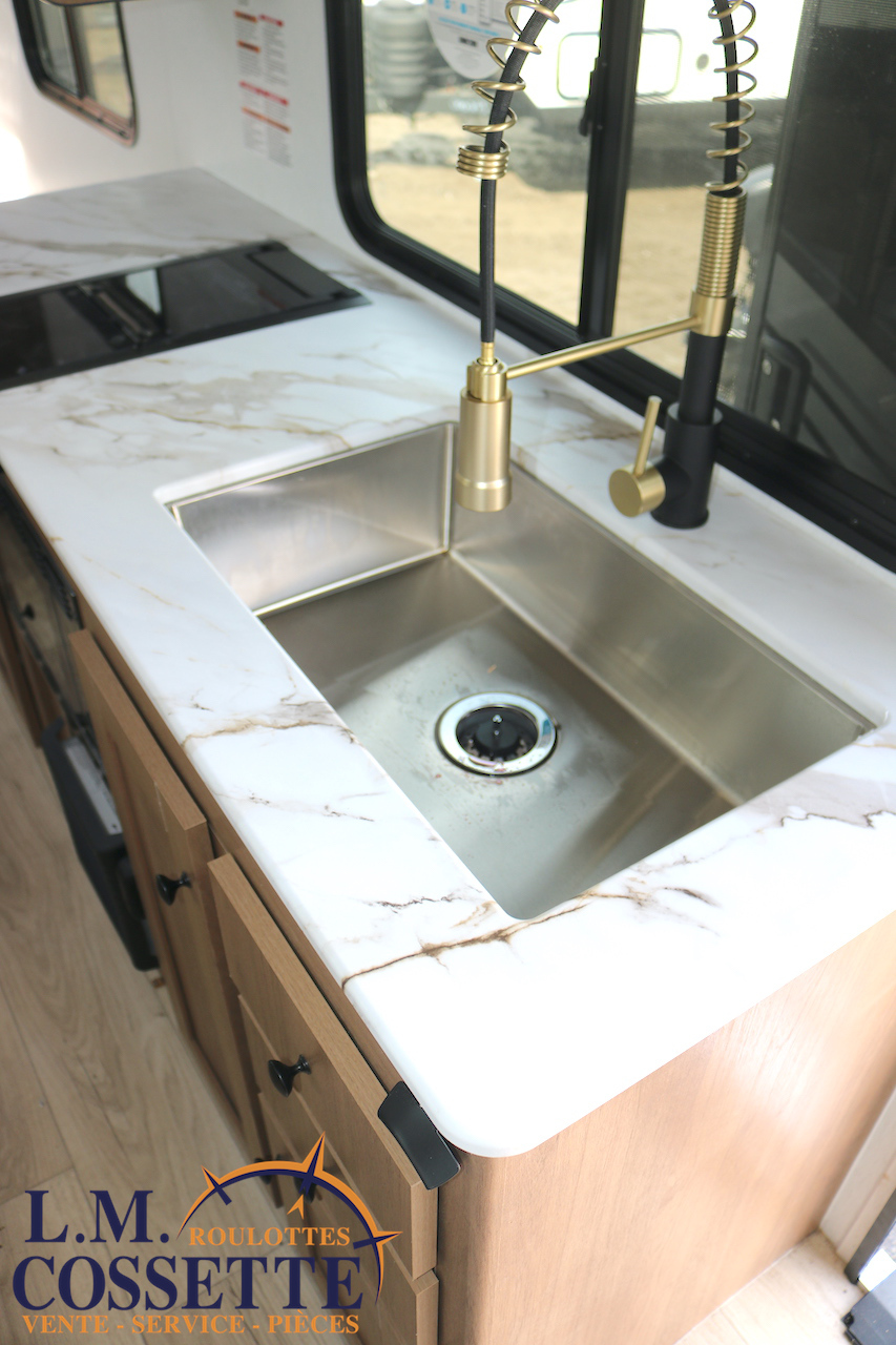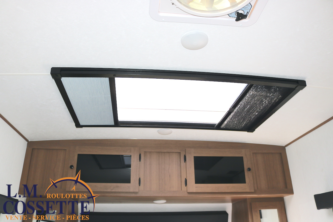 ÉPATANTE ROULOTTE POUR COUPLE !!! Son aménagement intérieur permet d’avoir un immense espace central , tout en ayant énormément d’espaces de rangement . Le comptoir est vaste et très fonctionnel , avec beaucoup d’armoires ainsi que 4 tiroirs . Son lit est accessible des deux côtés . La salle de bain est très bien aménagée , et pourvu d’une magnifique lingerie . Le coffre extérieur fait la largeur de la roulotte . Venez la voir , son côté lumineux vous ravira ! Vous pouvez nous rejoindre au (819)378-2491 .
