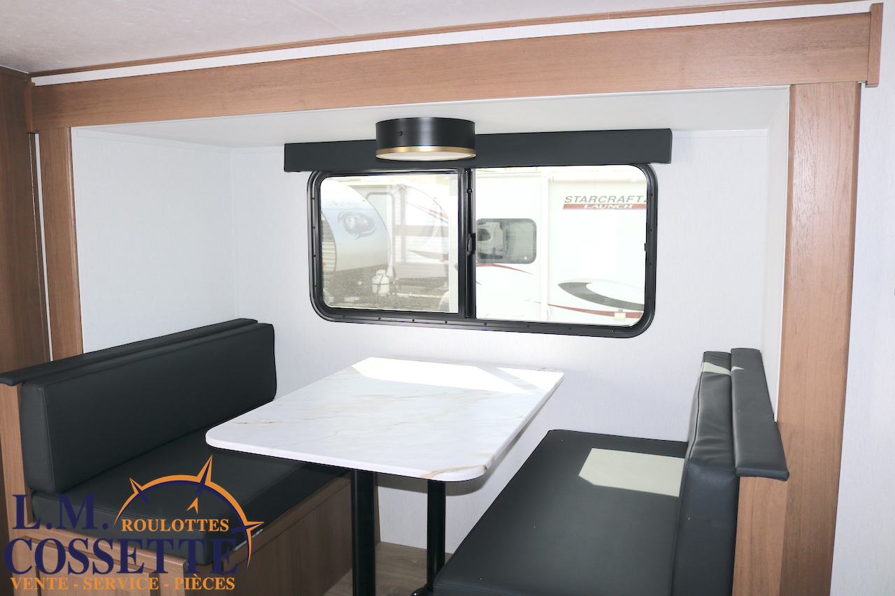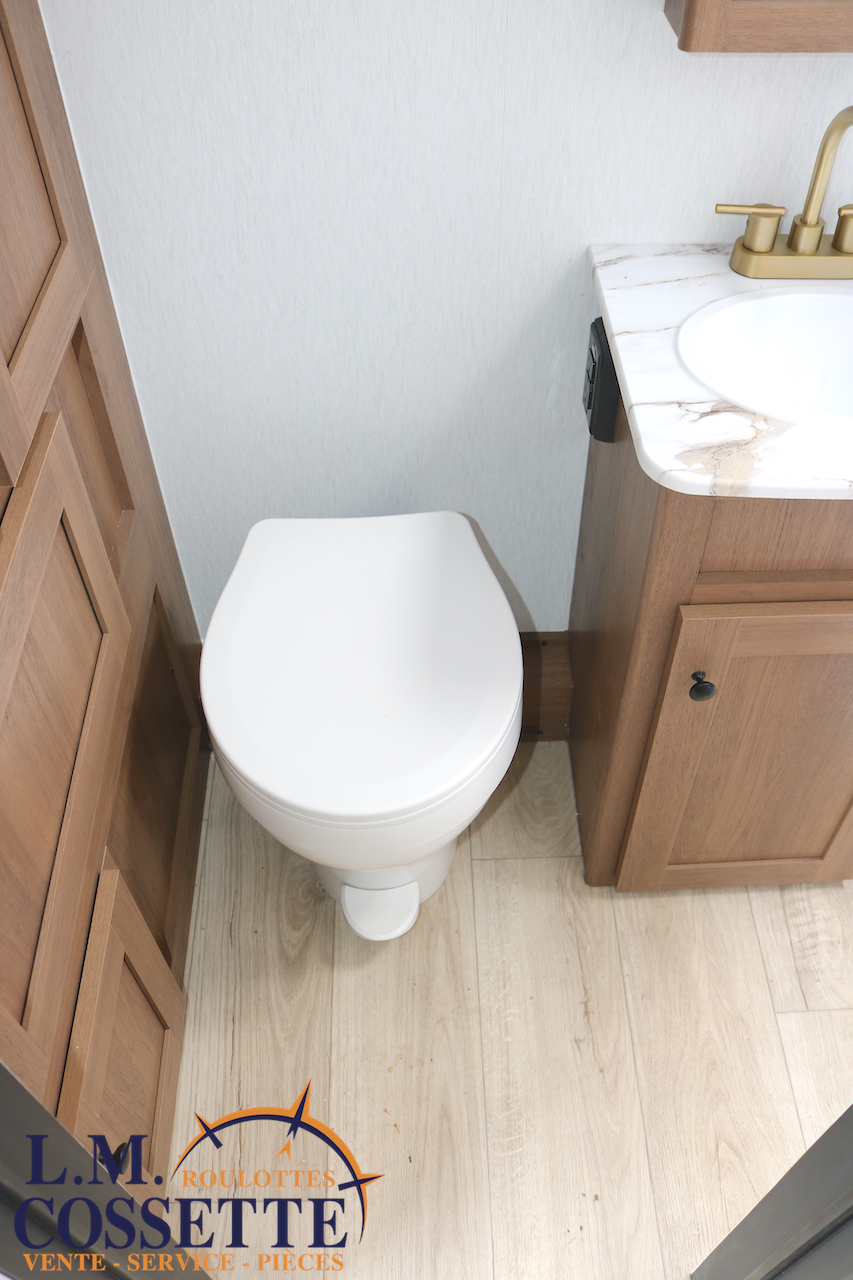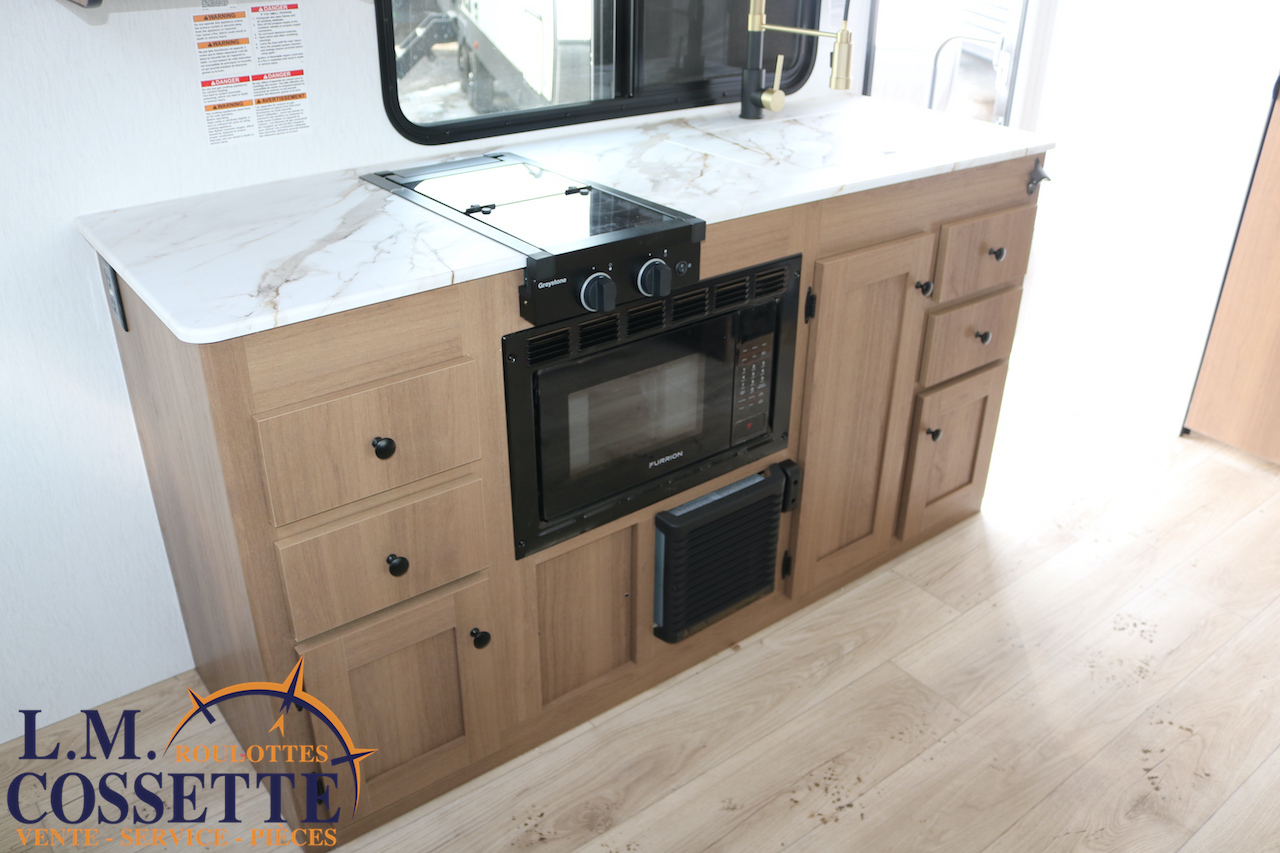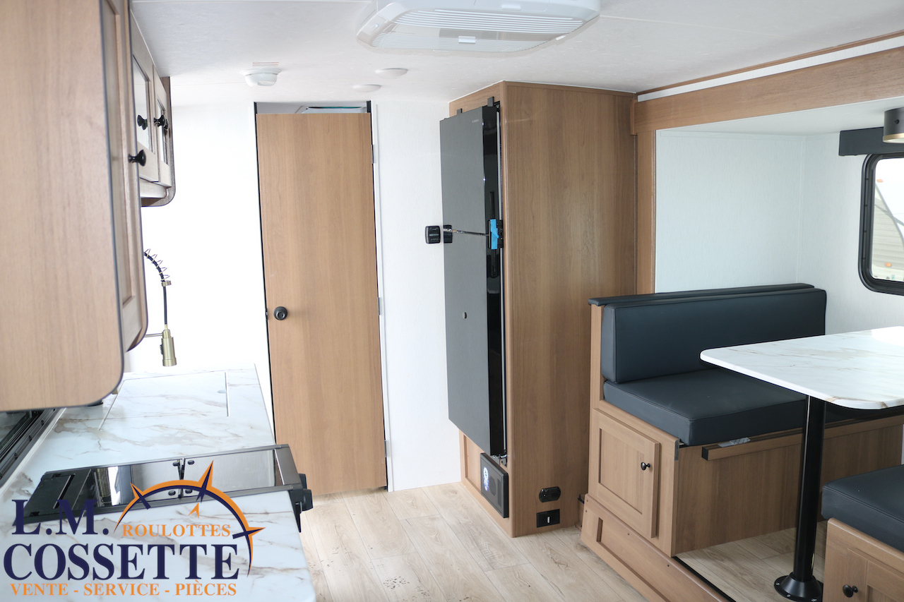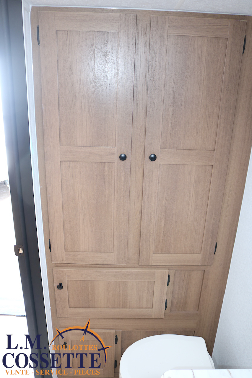 ÉPATANTE ROULOTTE POUR COUPLE !!! Son aménagement intérieur permet d’avoir un immense espace central , tout en ayant énormément d’espaces de rangement . Le comptoir est vaste et très fonctionnel , avec beaucoup d’armoires ainsi que 4 tiroirs . Son lit est accessible des deux côtés . La salle de bain est très bien aménagée , et pourvu d’une magnifique lingerie . Le coffre extérieur fait la largeur de la roulotte . Venez la voir , son côté lumineux vous ravira ! Vous pouvez nous rejoindre au (819)378-2491 .