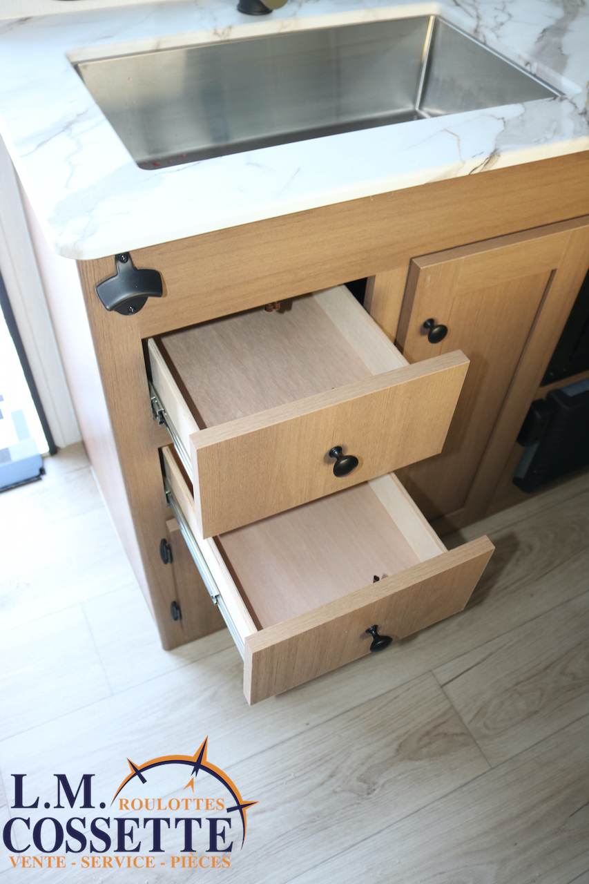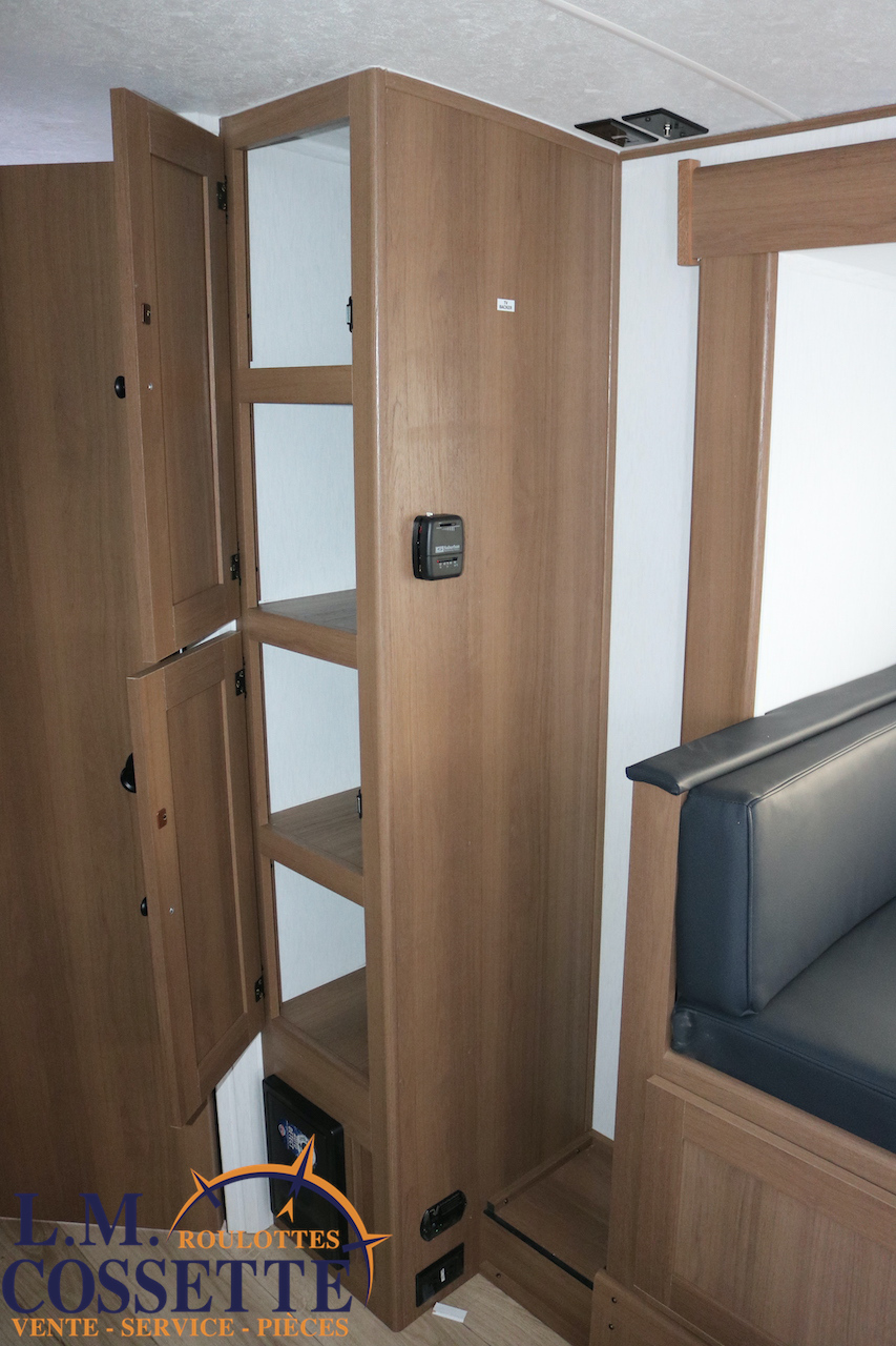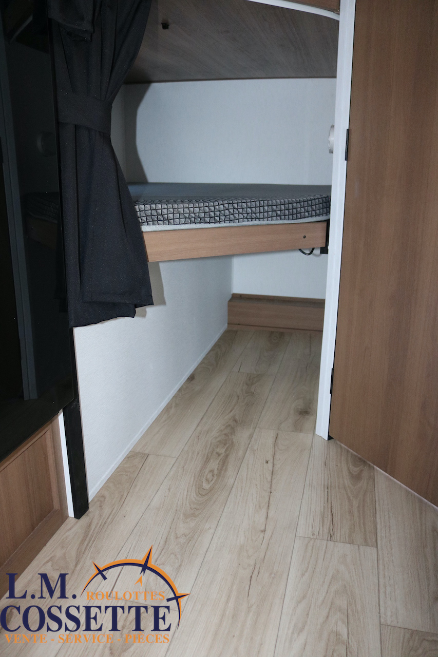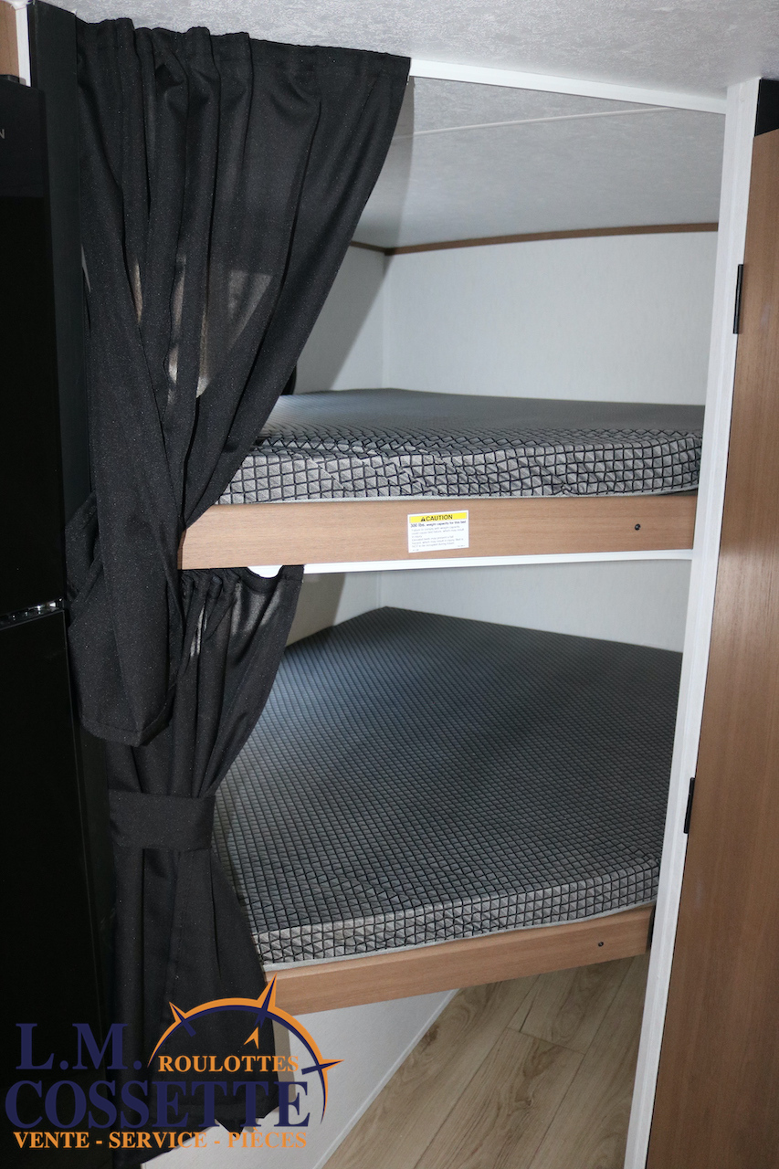 SPLENDIDE ROULOTTE FAMILIALE !!! Elle possède deux lits double superposés , avec un grand espace de rangement en-dessous ! Il y a un bel espace de travail sur le comptoir , une grand évier et deux tiroirs pour les ustensiles . Un pratique garde-manger est situé tout juste en face du réfrigérateur . Son coffre extérieur fait la largeur de la roulotte . Elle est , de plus , équipé d’une petite cuisine extérieure muni d’un petit réfrigérateur , ainsi qu’un petit grill ! Venez la voir , vous serez étonné par tout ses avantages . Vous pouvez nous rejoindre au (819)378-2491 .
