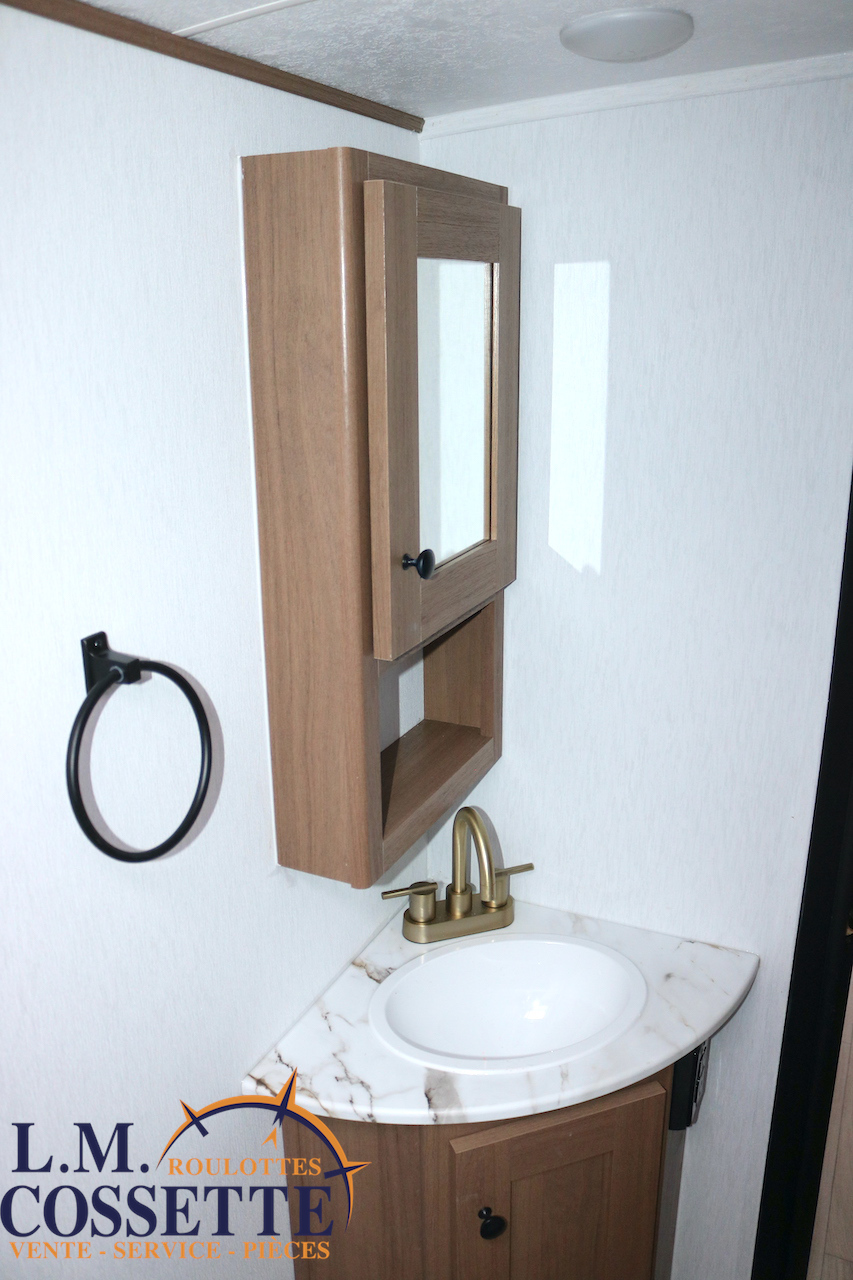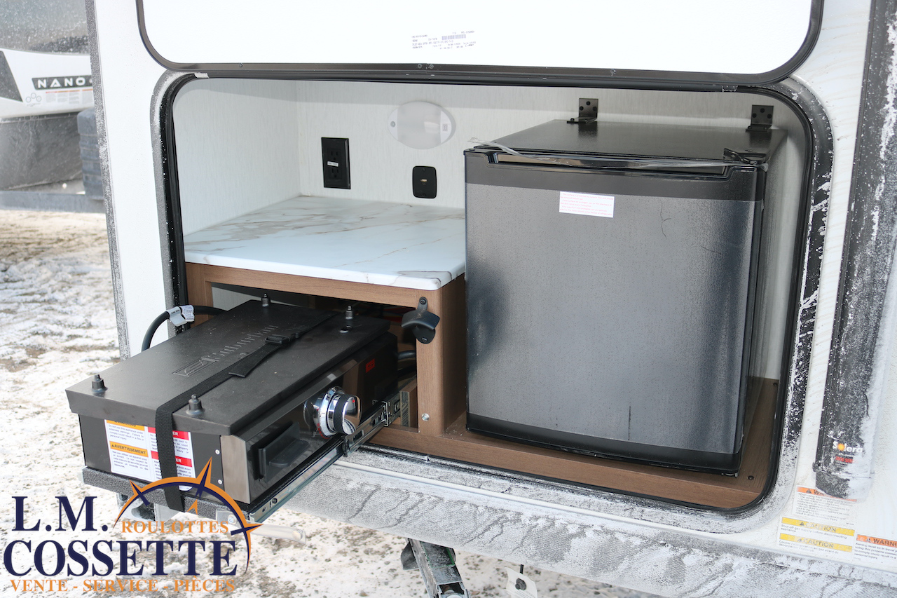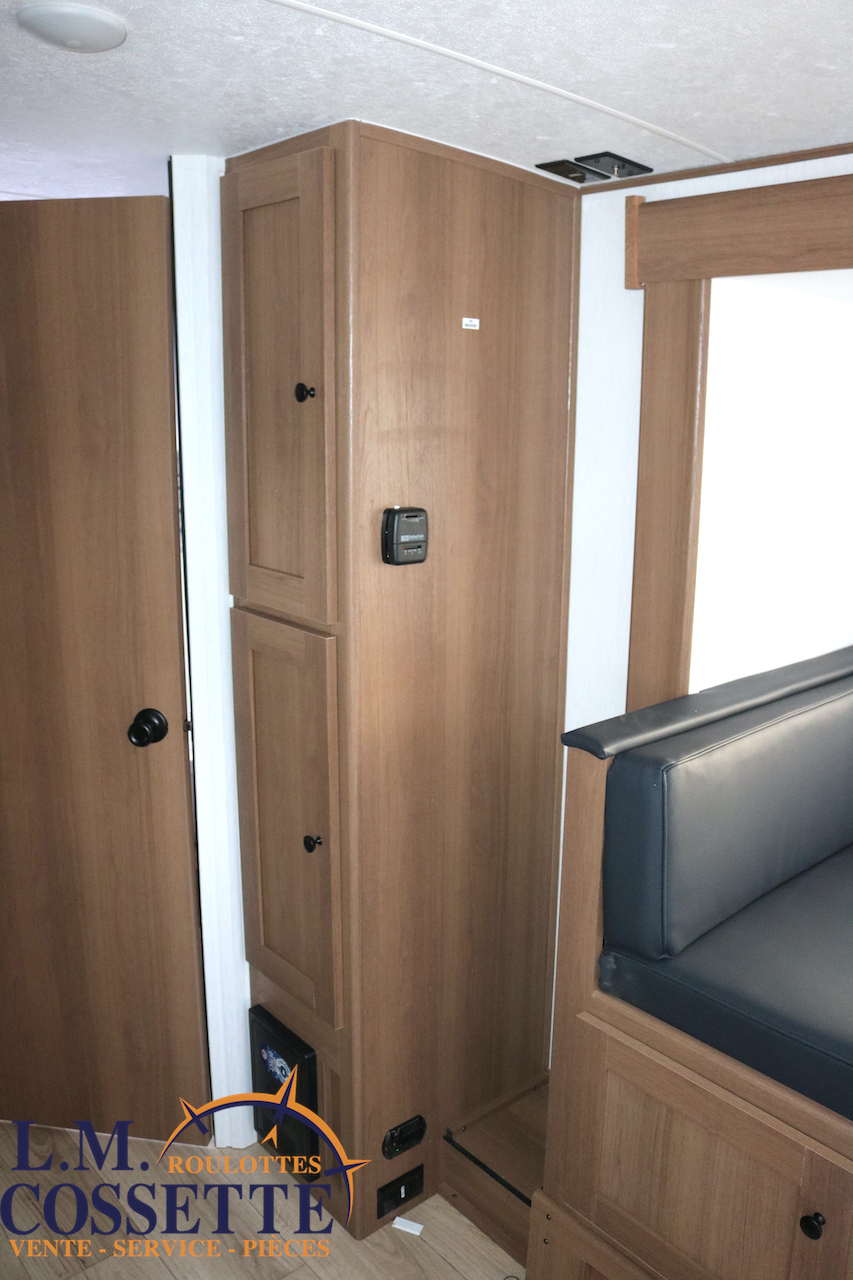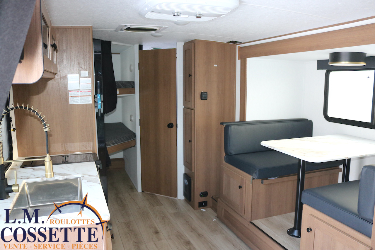SPLENDIDE ROULOTTE FAMILIALE !!! Elle possède deux lits double superposés , avec un grand espace de rangement en-dessous ! Il y a un bel espace de travail sur le comptoir , une grand évier et deux tiroirs pour les ustensiles . Un pratique garde-manger est situé tout juste en face du réfrigérateur . Son coffre extérieur fait la largeur de la roulotte . Elle est , de plus , équipé d’une petite cuisine extérieure muni d’un petit réfrigérateur , ainsi qu’un petit grill ! Venez la voir , vous serez étonné par tout ses avantages . Vous pouvez nous rejoindre au (819)378-2491 .