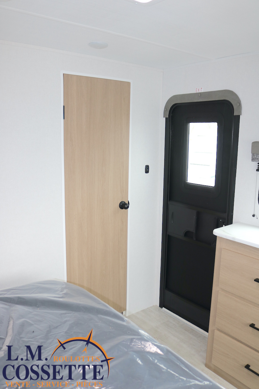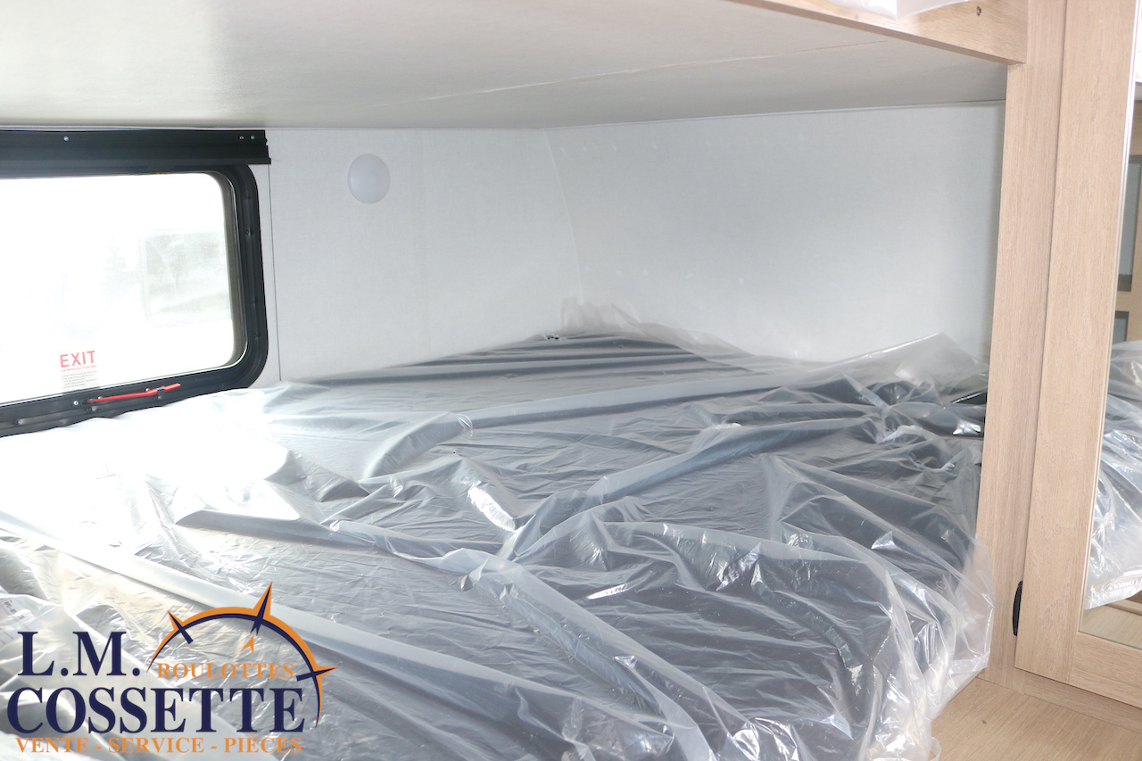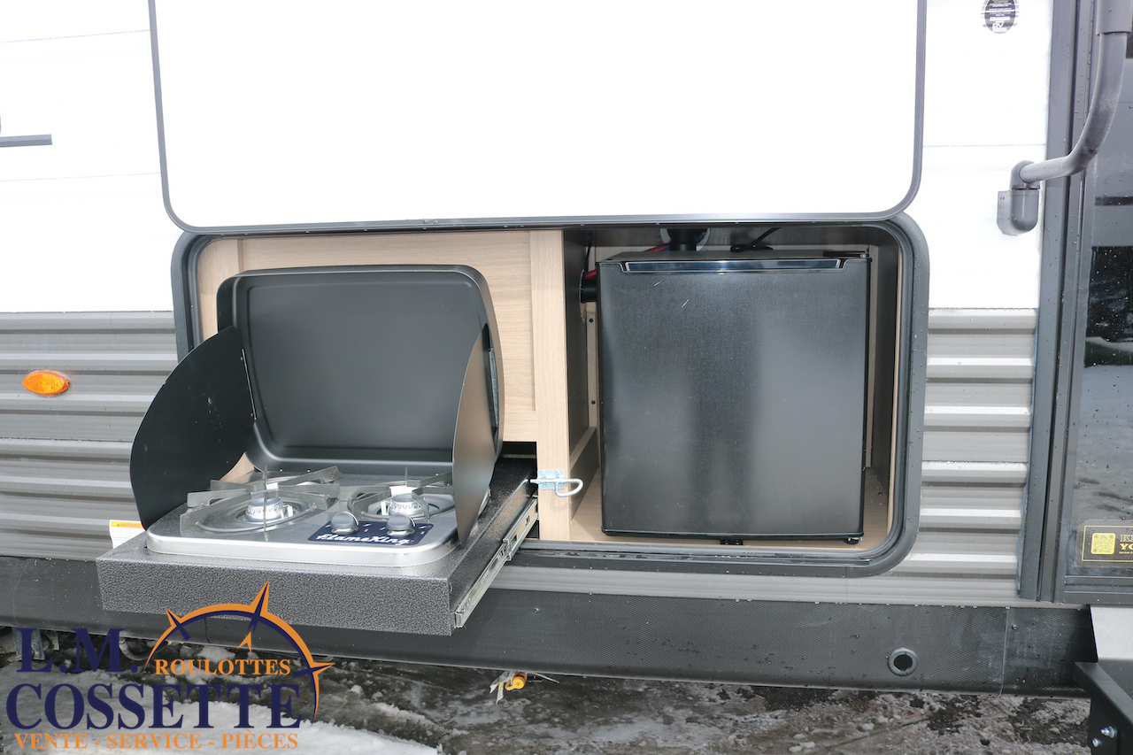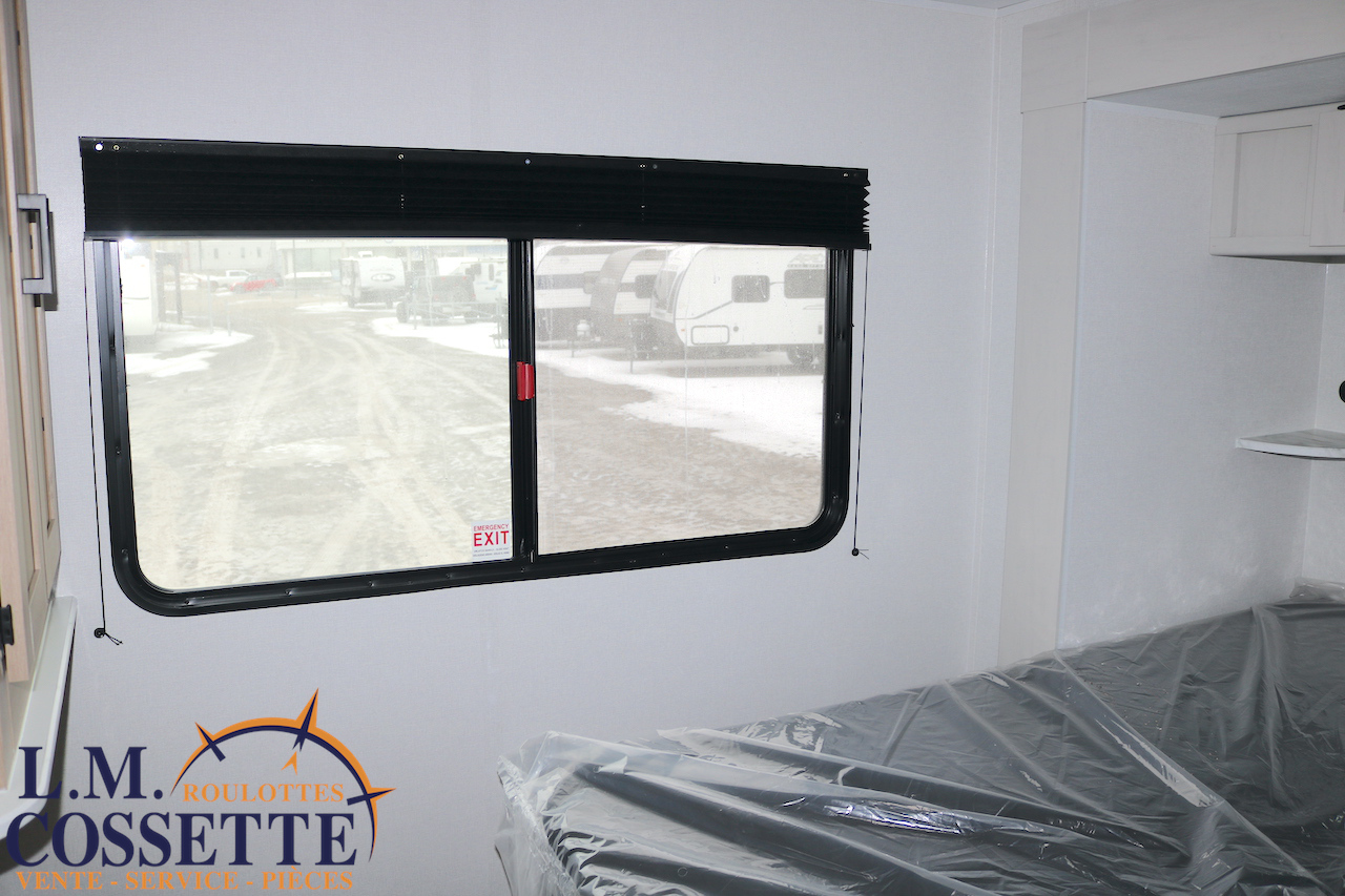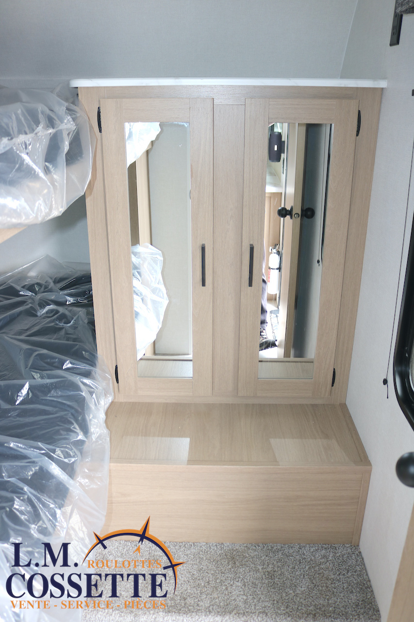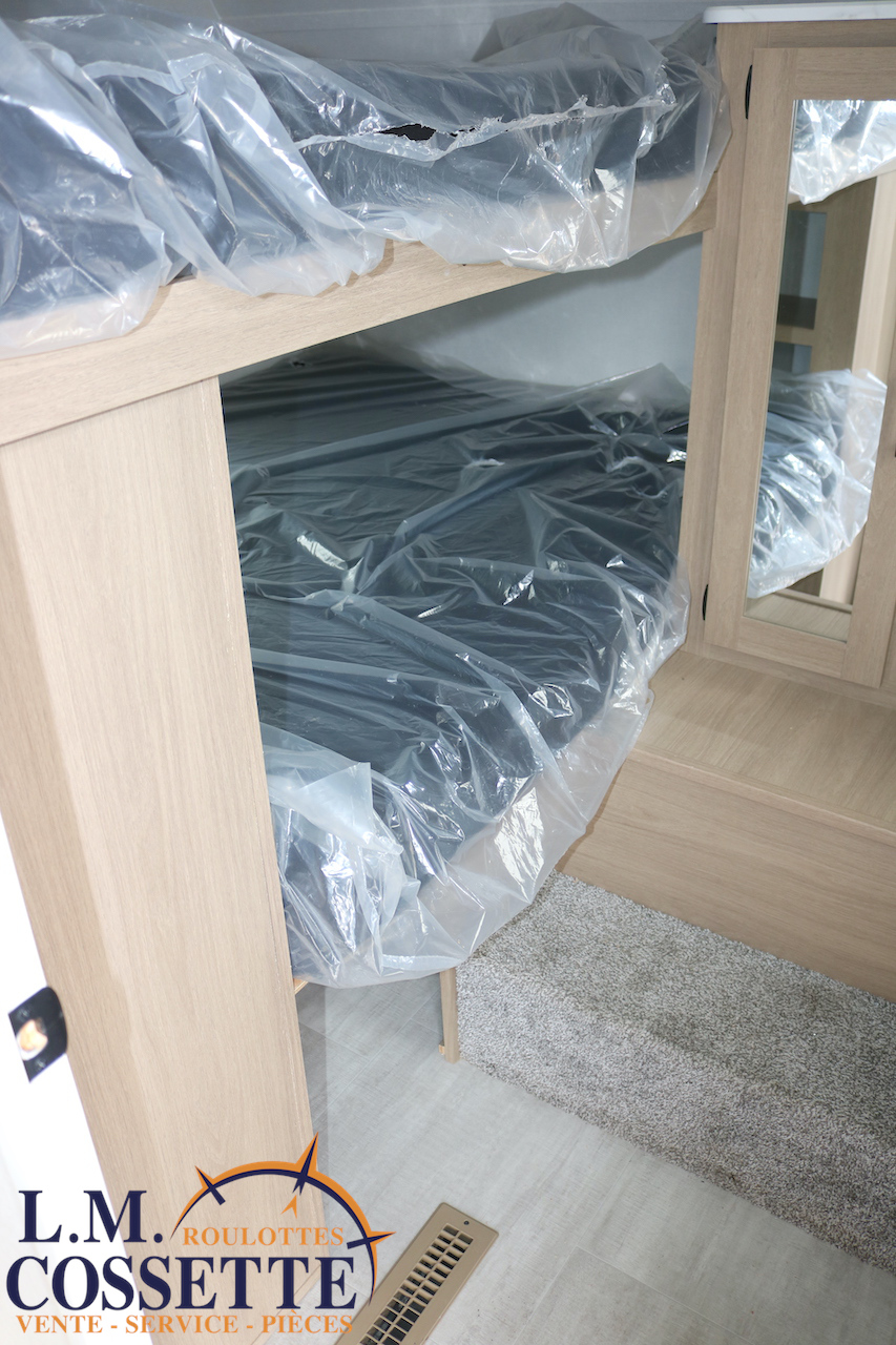 ATTRAYANTE ROULOTTE FAMILIALE AVEC GRAND LIT QUEEN SUPERPOSÉS !!! La chambre principale possède une rallonge pour le lit , dont les dimensions sont de 70 pouces x 80 pouces . Cette chambre est spacieuse , et possède plusieurs tiroirs , ainsi qu’un garde-robe . Elle possède , de plus , une pratique lingerie dans le petit couloir face à la salle de bain . La deuxième chambre , quand à elle , possède deux grand lits queen ( 60 pouces x 80 pouces ) superposés . Elle est équipé d’une petite cuisine extérieure ! Venez la voir , ce modèle vous séduira ! Vous pouvez nous rejoindre au (819)378-2491 .
