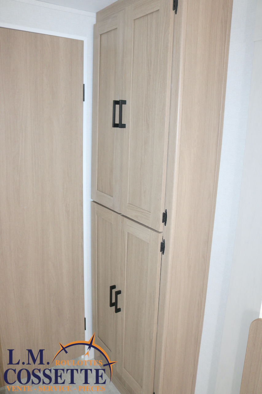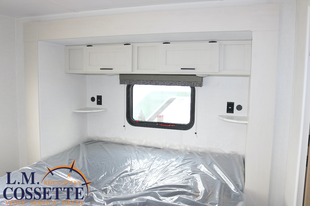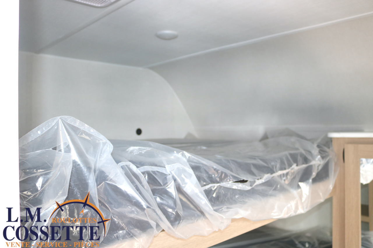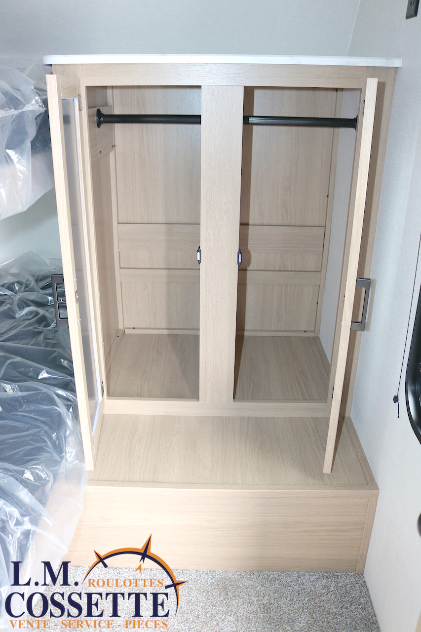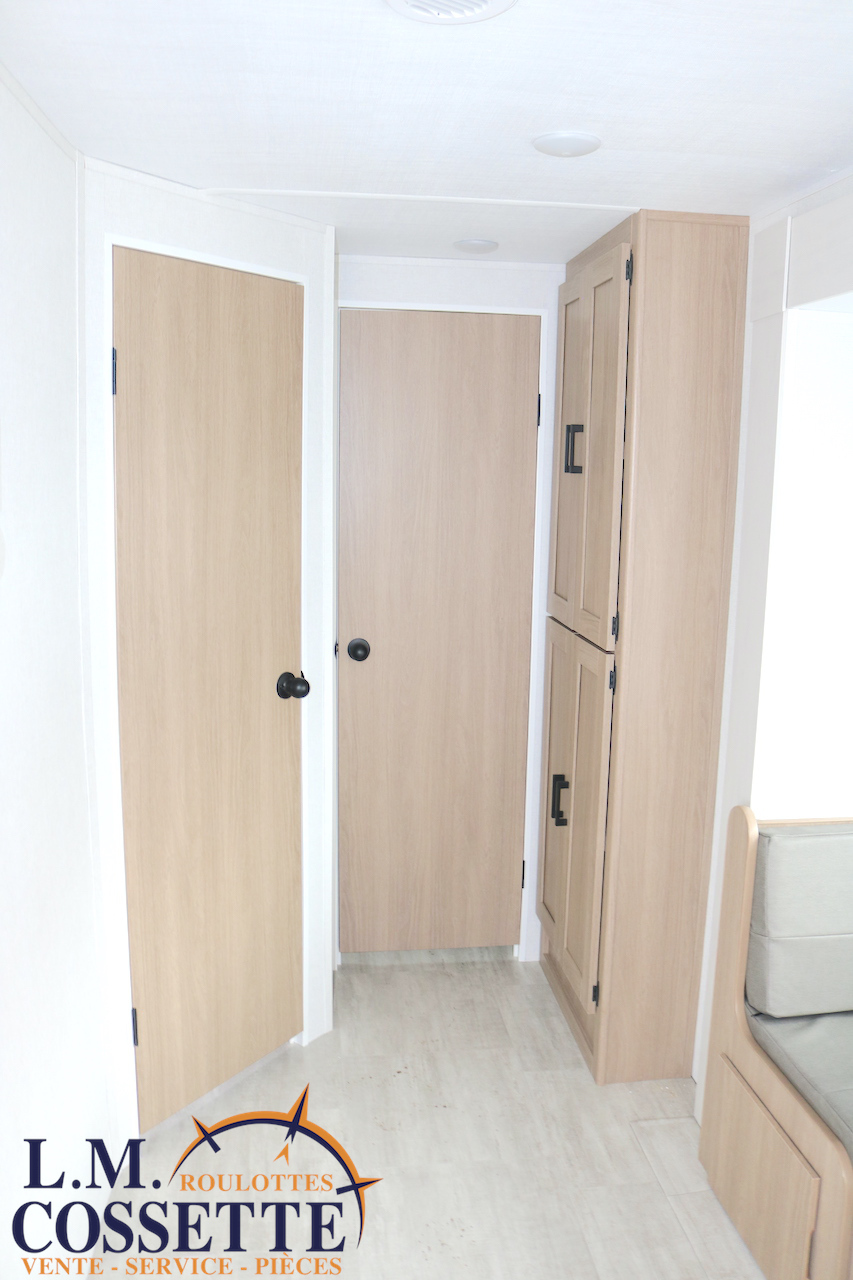 ATTRAYANTE ROULOTTE FAMILIALE AVEC GRAND LIT QUEEN SUPERPOSÉS !!! La chambre principale possède une rallonge pour le lit , dont les dimensions sont de 70 pouces x 80 pouces . Cette chambre est spacieuse , et possède plusieurs tiroirs , ainsi qu’un garde-robe . Elle possède , de plus , une pratique lingerie dans le petit couloir face à la salle de bain . La deuxième chambre , quand à elle , possède deux grand lits queen ( 60 pouces x 80 pouces ) superposés . Elle est équipé d’une petite cuisine extérieure ! Venez la voir , ce modèle vous séduira ! Vous pouvez nous rejoindre au (819)378-2491 .