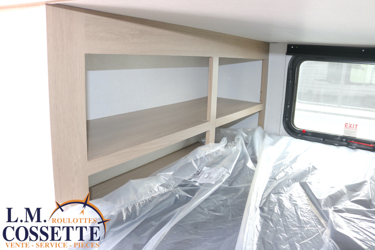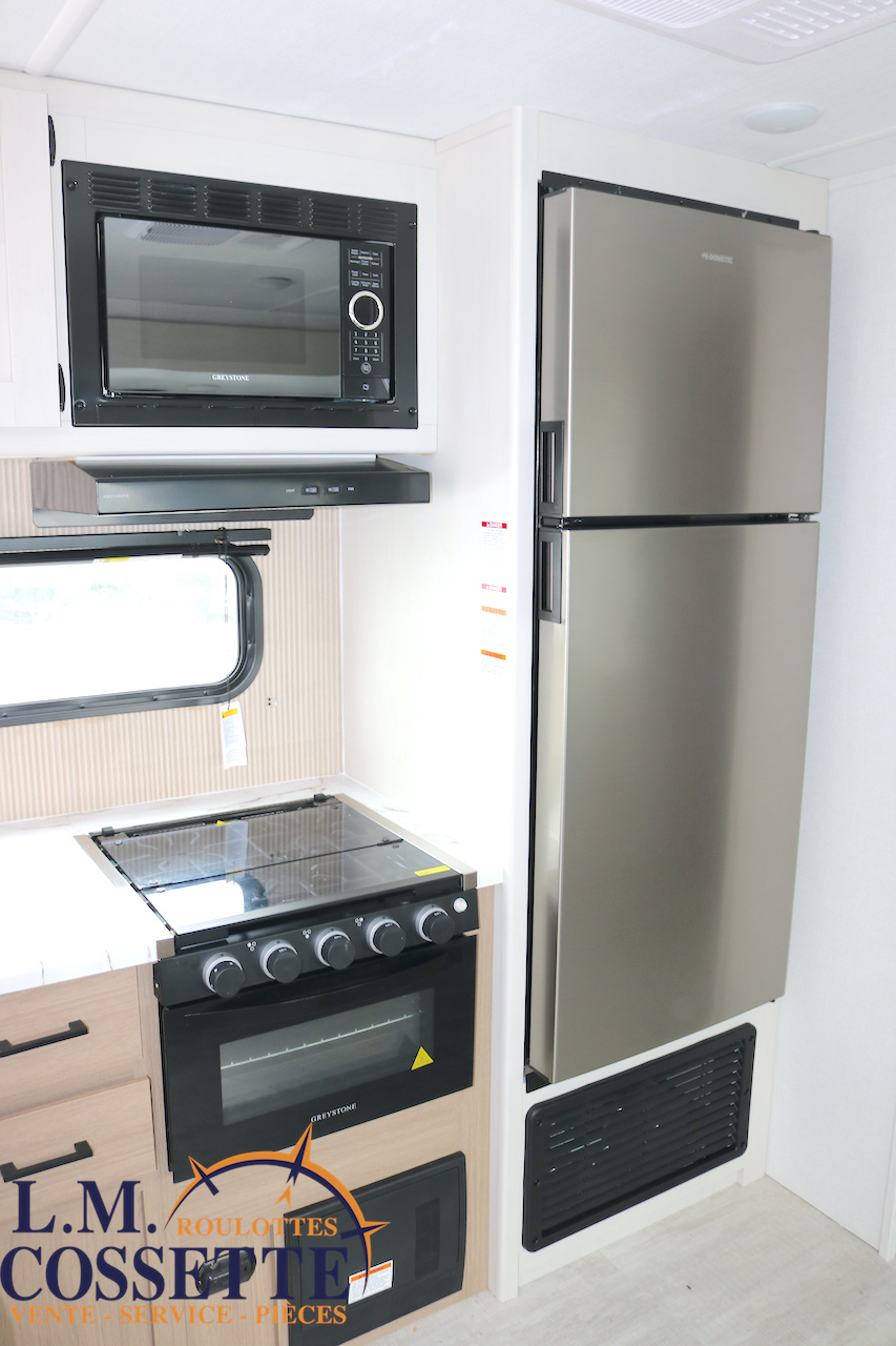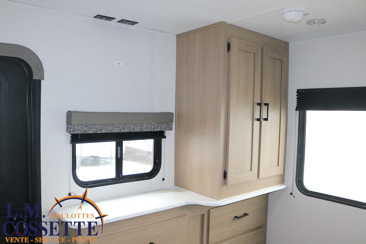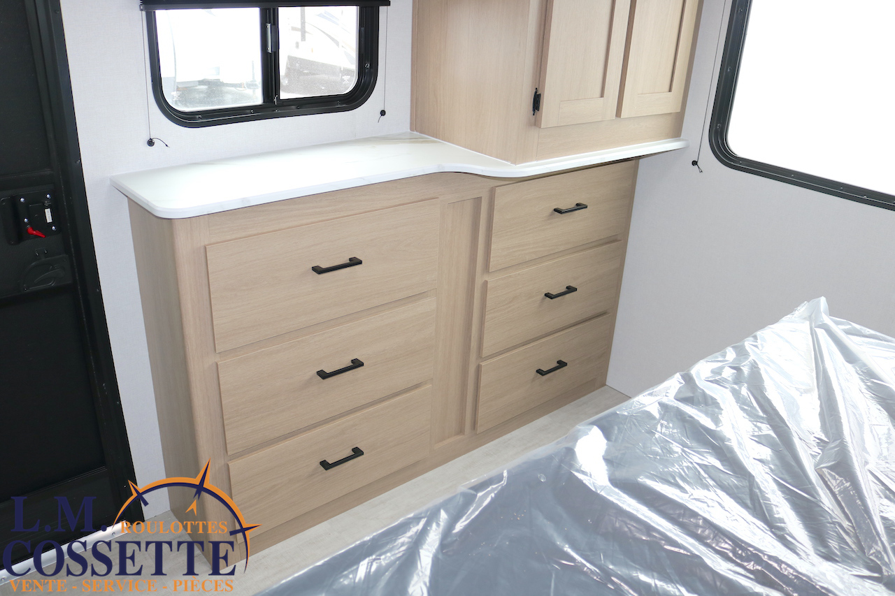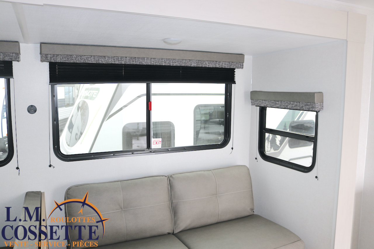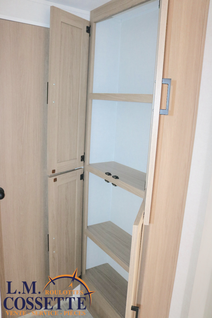 ATTRAYANTE ROULOTTE FAMILIALE AVEC GRAND LIT QUEEN SUPERPOSÉS !!! La chambre principale possède une rallonge pour le lit , dont les dimensions sont de 70 pouces x 80 pouces . Cette chambre est spacieuse , et possède plusieurs tiroirs , ainsi qu’un garde-robe . Elle possède , de plus , une pratique lingerie dans le petit couloir face à la salle de bain . La deuxième chambre , quand à elle , possède deux grand lits queen ( 60 pouces x 80 pouces ) superposés . Elle est équipé d’une petite cuisine extérieure ! Venez la voir , ce modèle vous séduira ! Vous pouvez nous rejoindre au (819)378-2491 .
