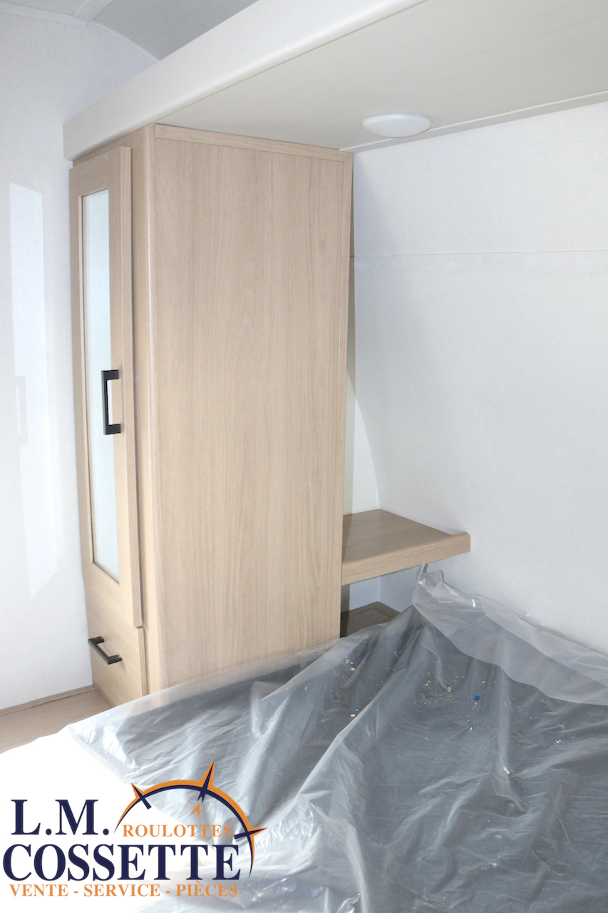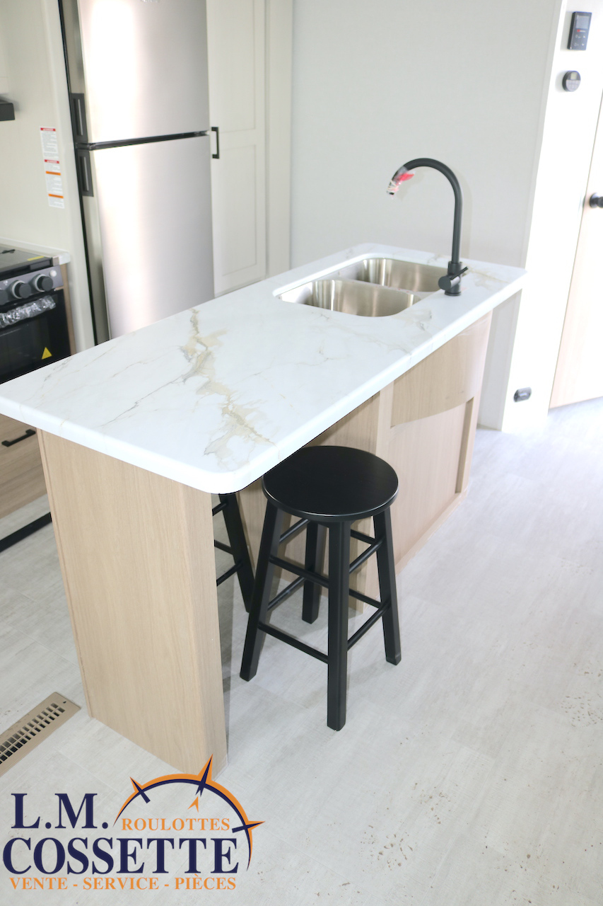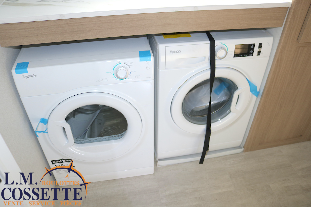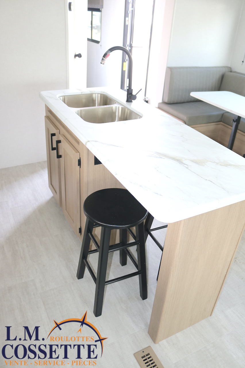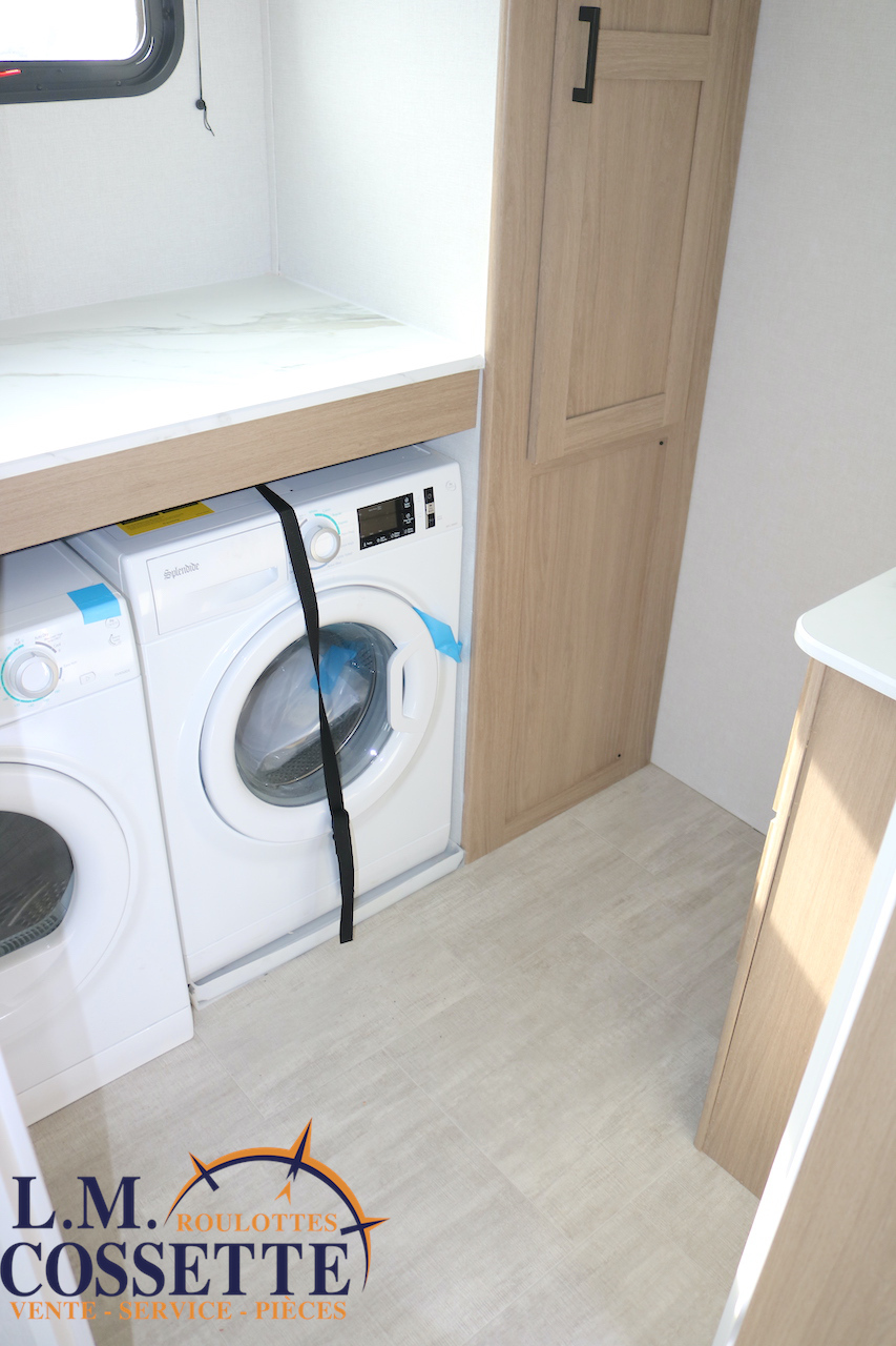 SOMPTUEUSE ROULOTTE POUR COUPLE AVEC SALLE DE LAVAGE !!! Elle possède deux rallonges , face à face , permettant d’avoir un immense espace central , dans lequel se trouve un ilot ! L’ilot comprend un petit comptoir lunch muni de deux tabourets . Le rangement dans la cuisine est tout simplement incroyable , avec un grand nombre de tiroirs , ainsi qu’un grand garde-manger . Elle est équipé d’une salle de lavage ( laveuse/sécheuse inclus ) , avec rangement et comptoir pour plier le linge . La salle de bain est spacieuse , et comprend une grande lingerie . Venez la voir , vous tomberez sous le charme de cette magnifique roulotte . Vous pouvez nous rejoindre au (819)378-2491 .