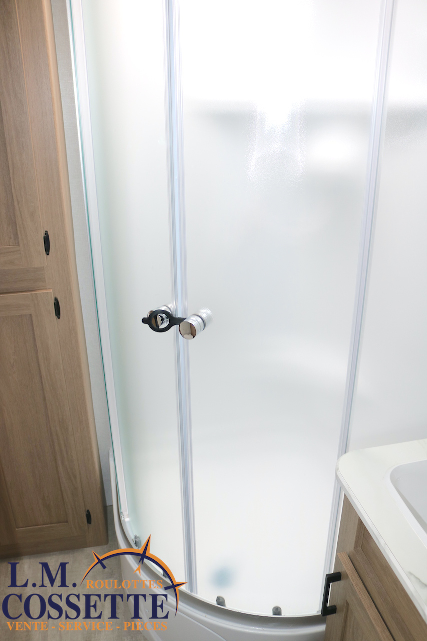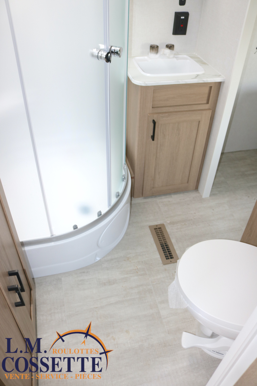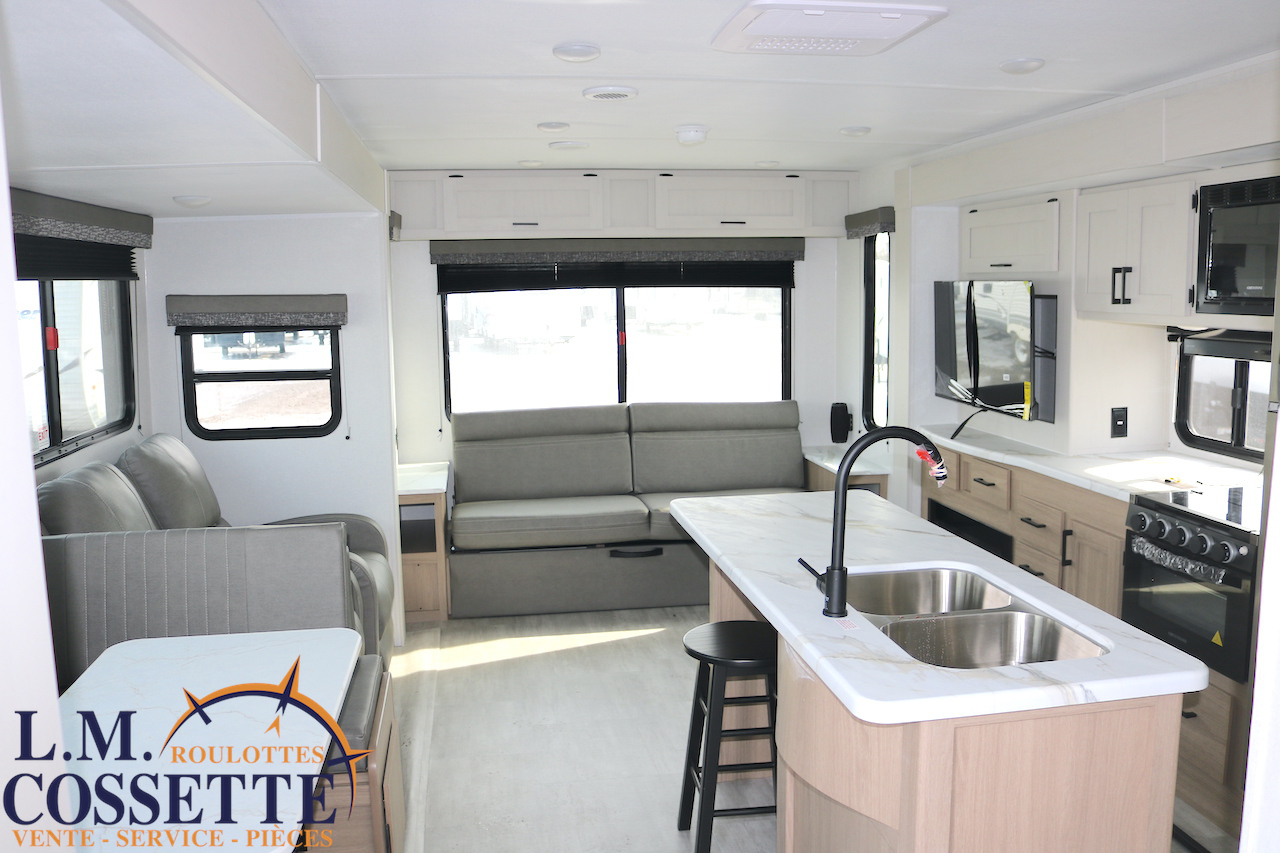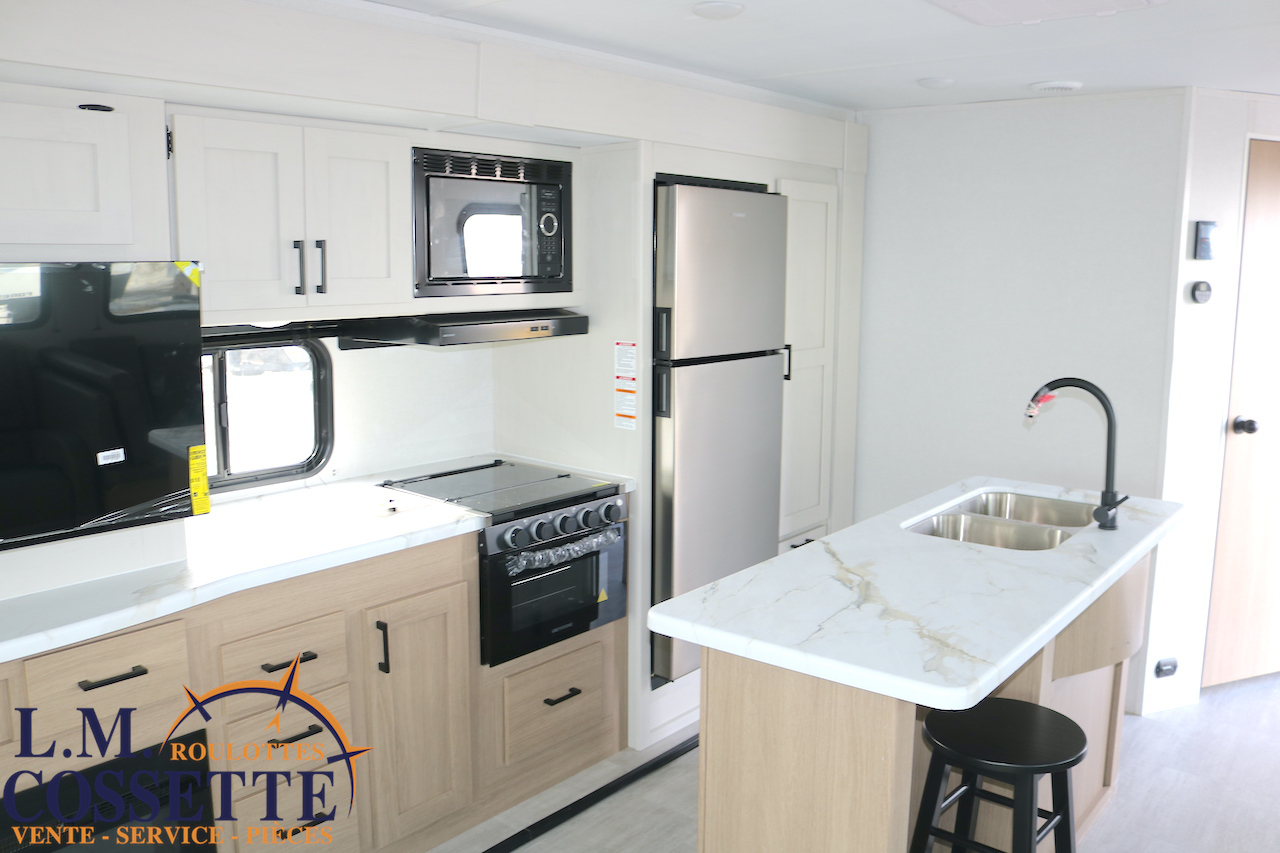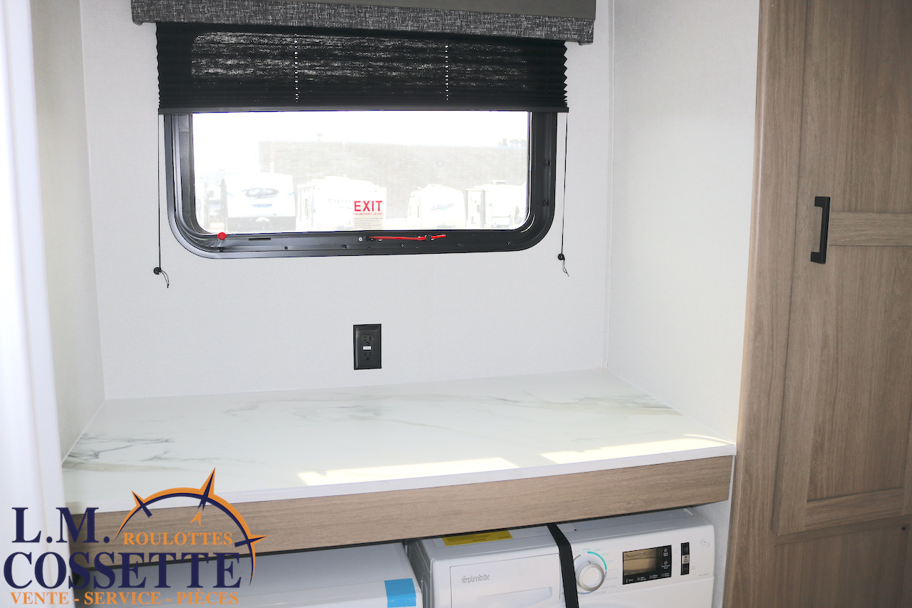 SOMPTUEUSE ROULOTTE POUR COUPLE AVEC SALLE DE LAVAGE !!! Elle possède deux rallonges , face à face , permettant d’avoir un immense espace central , dans lequel se trouve un ilot ! L’ilot comprend un petit comptoir lunch muni de deux tabourets . Le rangement dans la cuisine est tout simplement incroyable , avec un grand nombre de tiroirs , ainsi qu’un grand garde-manger . Elle est équipé d’une salle de lavage ( laveuse/sécheuse inclus ) , avec rangement et comptoir pour plier le linge . La salle de bain est spacieuse , et comprend une grande lingerie . Venez la voir , vous tomberez sous le charme de cette magnifique roulotte . Vous pouvez nous rejoindre au (819)378-2491 .