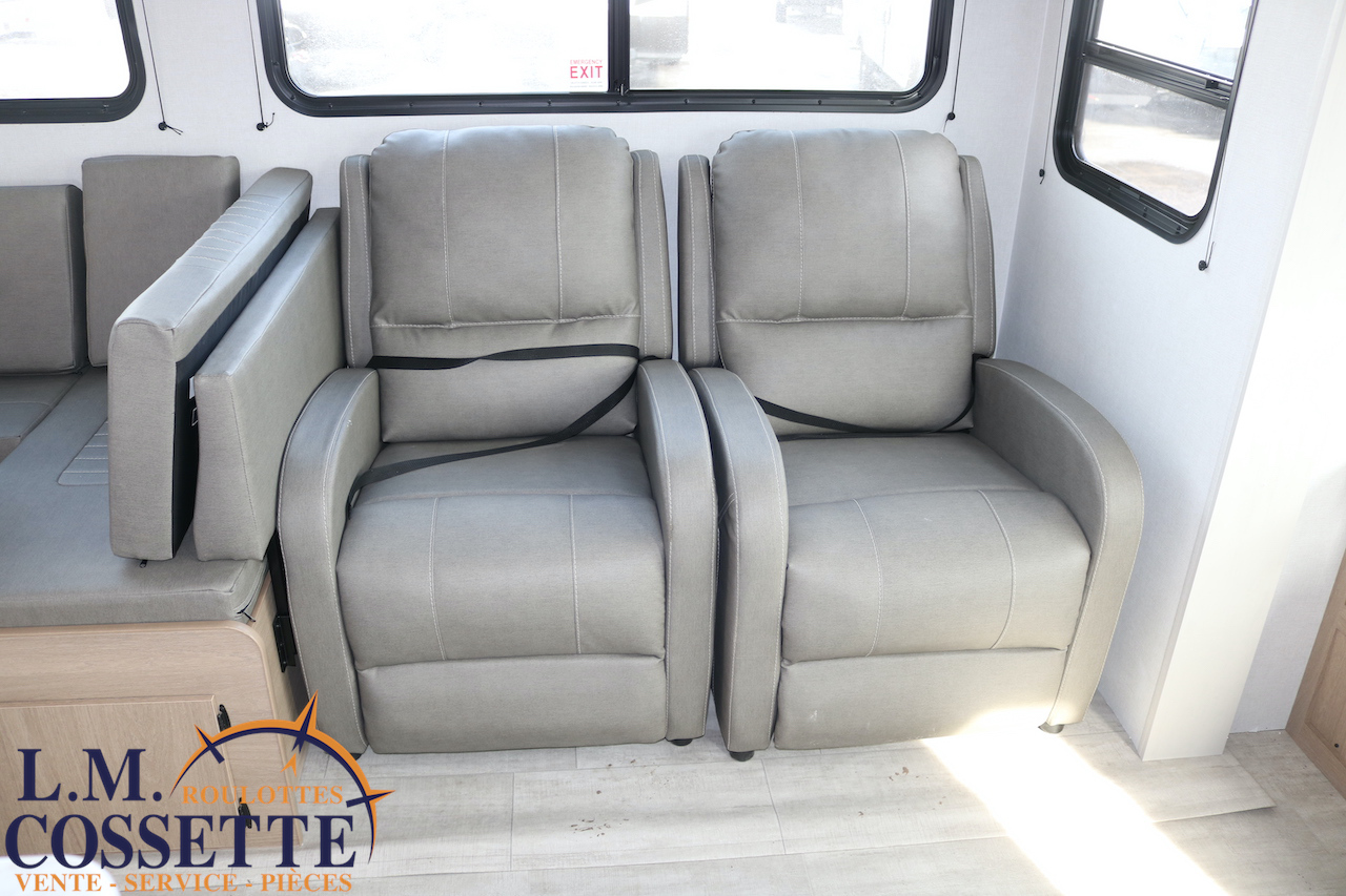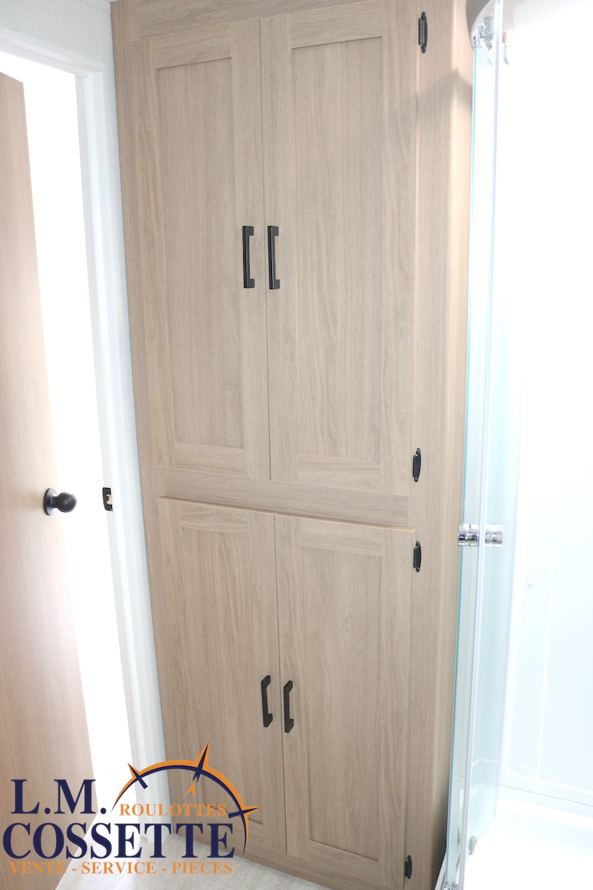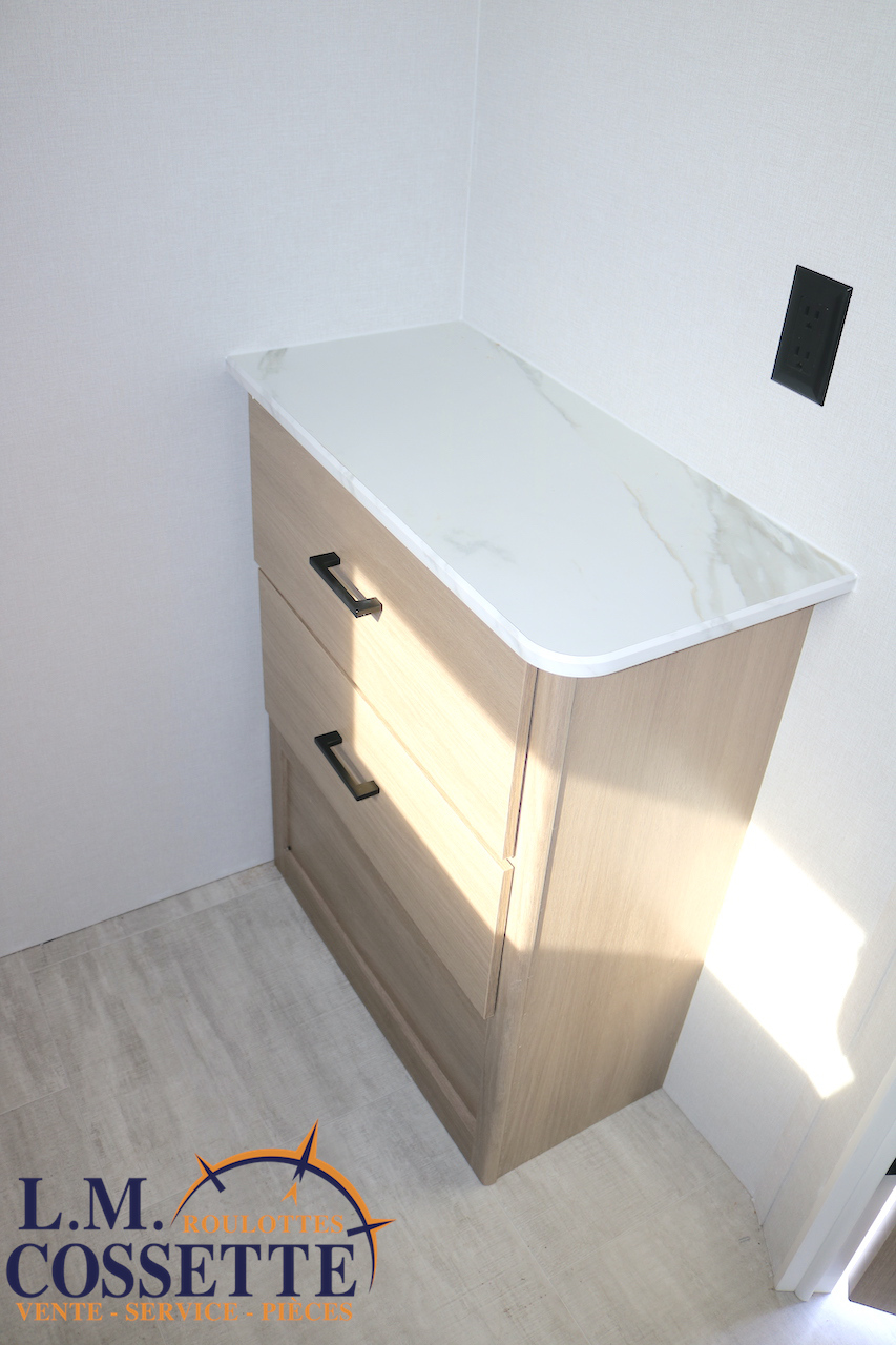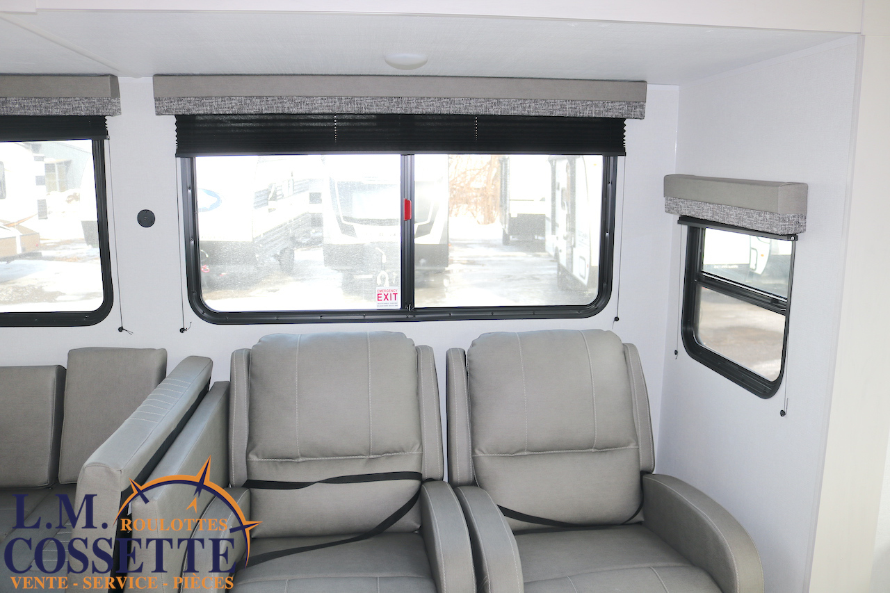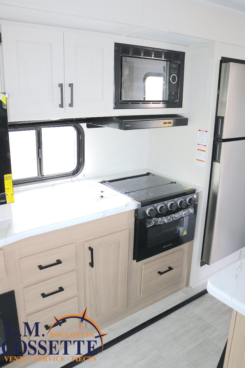 SOMPTUEUSE ROULOTTE POUR COUPLE AVEC SALLE DE LAVAGE !!! Elle possède deux rallonges , face à face , permettant d’avoir un immense espace central , dans lequel se trouve un ilot ! L’ilot comprend un petit comptoir lunch muni de deux tabourets . Le rangement dans la cuisine est tout simplement incroyable , avec un grand nombre de tiroirs , ainsi qu’un grand garde-manger . Elle est équipé d’une salle de lavage ( laveuse/sécheuse inclus ) , avec rangement et comptoir pour plier le linge . La salle de bain est spacieuse , et comprend une grande lingerie . Venez la voir , vous tomberez sous le charme de cette magnifique roulotte . Vous pouvez nous rejoindre au (819)378-2491 .