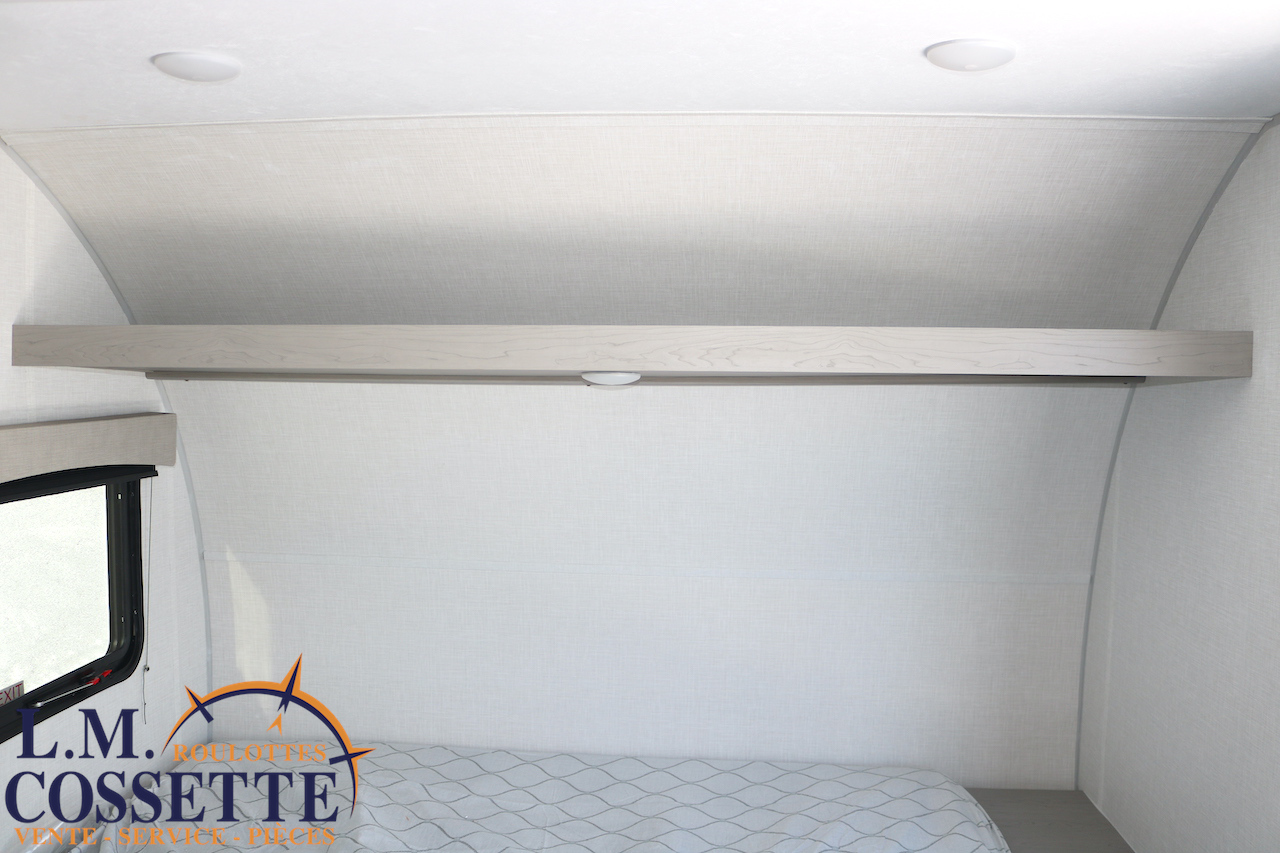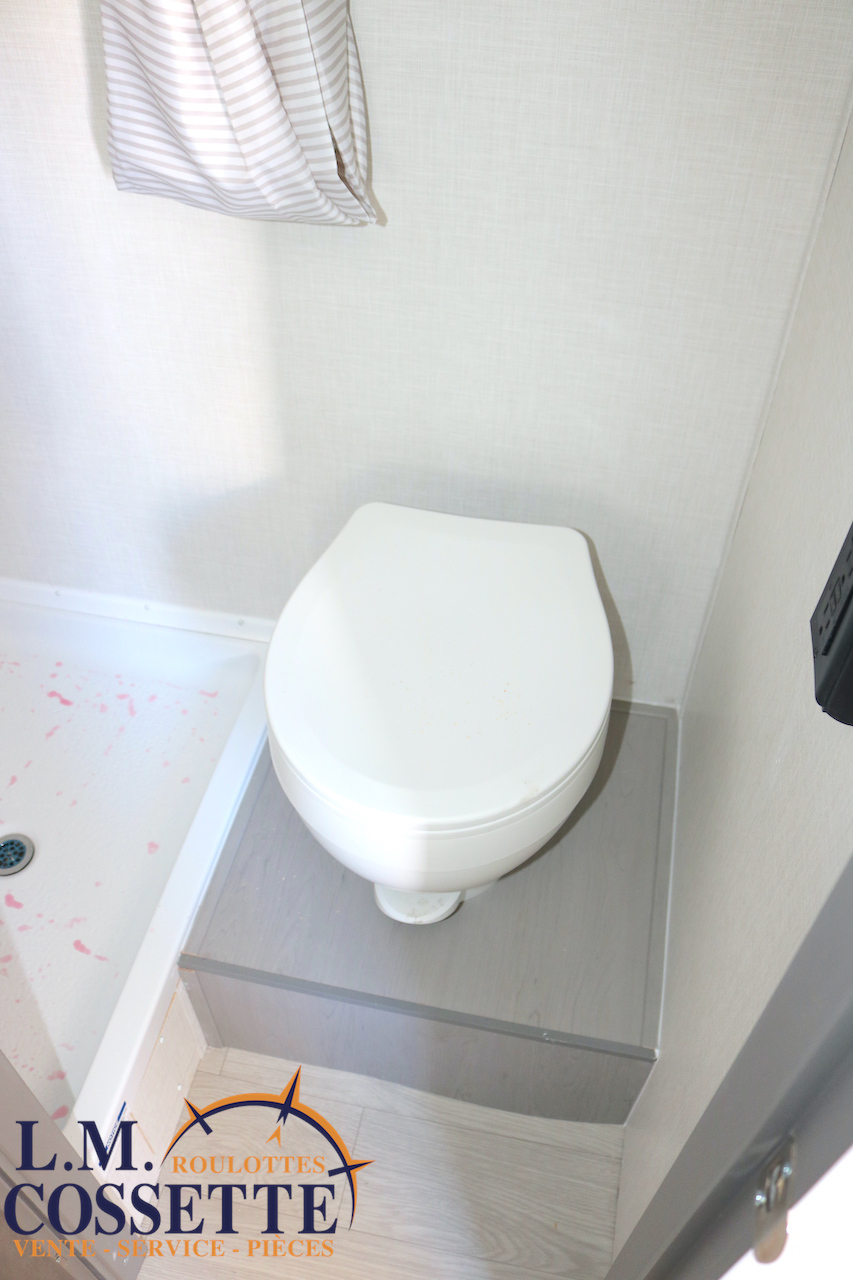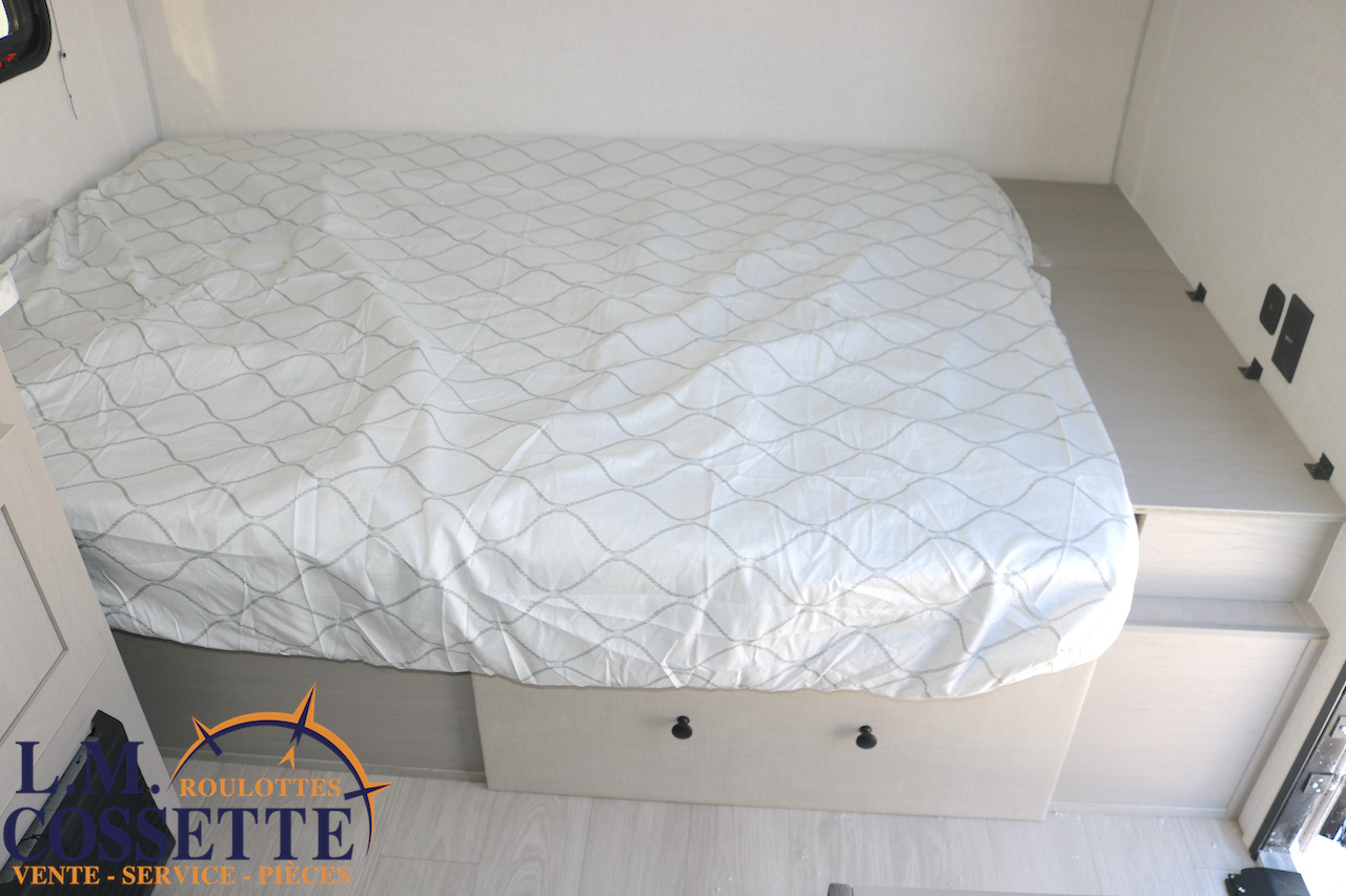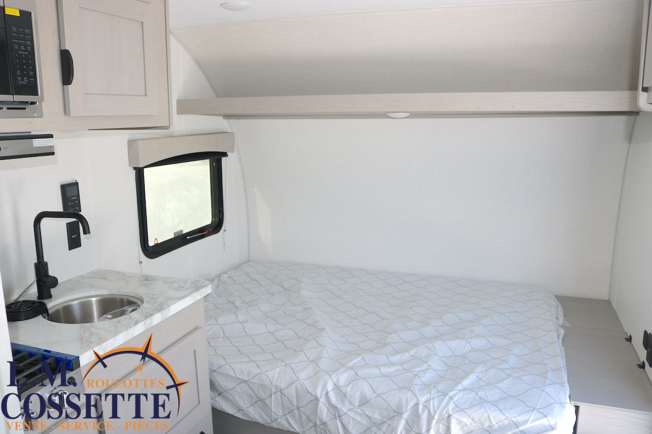 MIGNONNE PETITE ROULOTTE POUR COUPLE !!! Très légère , seulement 2525 lbs , elle possède tout le nécessaire pour vos sorties de camping ! Un grand lit double avec rangement à l’extrémité et sous le lit , une petite banquette avec une grande fenêtre vis à vis , ainsi qu’une toilette à côté de la douche . Le comptoir est fonctionnel et muni d’un lave-verres à l’évier . Le coffre extérieur est grand . Venez la voir , ses nombreux avantages vont vous surprendre ! Vous pouvez nous rejoindre au (819)378-2491 .