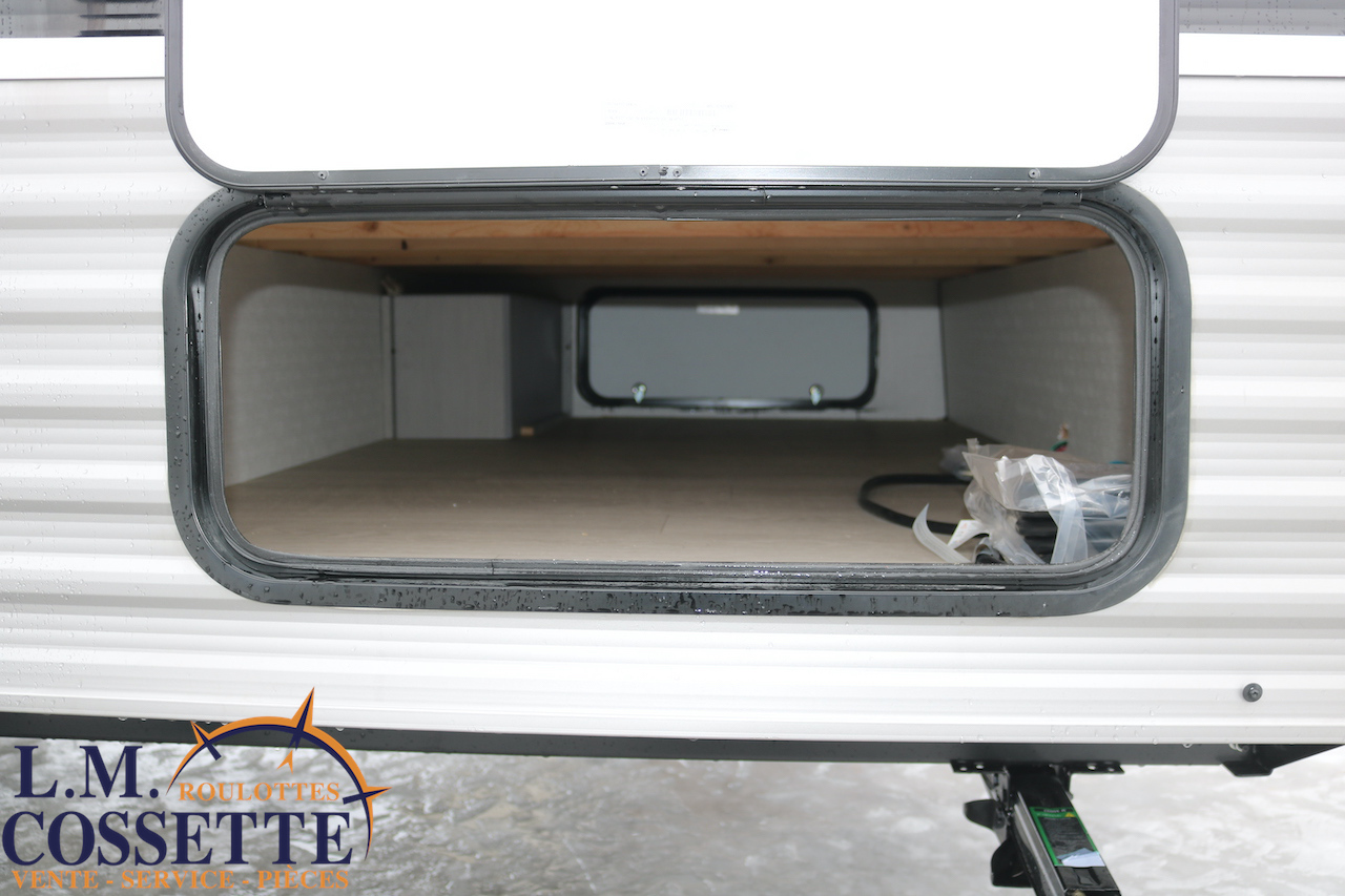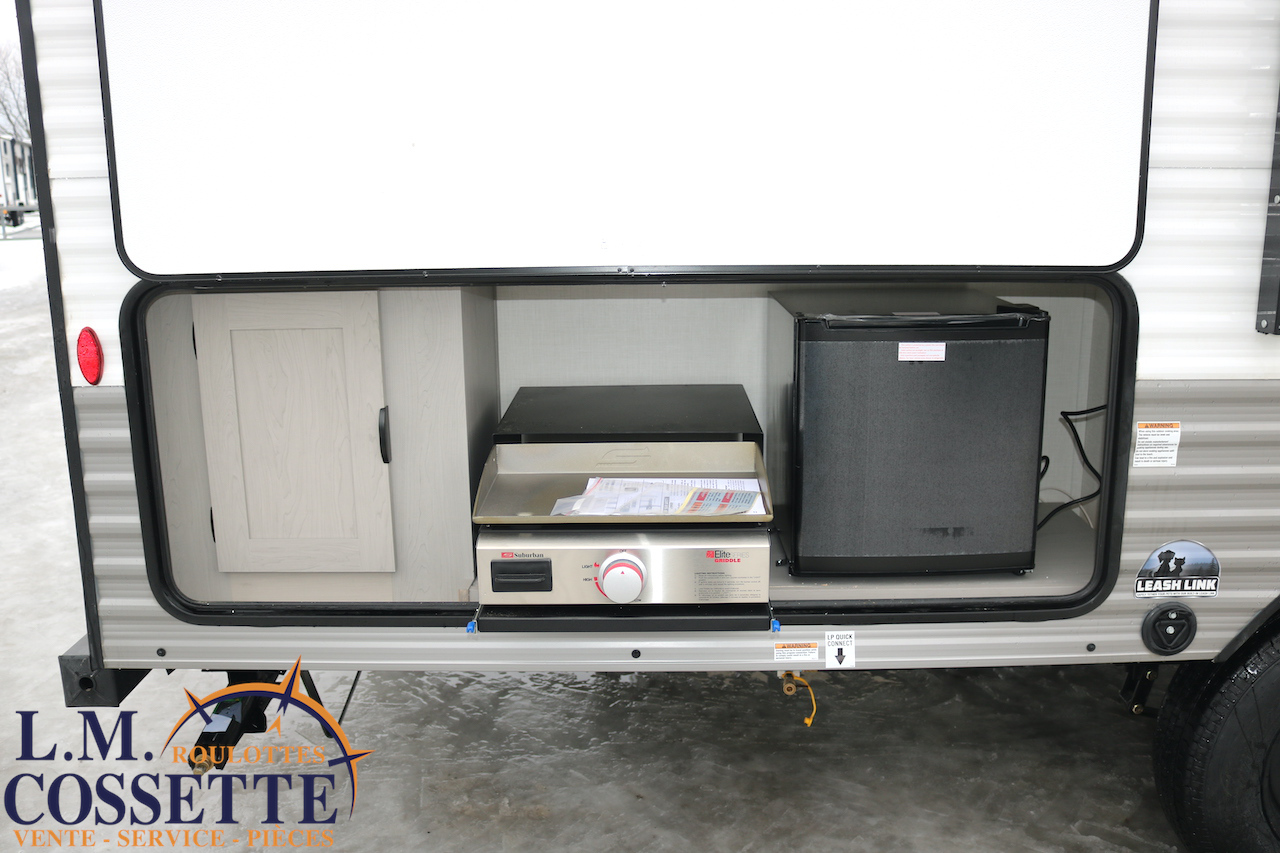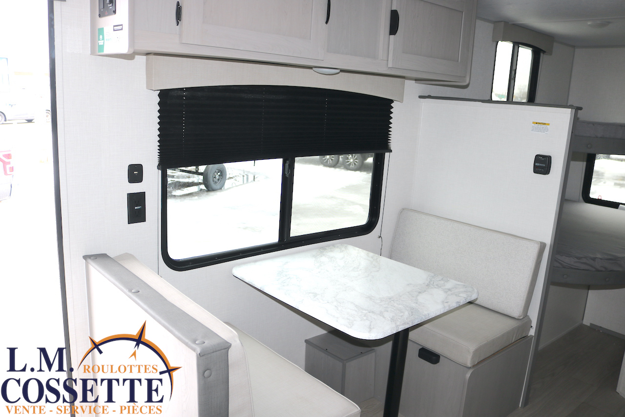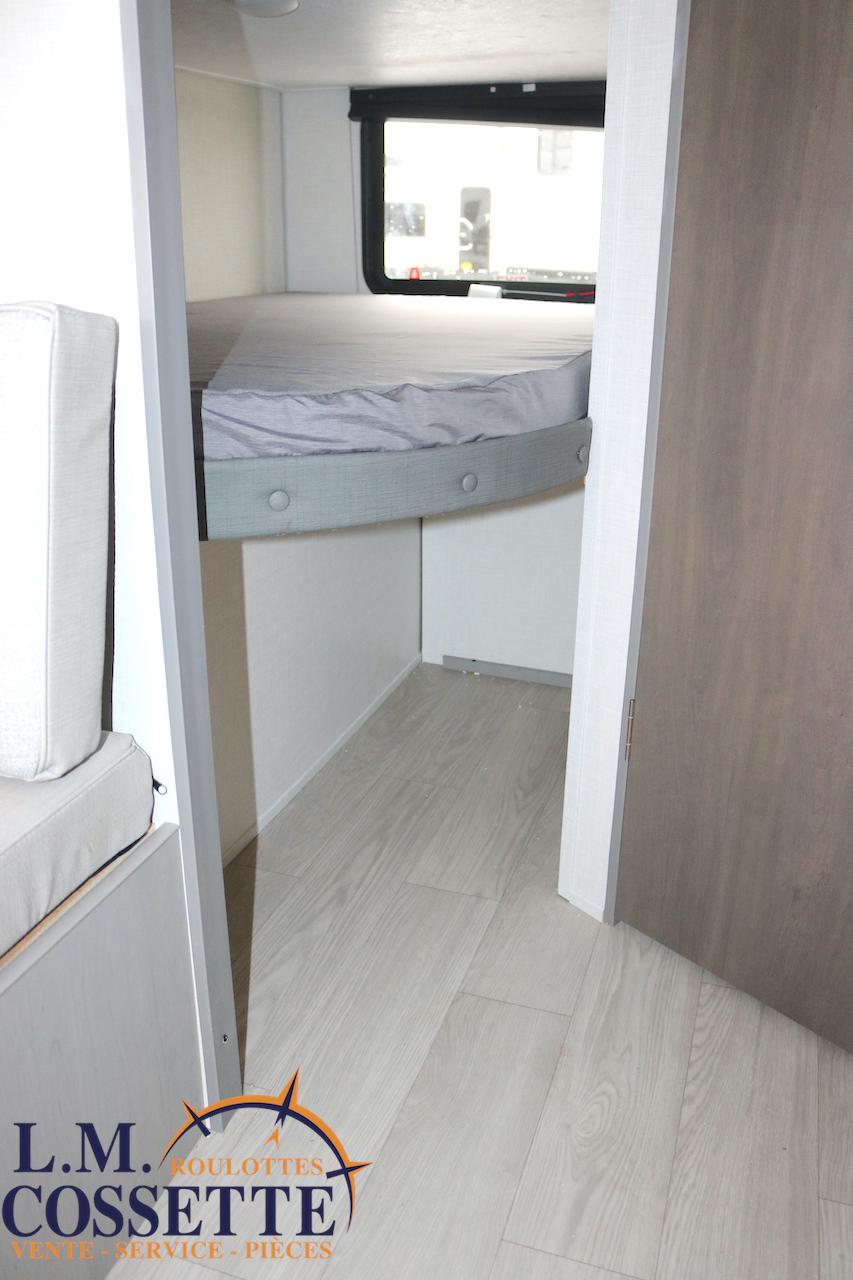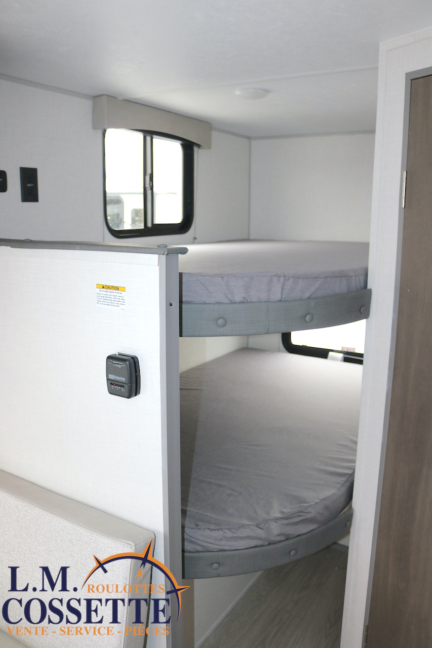 MODÈLE FAMILIALE TRÈS RECHERCHÉ !!! Ce modèle est très recherché car elle a deux lits double superposés , une banquette du côté de l’auvent , et le lit principal à l’avant , tout ça pour un poids de seulement 3460 lbs ! Une grande fenêtre surplombe la banquette ! Son rangement intérieur est étonnant , avec un grand garde-manger , plusieurs armoires , de petit rangement dans la salle de bain ainsi qu’au pied du lit . Elle est , de plus , équipé d’une petite cuisine extérieure muni d’un petit frigo et un petit grill . Venez la voir , vous serez charmé par toutes qualités . Vous pouvez nous rejoindre au (819) 378-2491 .
