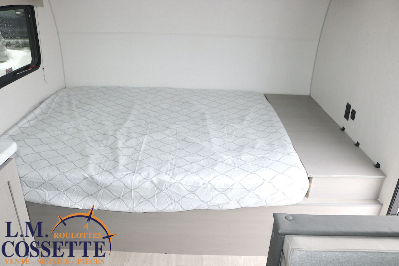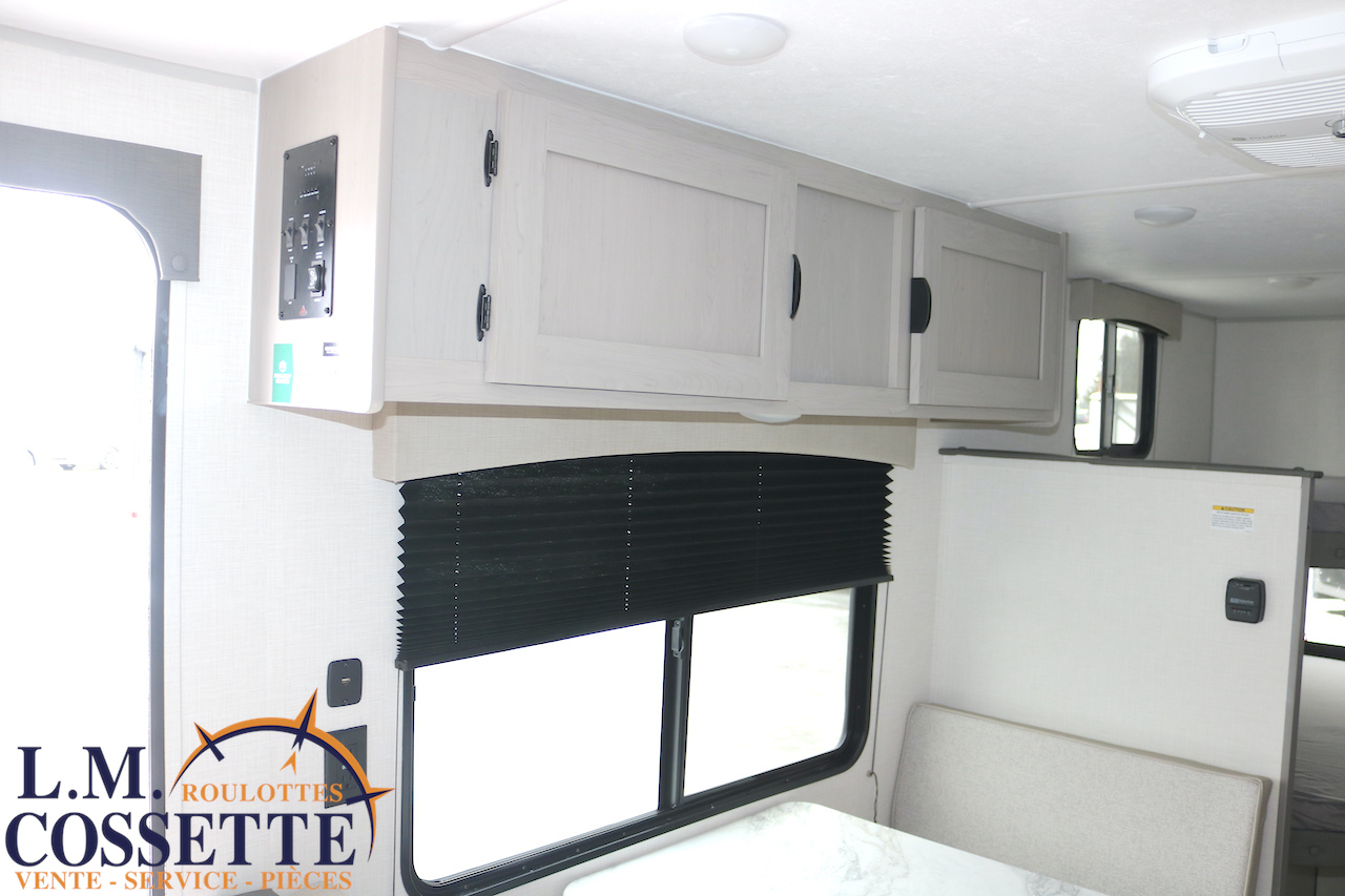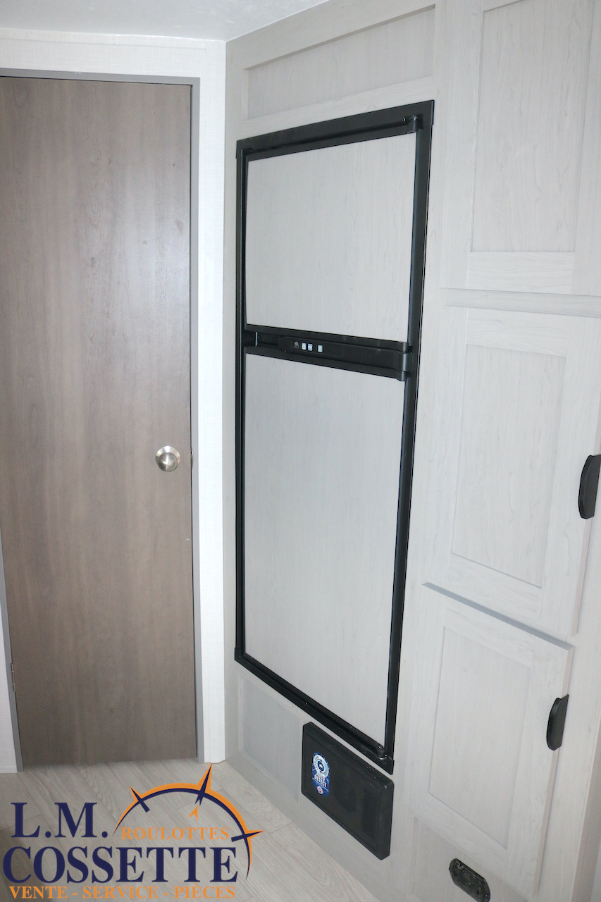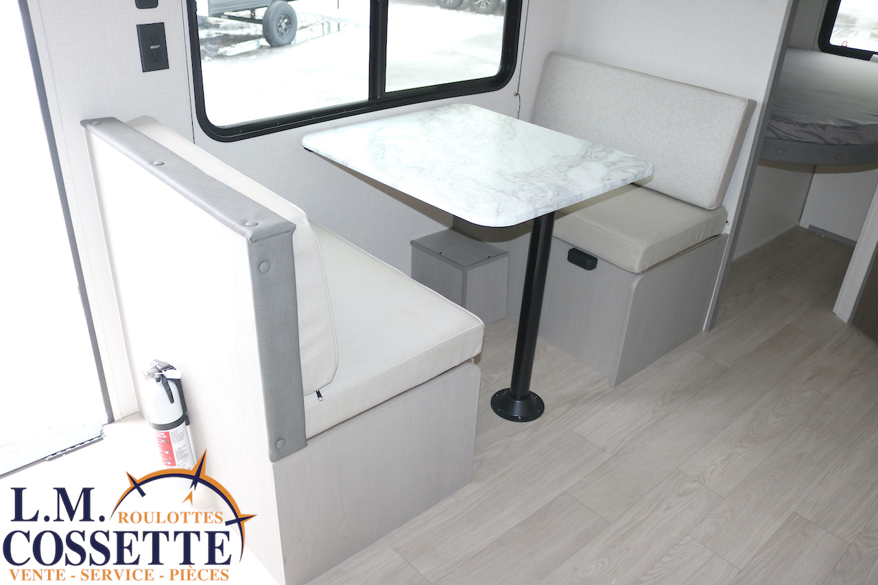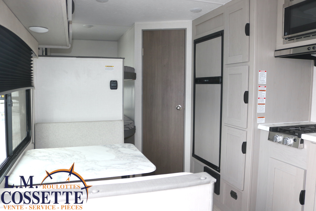 MODÈLE FAMILIALE TRÈS RECHERCHÉ !!! Ce modèle est très recherché car elle a deux lits double superposés , une banquette du côté de l’auvent , et le lit principal à l’avant , tout ça pour un poids de seulement 3460 lbs ! Une grande fenêtre surplombe la banquette ! Son rangement intérieur est étonnant , avec un grand garde-manger , plusieurs armoires , de petit rangement dans la salle de bain ainsi qu’au pied du lit . Elle est , de plus , équipé d’une petite cuisine extérieure muni d’un petit frigo et un petit grill . Venez la voir , vous serez charmé par toutes qualités . Vous pouvez nous rejoindre au (819) 378-2491 .