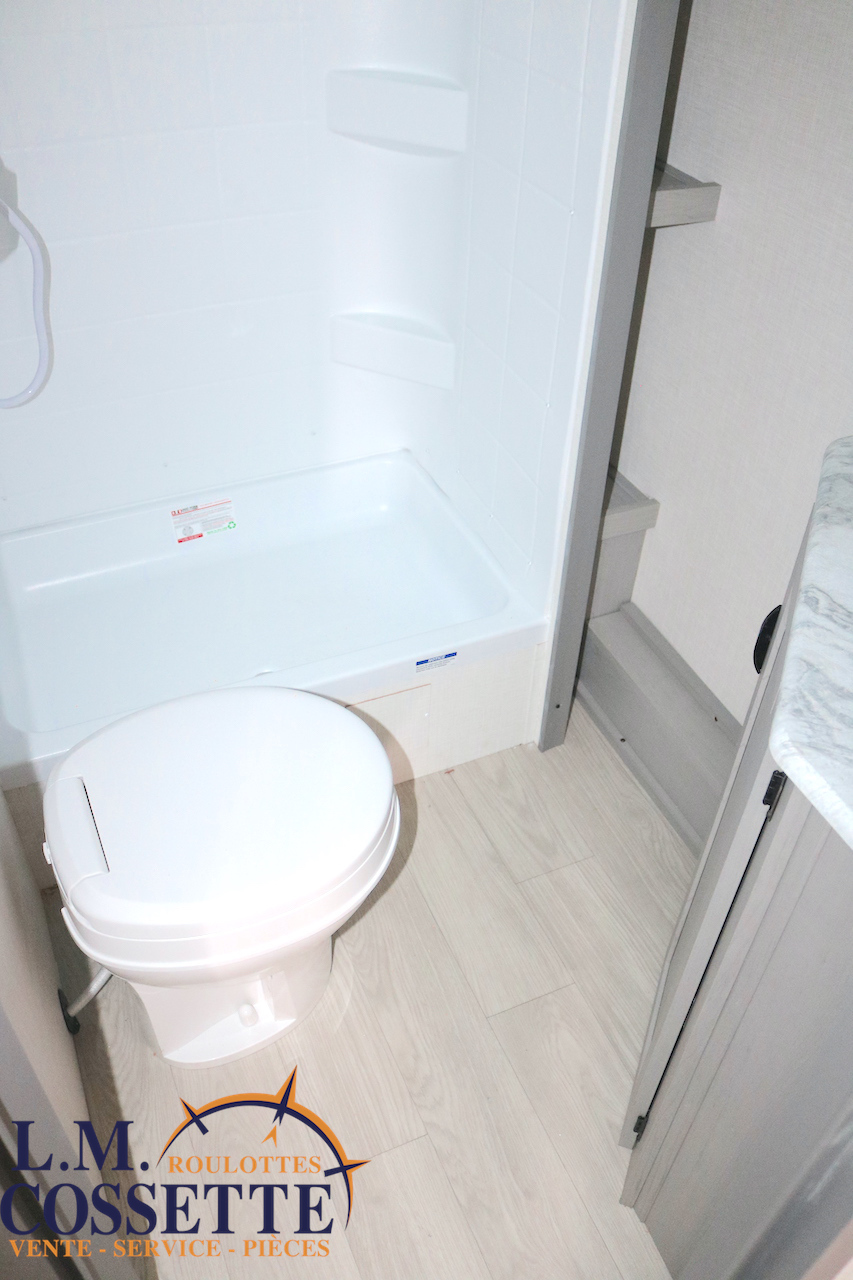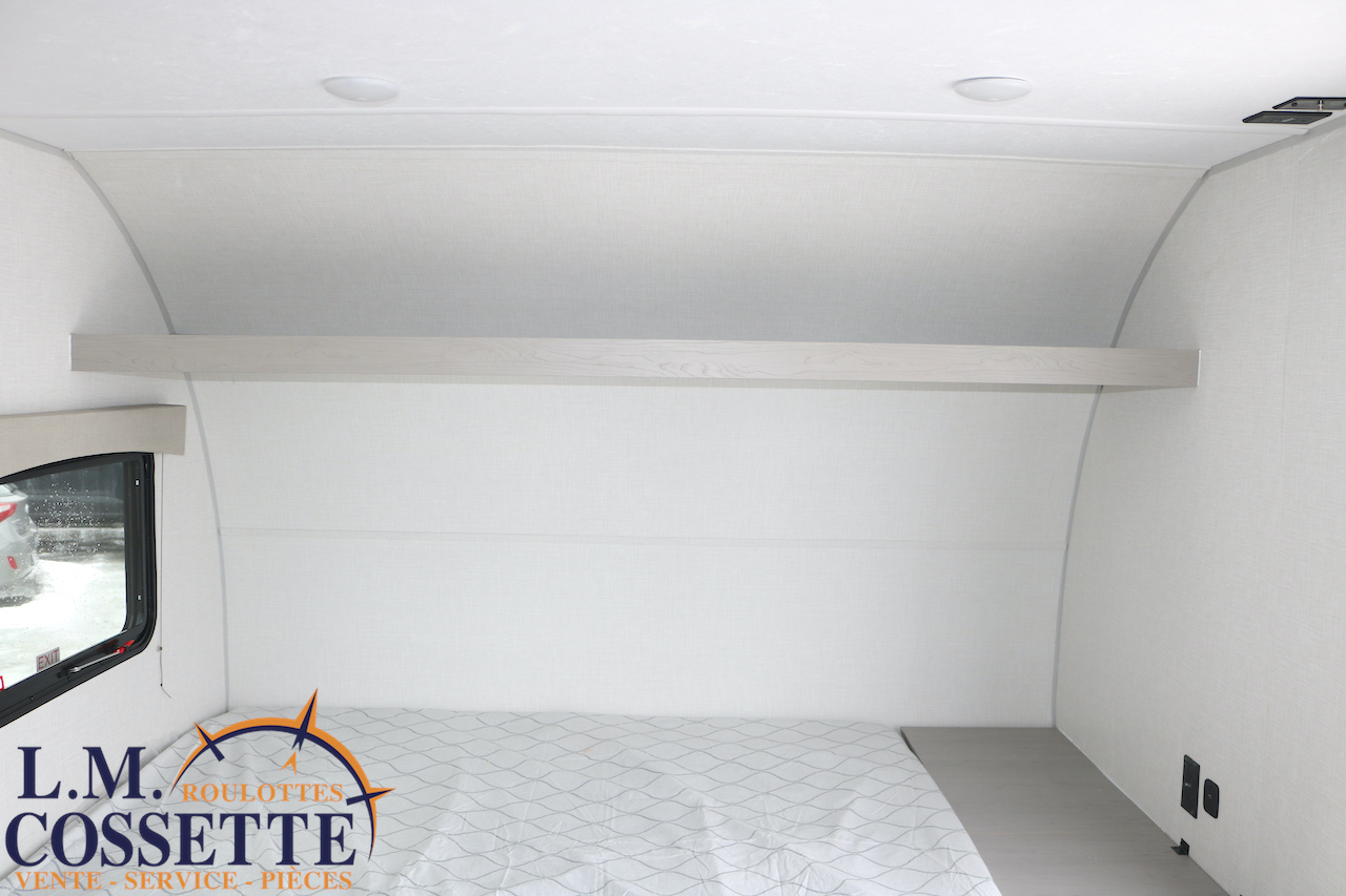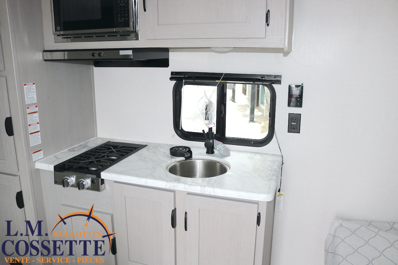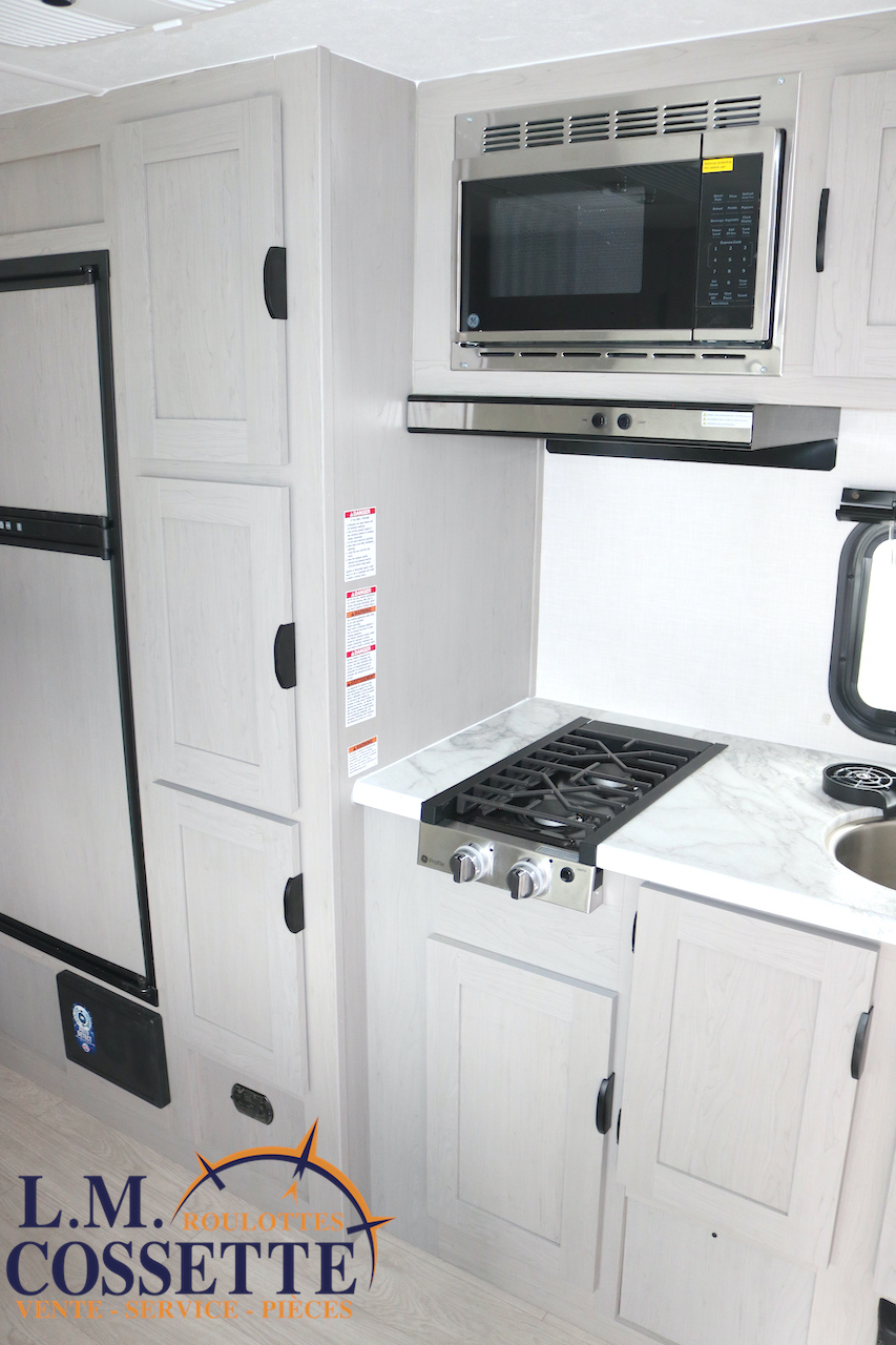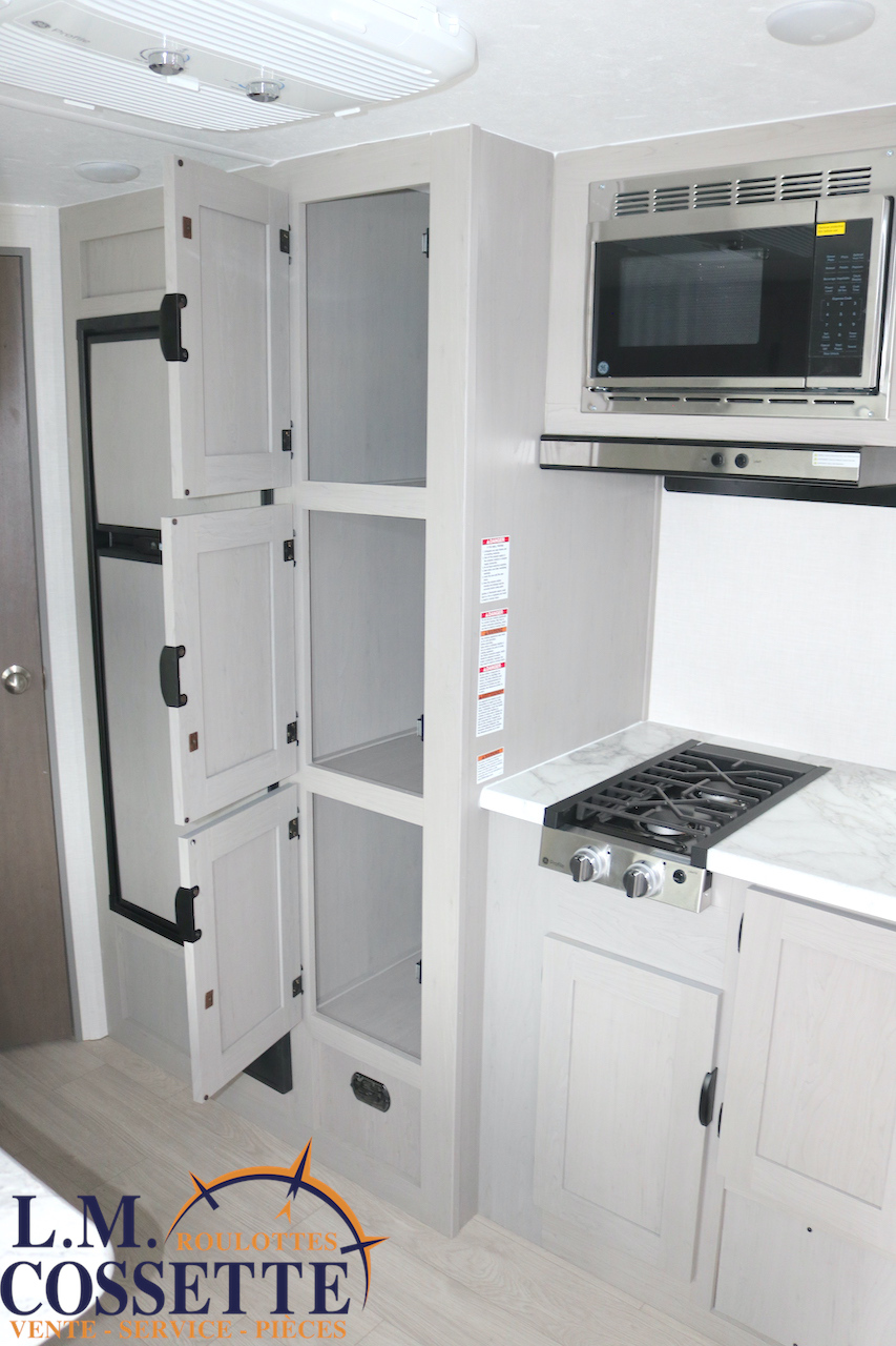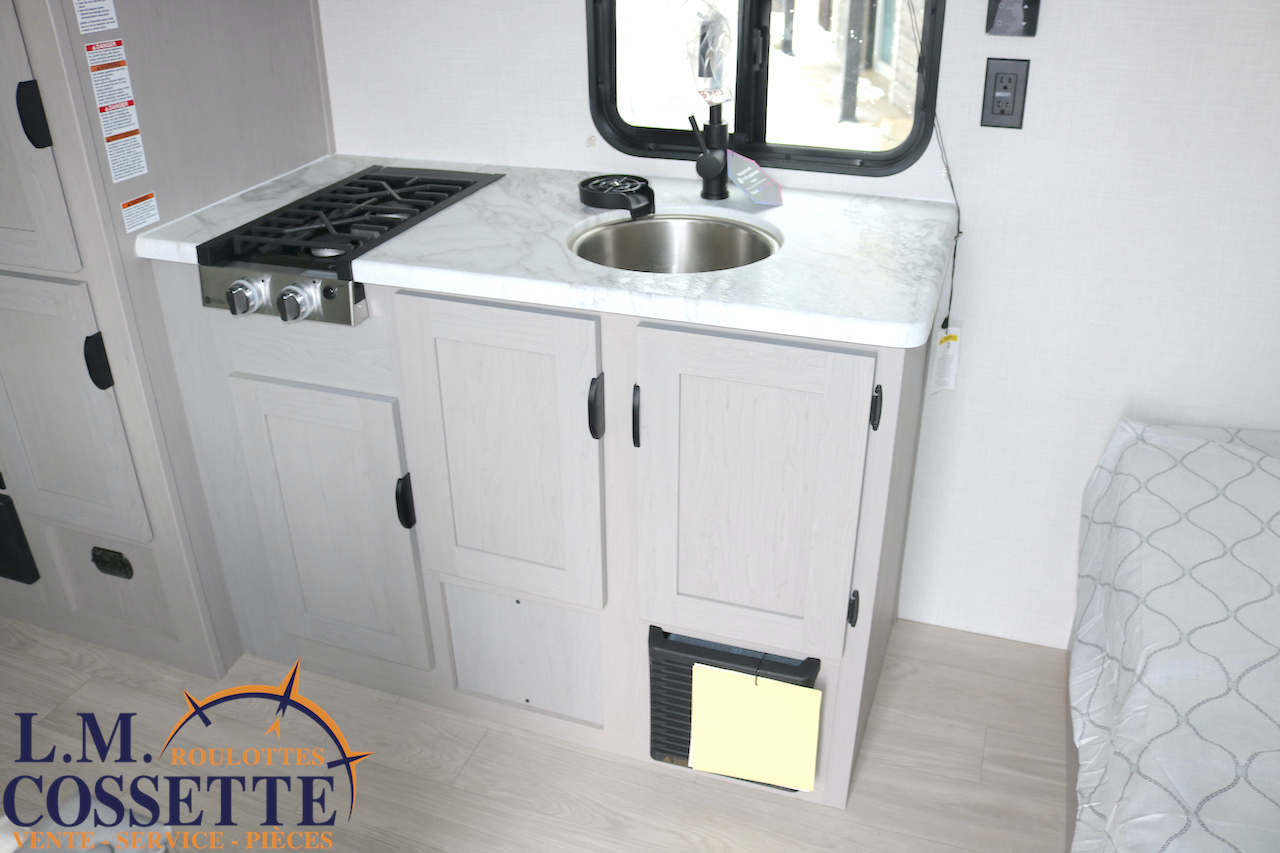 MODÈLE FAMILIALE TRÈS RECHERCHÉ !!! Ce modèle est très recherché car elle a deux lits double superposés , une banquette du côté de l’auvent , et le lit principal à l’avant , tout ça pour un poids de seulement 3460 lbs ! Une grande fenêtre surplombe la banquette ! Son rangement intérieur est étonnant , avec un grand garde-manger , plusieurs armoires , de petit rangement dans la salle de bain ainsi qu’au pied du lit . Elle est , de plus , équipé d’une petite cuisine extérieure muni d’un petit frigo et un petit grill . Venez la voir , vous serez charmé par toutes qualités . Vous pouvez nous rejoindre au (819) 378-2491 .