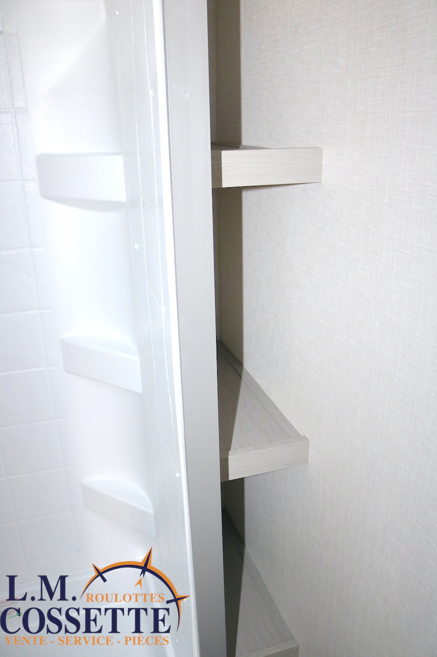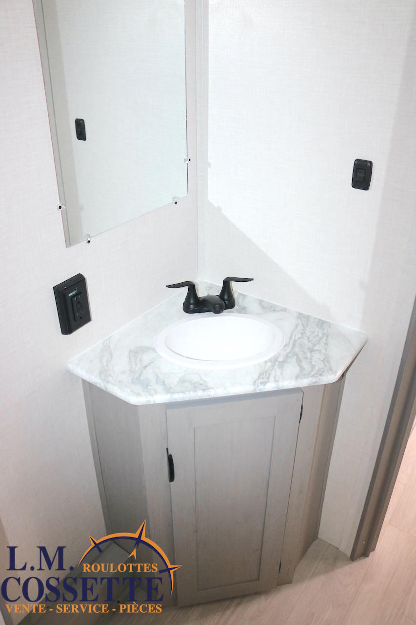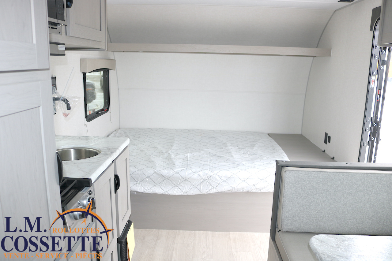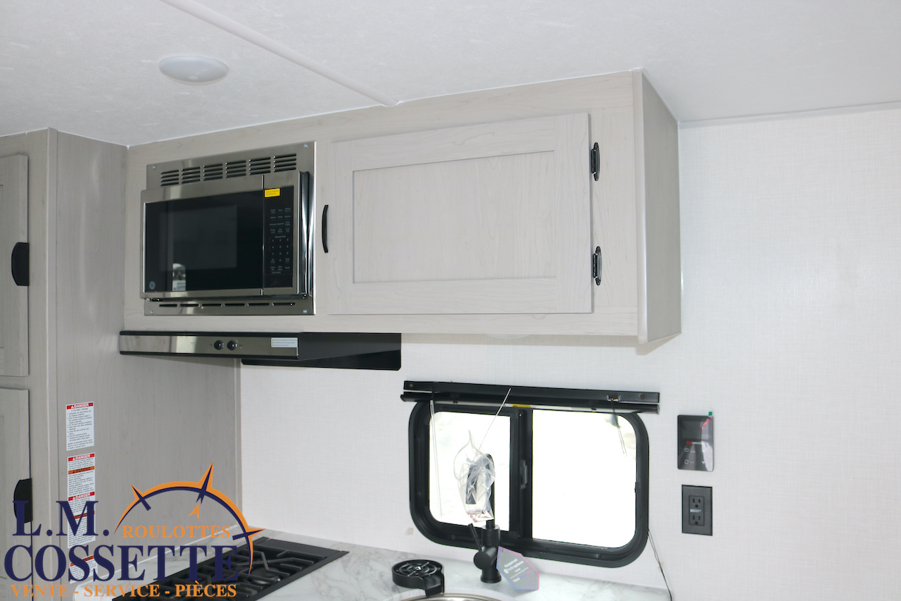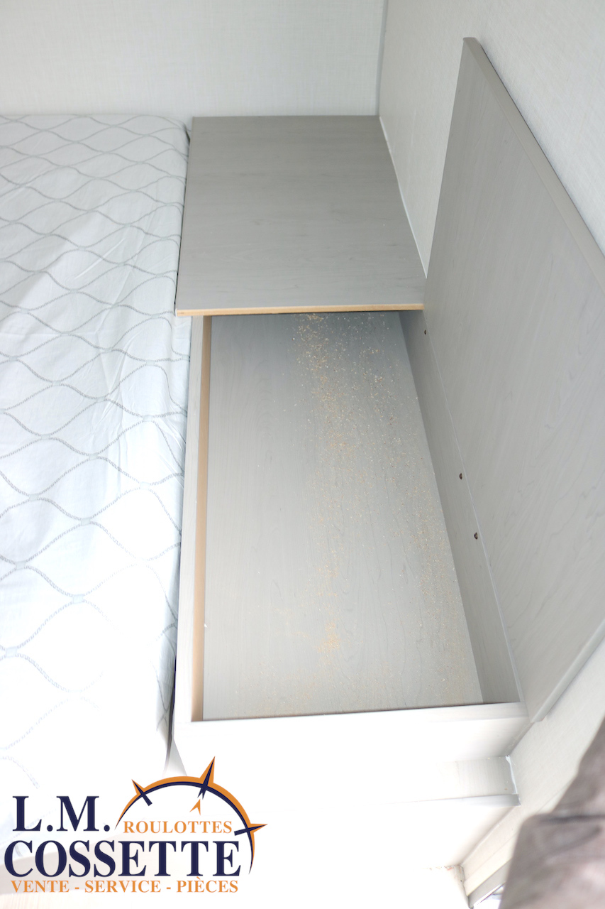 MODÈLE FAMILIALE TRÈS RECHERCHÉ !!! Ce modèle est très recherché car elle a deux lits double superposés , une banquette du côté de l’auvent , et le lit principal à l’avant , tout ça pour un poids de seulement 3460 lbs ! Une grande fenêtre surplombe la banquette ! Son rangement intérieur est étonnant , avec un grand garde-manger , plusieurs armoires , de petit rangement dans la salle de bain ainsi qu’au pied du lit . Elle est , de plus , équipé d’une petite cuisine extérieure muni d’un petit frigo et un petit grill . Venez la voir , vous serez charmé par toutes qualités . Vous pouvez nous rejoindre au (819) 378-2491 .