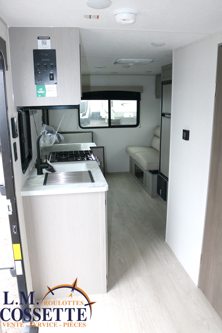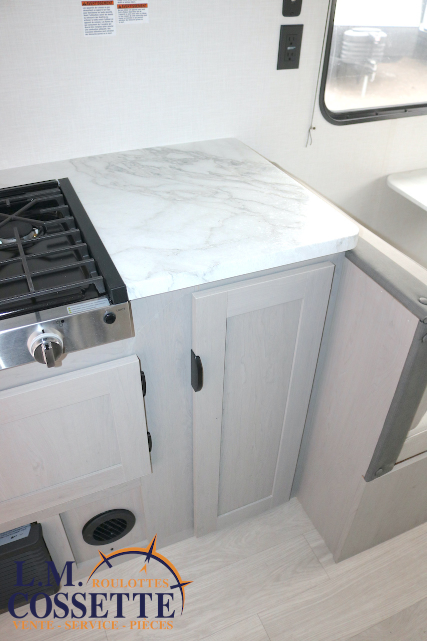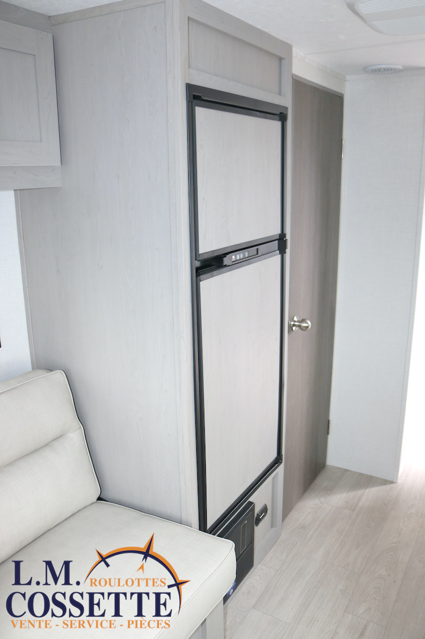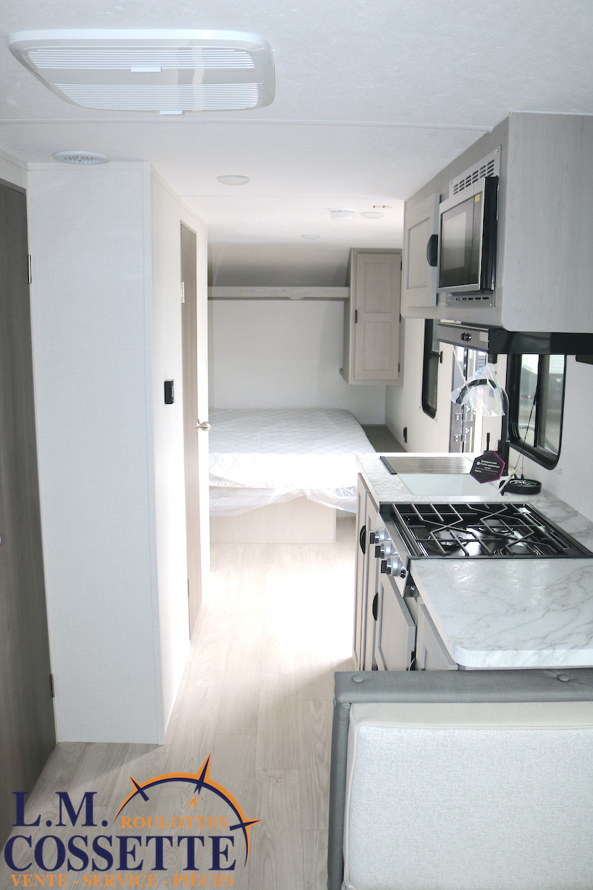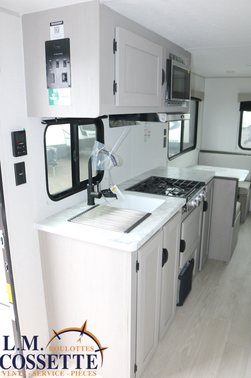 ÉTONNANTE ROULOTTE AVEC GRANDE FENESTRATION ARRIÈRE !!! Son lit à l’avant , est accessible des deux côtés . L’évier dans la cuisine est grand , et le comptoir comprend un bel espace de travail . Le garde-manger , situé tout juste à côté du réfrigérateur , est immense ! Le divan peut se transformer en lit , et comprend un espace de rangement en-dessous ! Le coffre extérieur fait la largeur de la roulotte . Venez la voir , ses nombreux avantages vous étonnerons ! Vous pouvez nous rejoindre au (819)378-2491 .