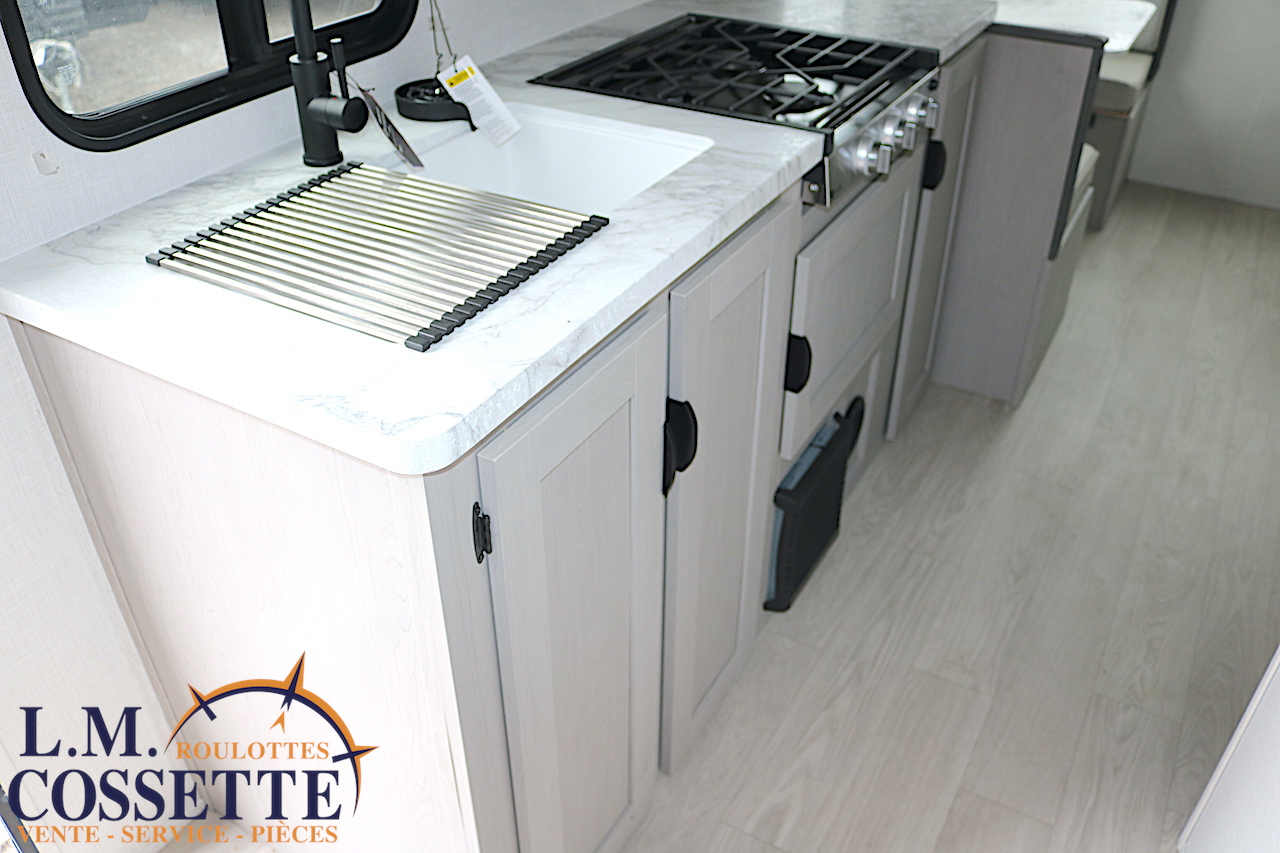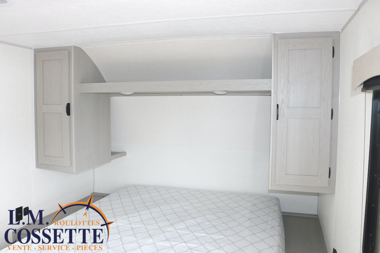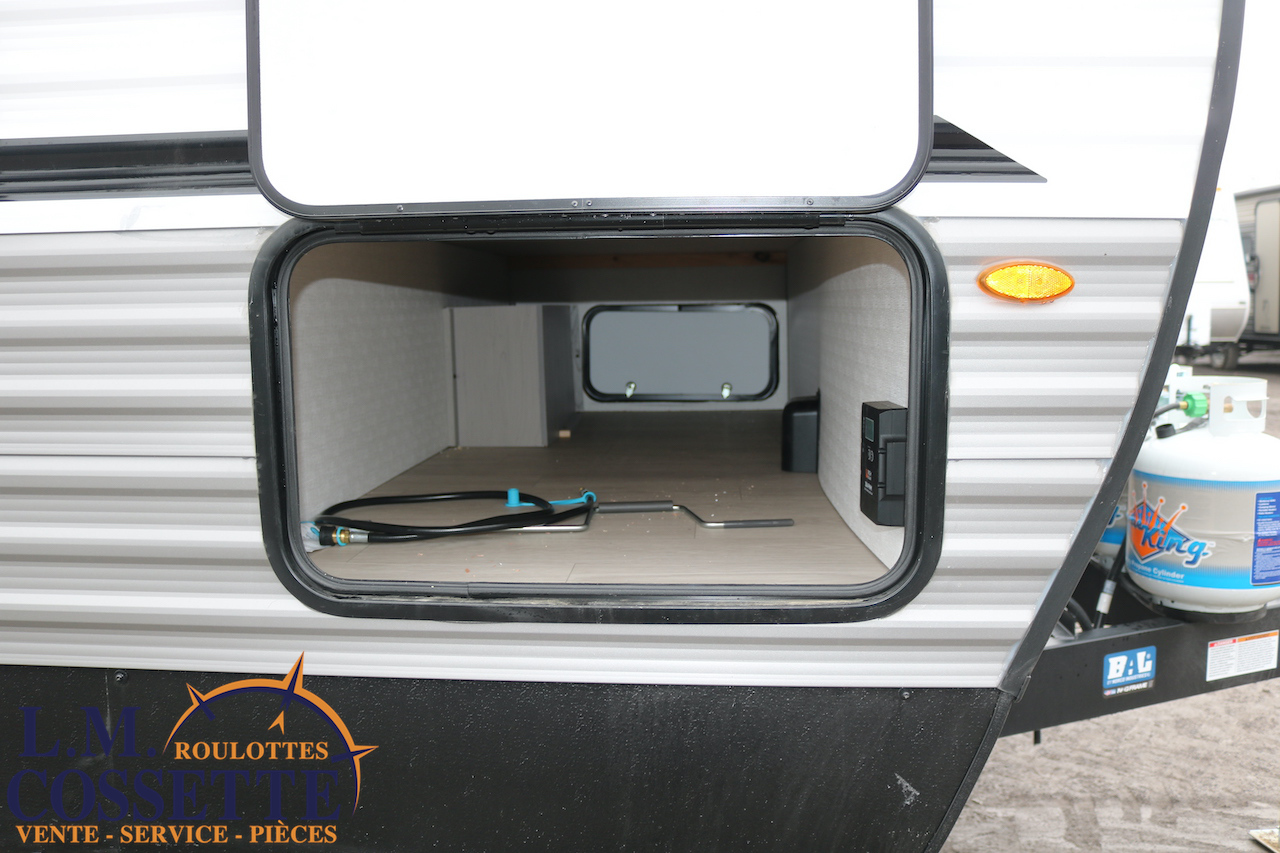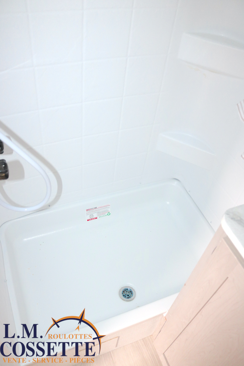 ÉTONNANTE ROULOTTE AVEC GRANDE FENESTRATION ARRIÈRE !!! Son lit à l’avant , est accessible des deux côtés . L’évier dans la cuisine est grand , et le comptoir comprend un bel espace de travail . Le garde-manger , situé tout juste à côté du réfrigérateur , est immense ! Le divan peut se transformer en lit , et comprend un espace de rangement en-dessous ! Le coffre extérieur fait la largeur de la roulotte . Venez la voir , ses nombreux avantages vous étonnerons ! Vous pouvez nous rejoindre au (819)378-2491 .