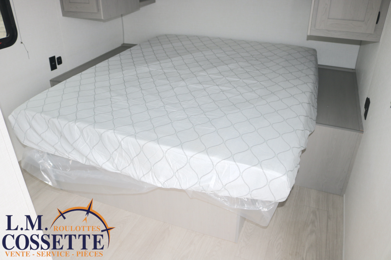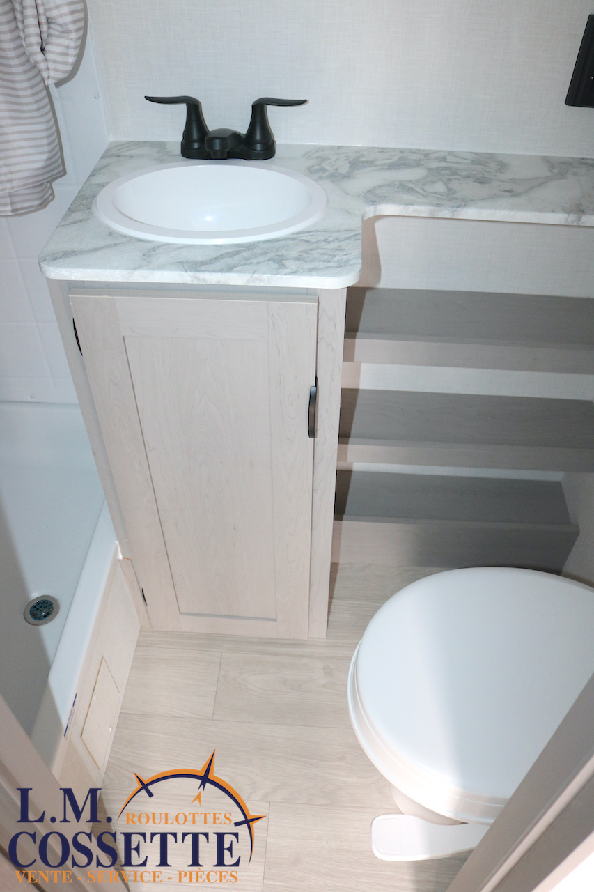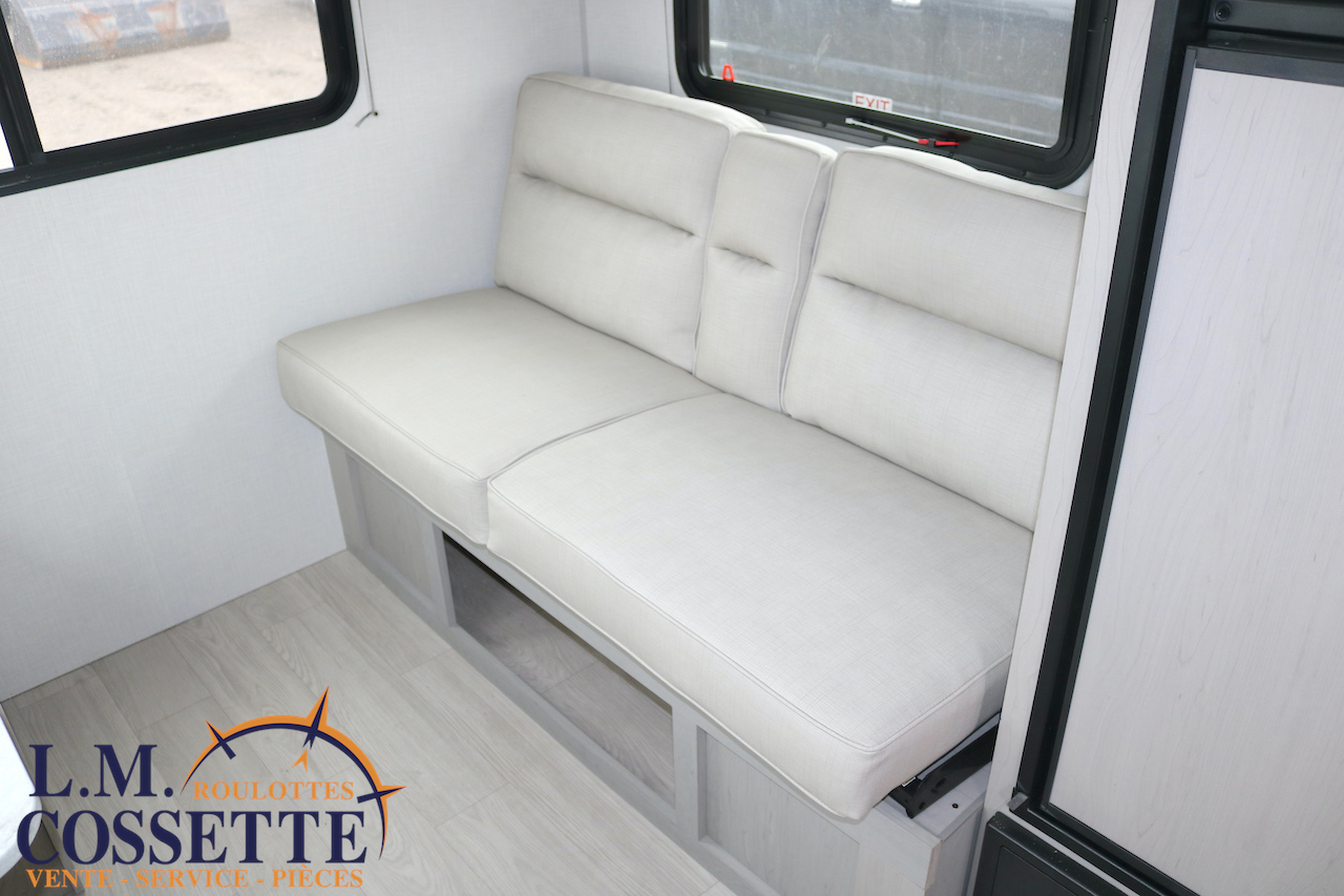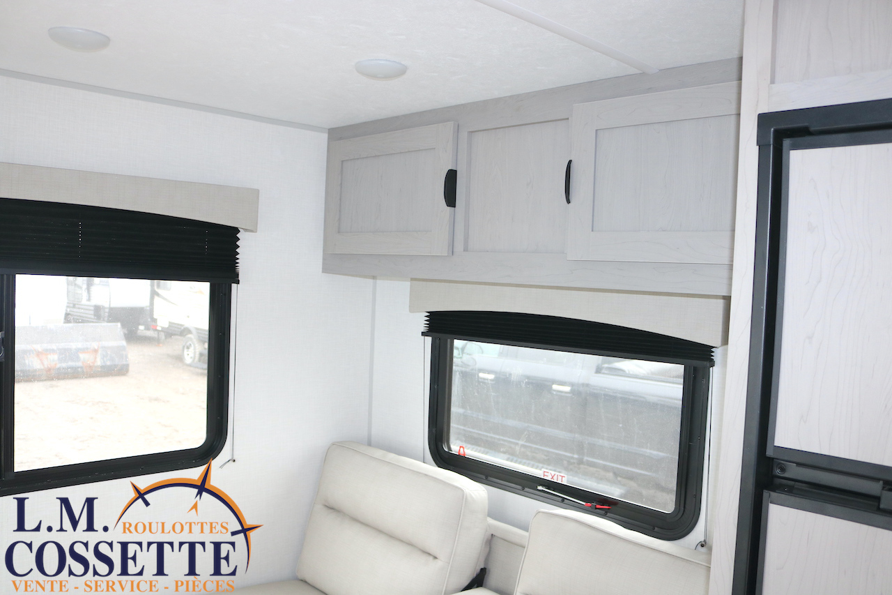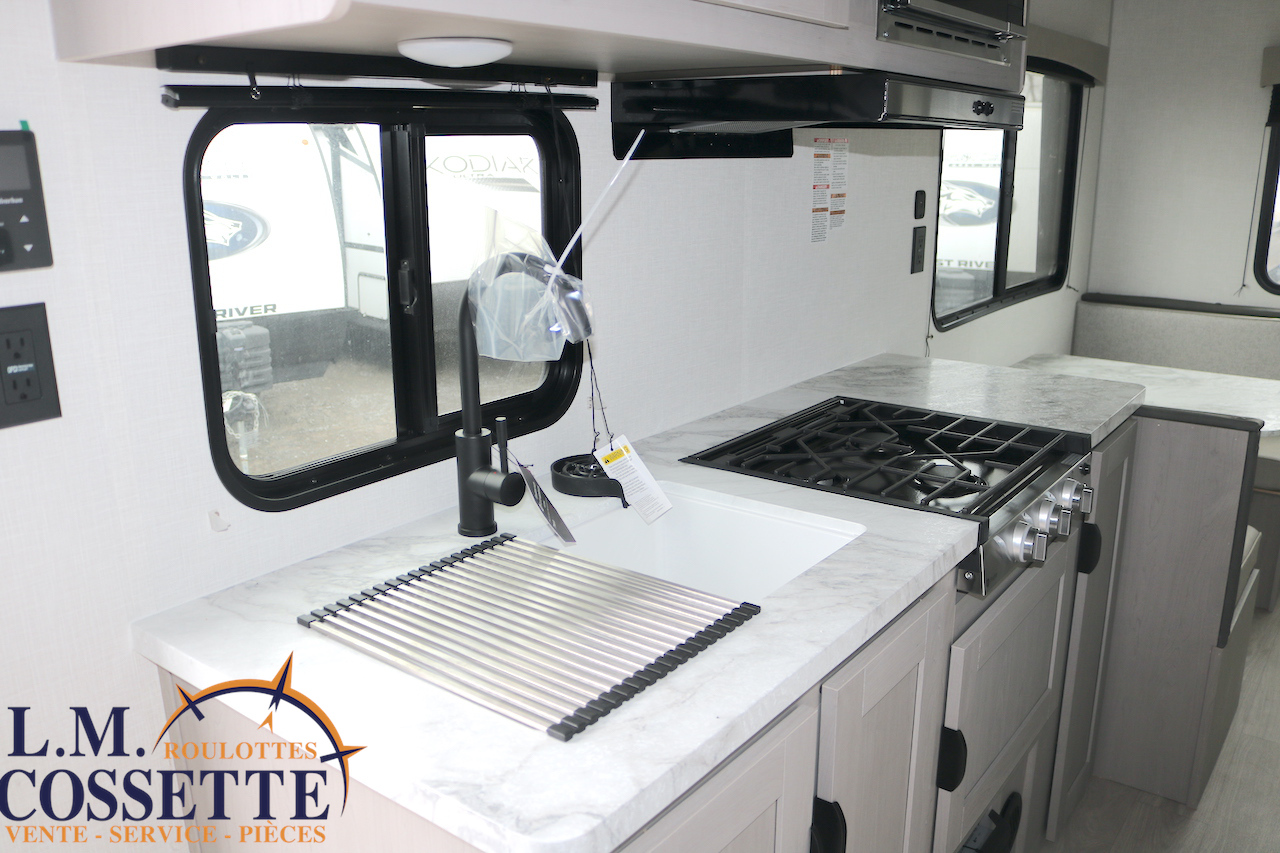 ÉTONNANTE ROULOTTE AVEC GRANDE FENESTRATION ARRIÈRE !!! Son lit à l’avant , est accessible des deux côtés . L’évier dans la cuisine est grand , et le comptoir comprend un bel espace de travail . Le garde-manger , situé tout juste à côté du réfrigérateur , est immense ! Le divan peut se transformer en lit , et comprend un espace de rangement en-dessous ! Le coffre extérieur fait la largeur de la roulotte . Venez la voir , ses nombreux avantages vous étonnerons ! Vous pouvez nous rejoindre au (819)378-2491 .