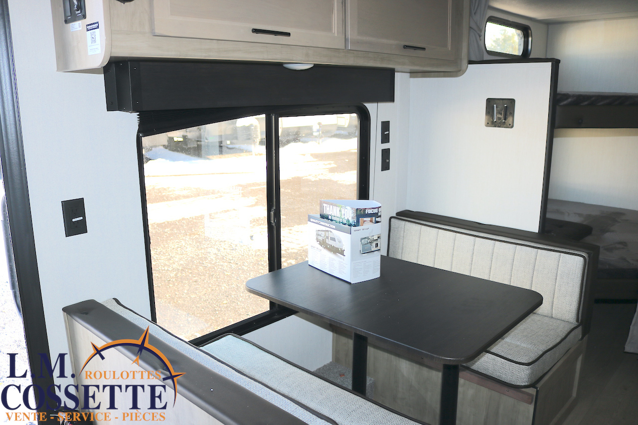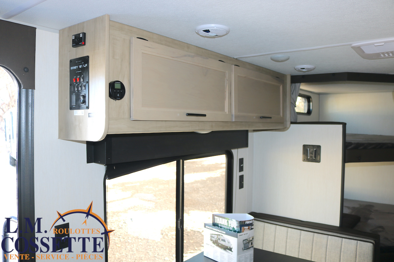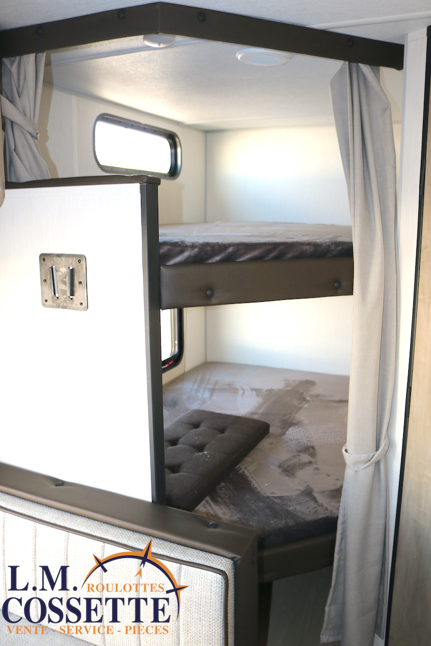 SUPERBE ROULOTTE FAMILIALE AVEC LITS DOUBLE SUPERPOSÉS !!! Ses fenêtres sont très grandes , permettant d’avoir un éclairage intérieur incroyable ! Elle possède un très pratique garde-manger , situé tout juste à côté du réfrigérateur . Le lit avant est très large , et possède de petit espaces de chaque côté pour y mettre vos effets personnel . Venez la voir , son décor chaleureux , ainsi que ses nombreux avantages vous étonnerons . Vous poouvez nous rejoindre au (819)378-2491 .