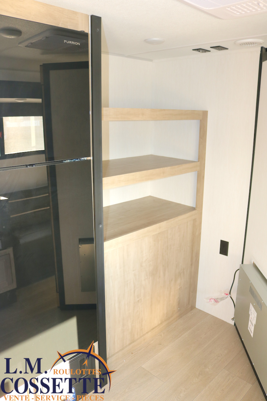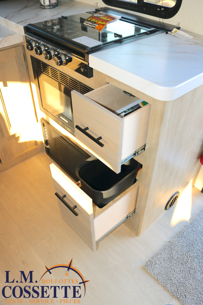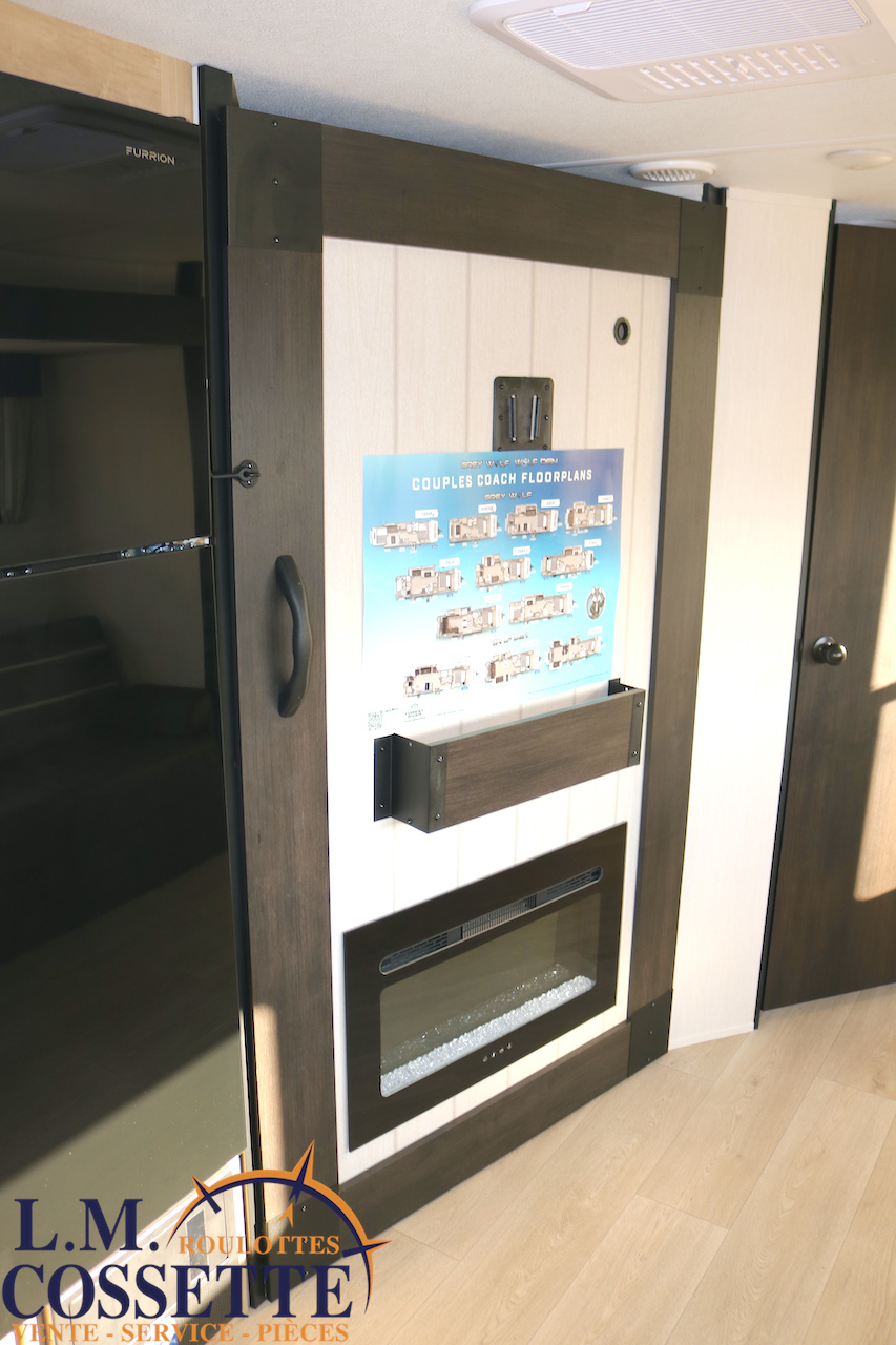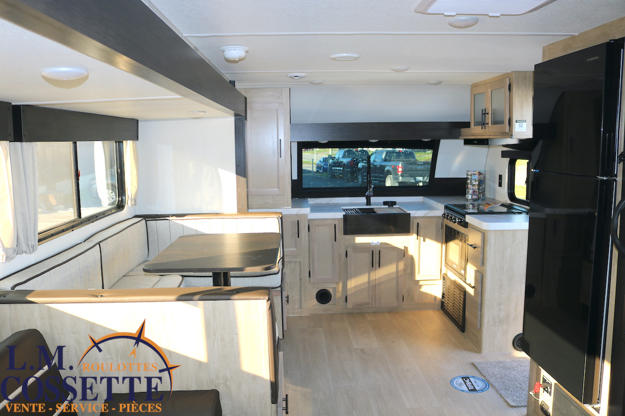 SENSATIONNEL ROULOTTE AVEC CUISINE À L’AVANT !!! La cuisine est tout simplement magnifique , avec beaucoup d’espace comptoir , des tiroirs et plein d’armoires . Elle possède , de plus , un grand garde-manger dissimulé derrière l’emplacement de la télé et du foyer électrique ! La chambre , à l’arrière , possède un lit de 66 pouces x 74 pouces . Elle est équipé d’une cuisine extérieure comprenant un petit frigo 110 volts , un grill et une machine à glaces . Son coffre extérieur à l’arrière , est très spacieux . Venez la voir , vous tomberez sous le charme de cette magnifique roulotte . Vous pouvez nous rejoindre au (819)378-2491 .