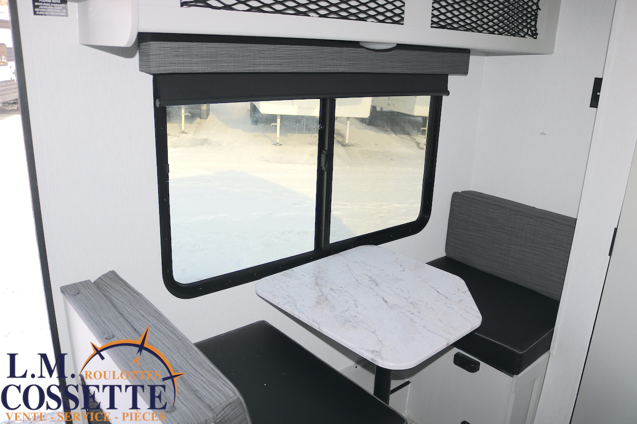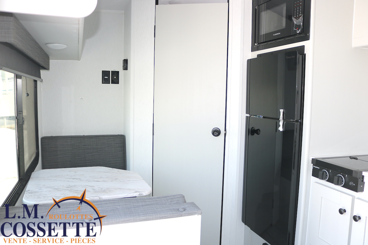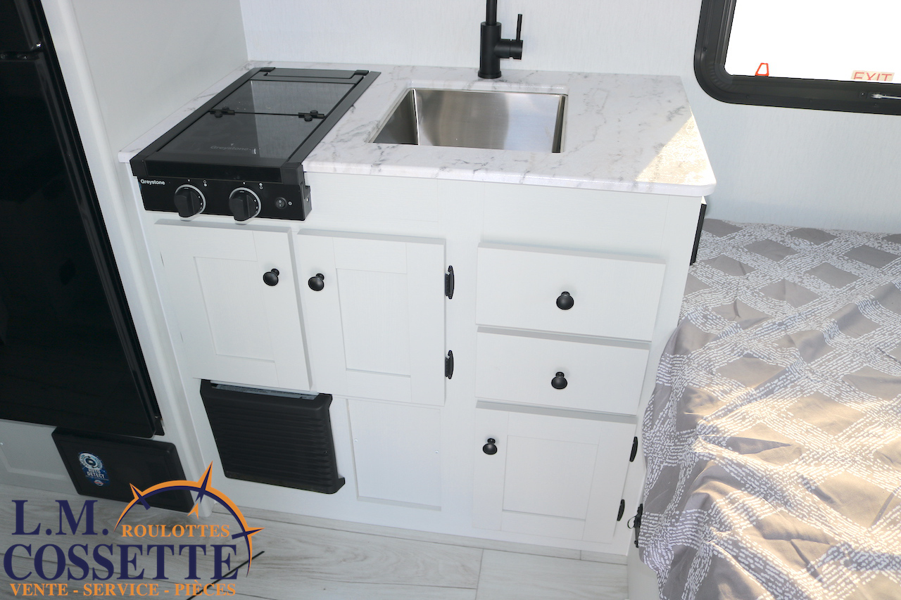 MIGNONNE PETITE ROULOTTE POUR COUPLE !!! Toute petite , avec un poids de seulement 2678 lbs , elle possède vraiment tout le nécessaire pour aller camper ! Une belle grande fenêtre surplombe la petite banquette pour deux personnes , qui peux se transformer en lit pour dépanner . Le comptoir , fonctionnel , comprend un évier en stainless , des espaces de rangement et deux tiroirs . Le coffre extérieur est vaste , et fait la largeur de la roulotte . Venez la voir , son côté luxueux et son équipement incroyable vous ravirons . Vous pouvez nous rejoindre au (819)378-2491 .