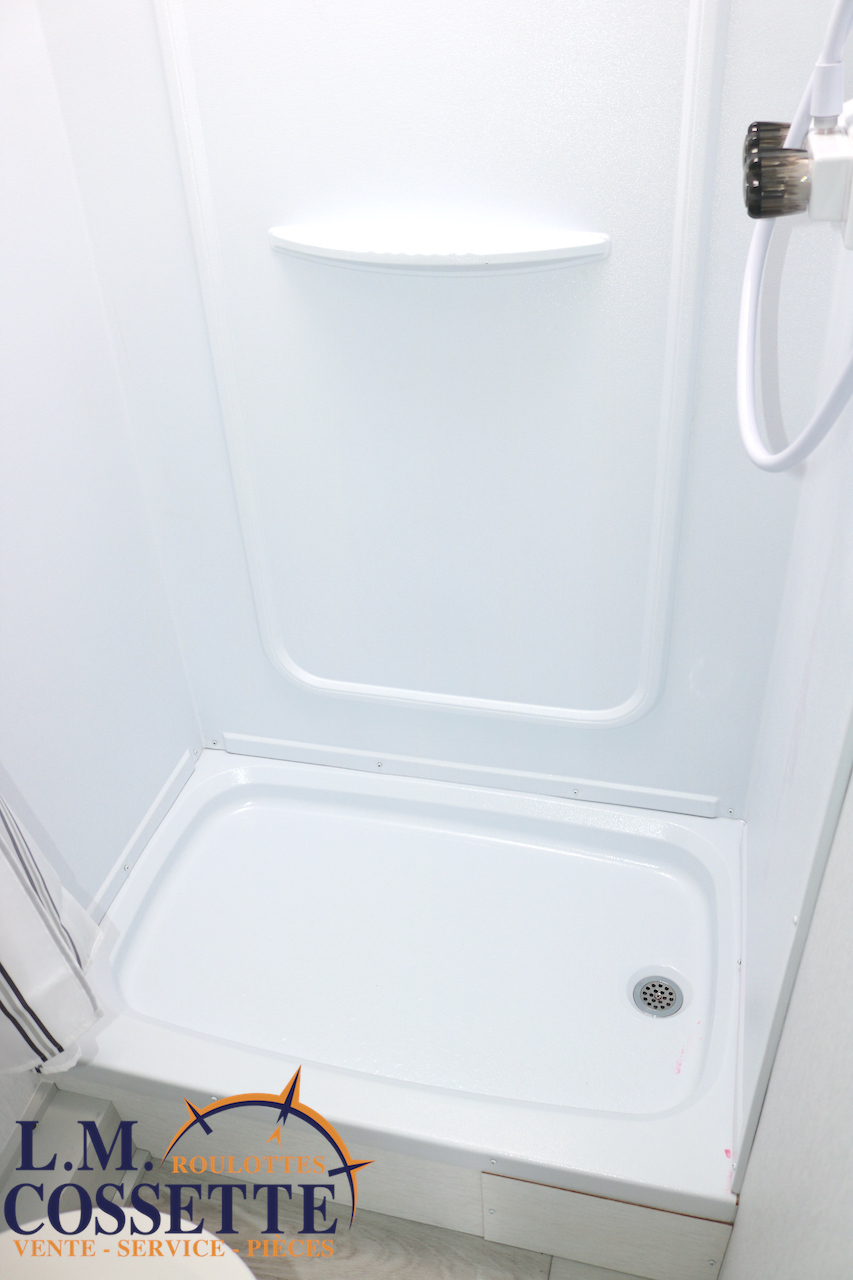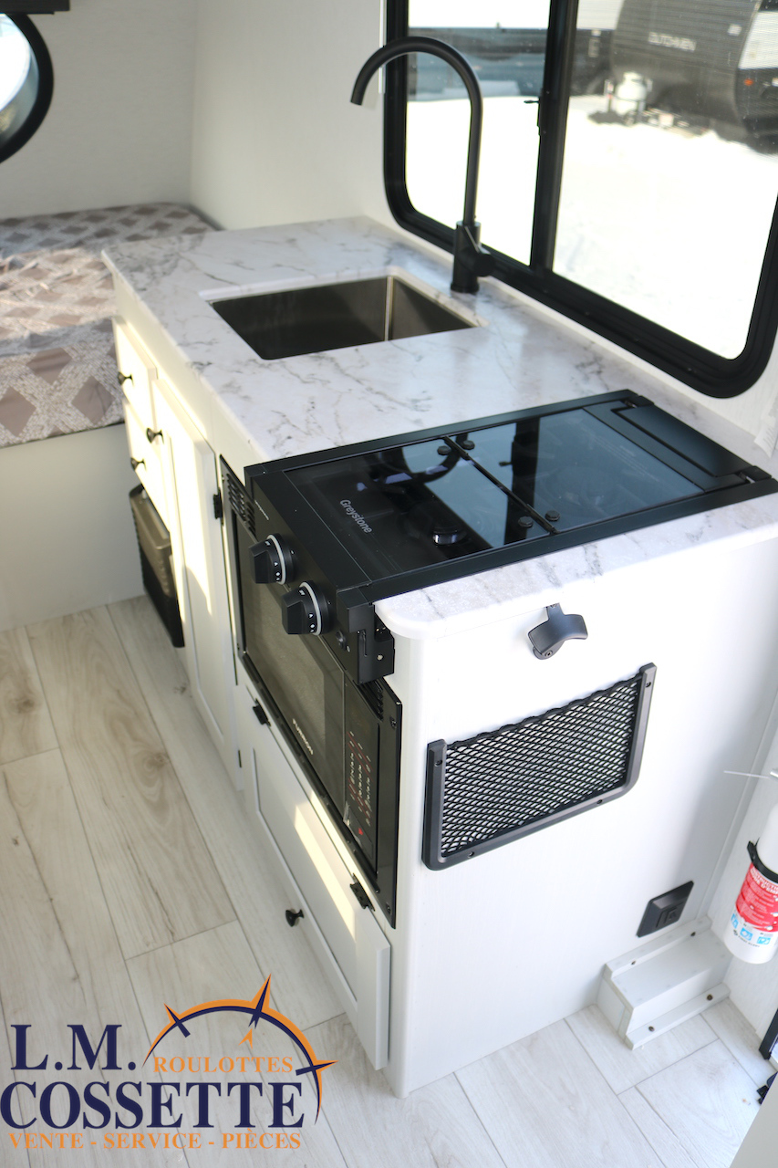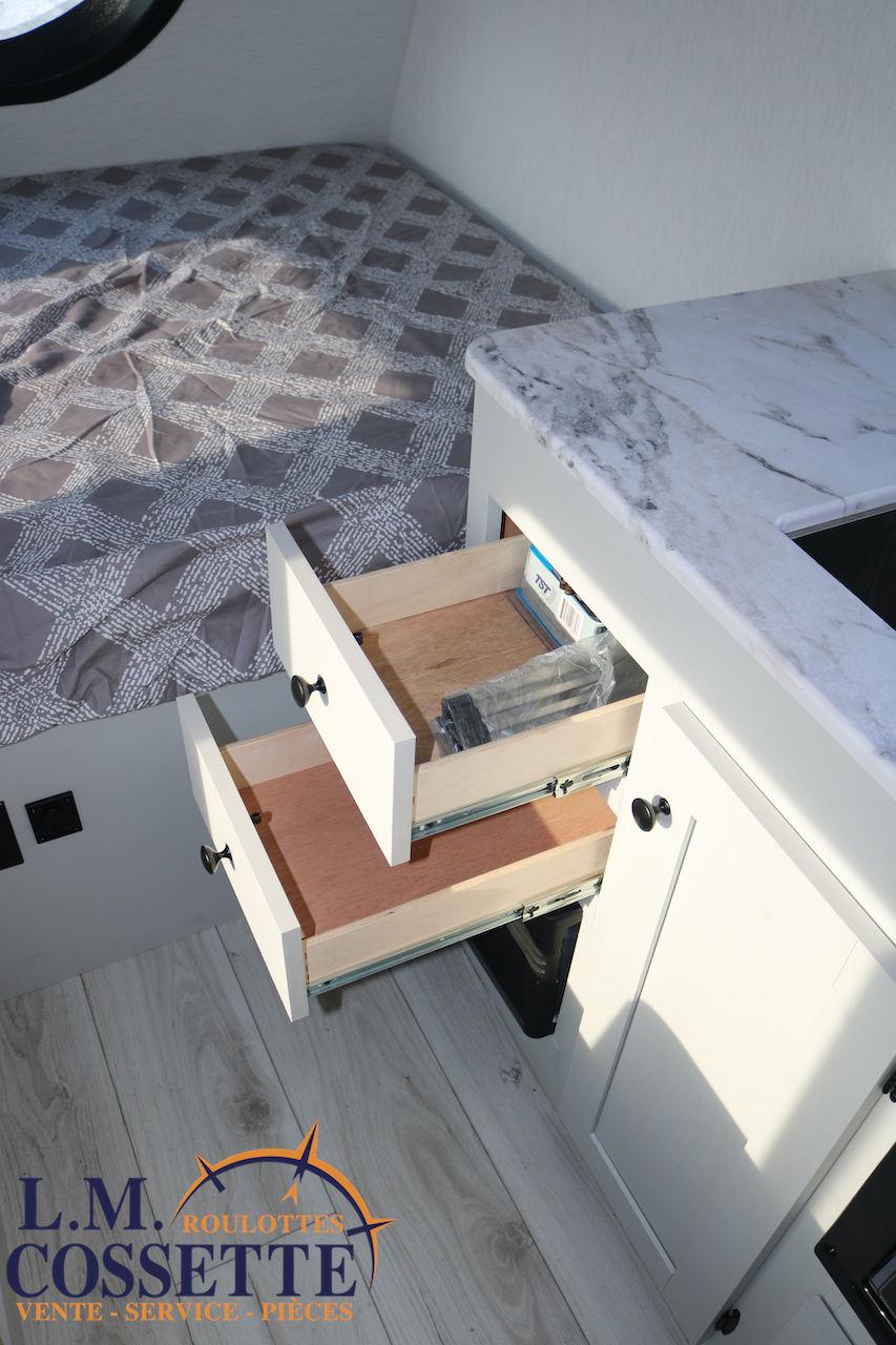 MAGNIFIQUE MODÈLE POUR COUPLE !!! Très légère , luxueuse , en fibre de verre Azdel , ce modèle a vraiment tout pour vous satisfaire ! Ses nombreuses fenêtres sont grandes , procurant un bel éclairage naturel . Son comptoir est vaste , et comprend 2 tiroirs , ainsi que de nombreux espaces de rangement . Son évier est en stainless . Le coffre extérieur est très vaste et fait la largeur de la roulotte . Venez la voir , la beauté de cette petite roulotte vous émerveillera ! Vous pouvez nous rejoindre au (819)378-2491 .