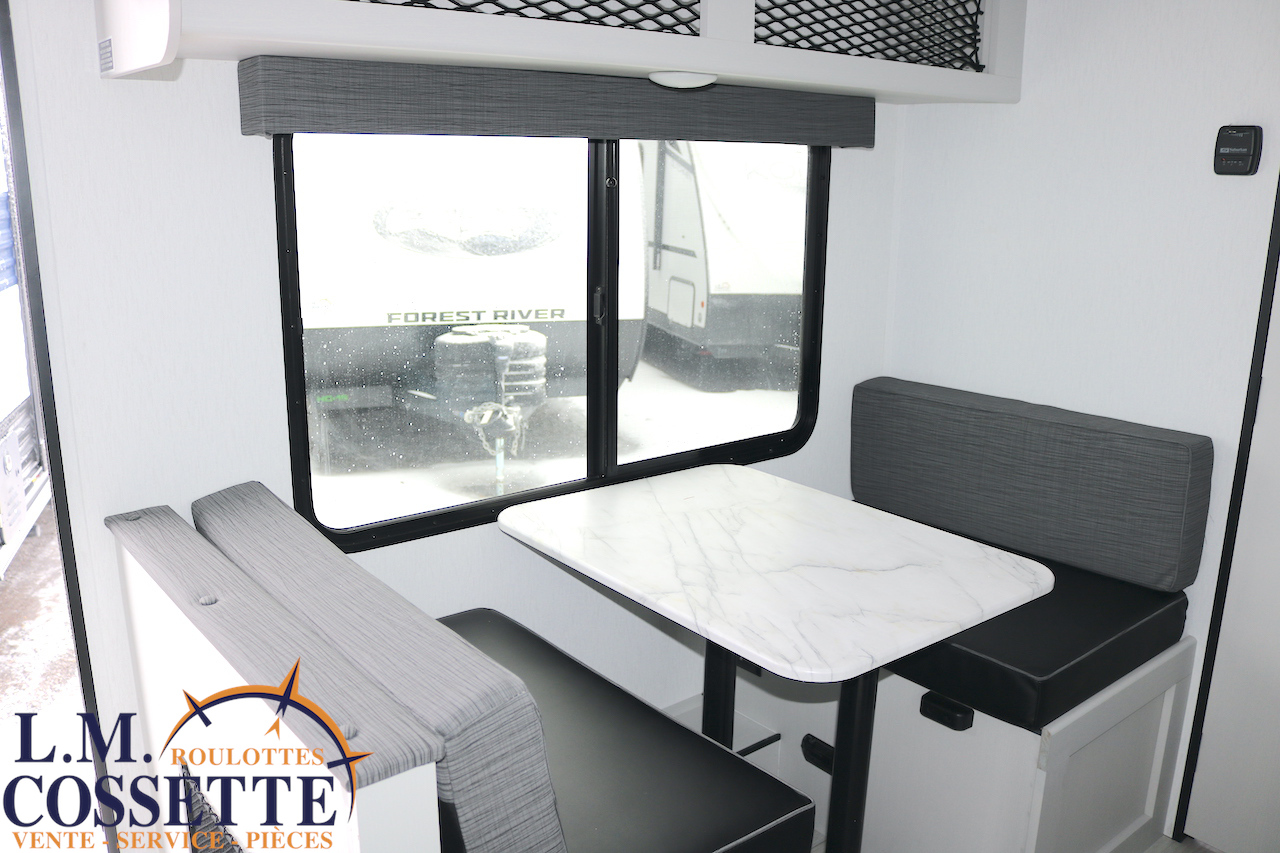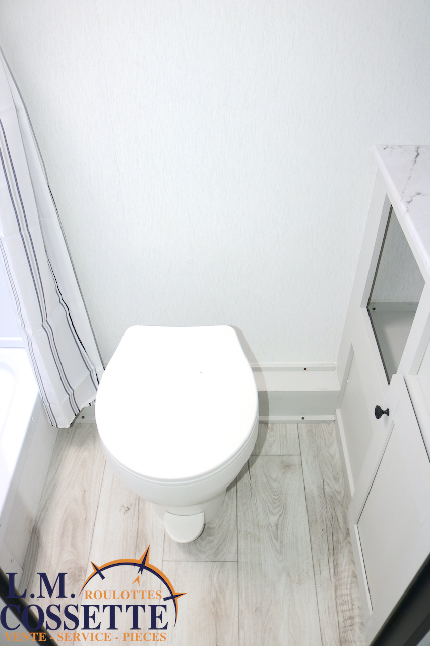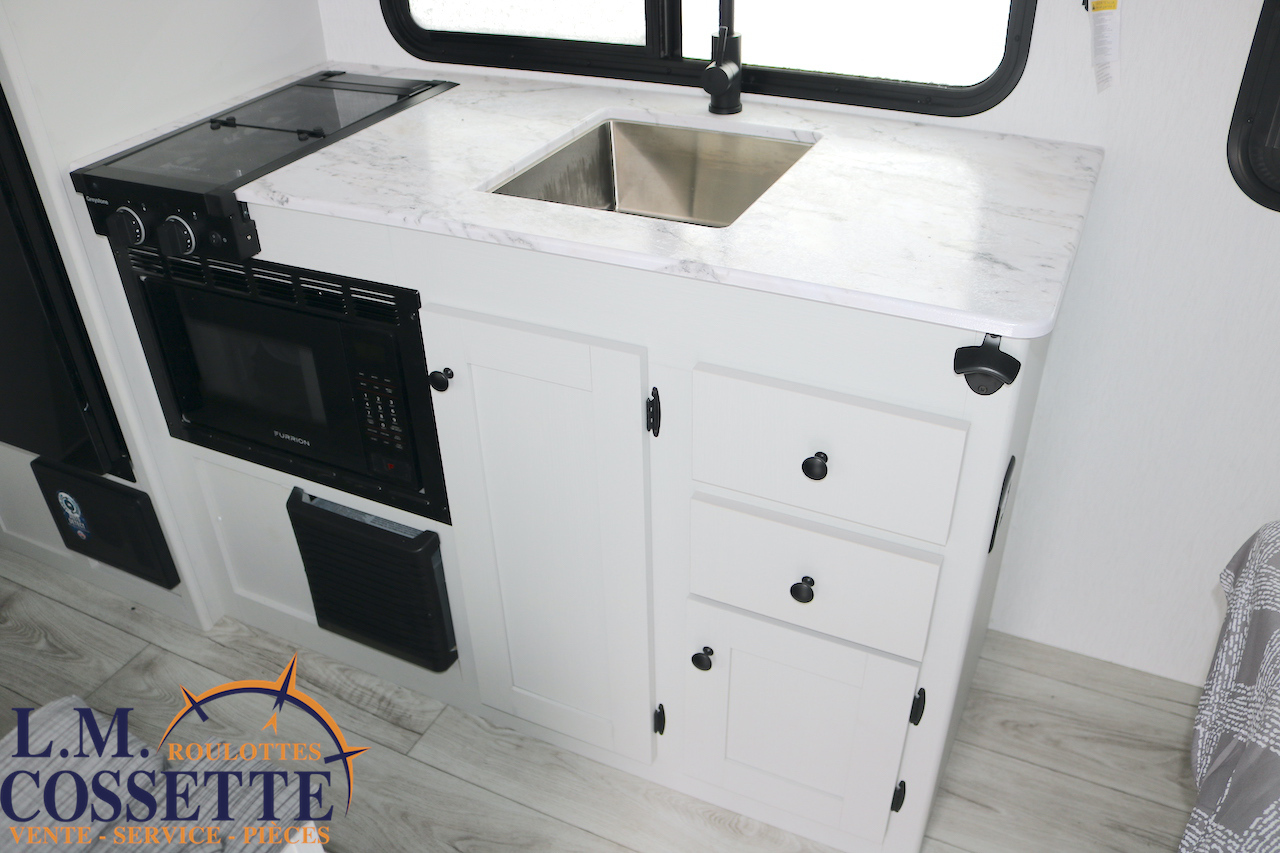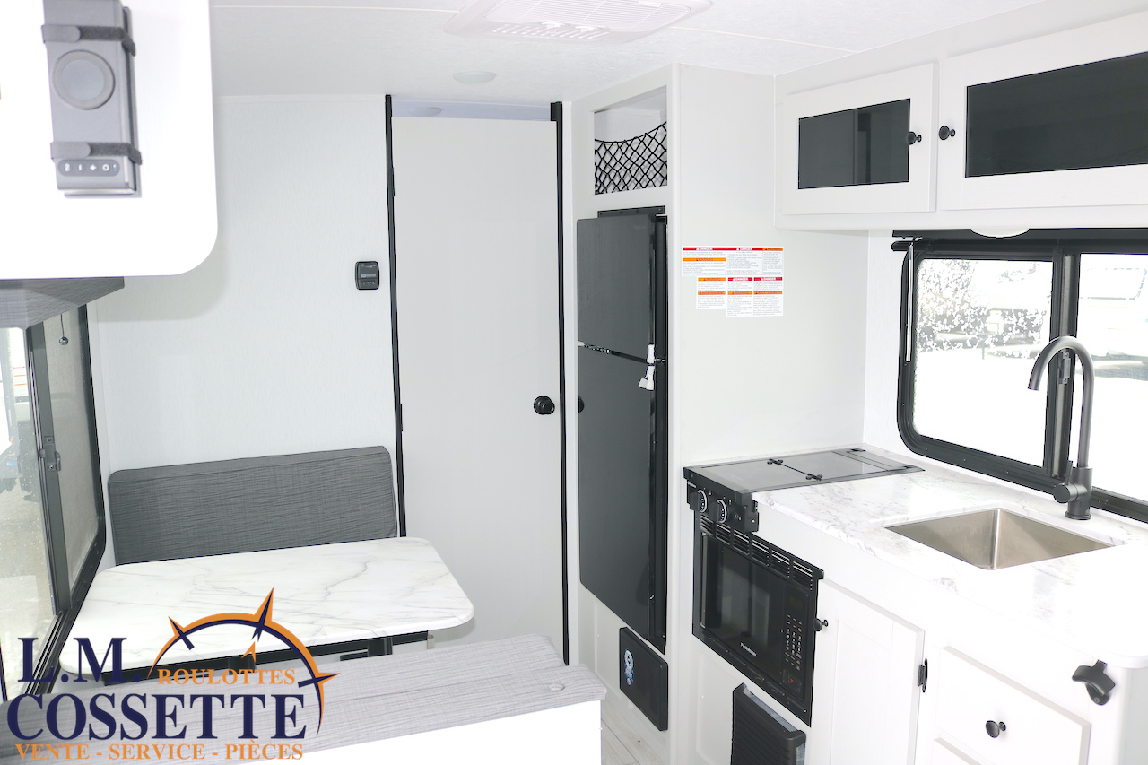 ÉLÉGANTE PETITE ROULOTTE POUR COUPLE !!! Elle possède une banquette pour deux personnes , surplombé par une grande fenêtre ! Son lit est accessible des deux côtés . Son comptoir comprend deux tiroirs , un évier en stainless , ainsi qu’un bel espace de travail . La salle de bain est vaste et très fonctionnelle . Son coffre extérieur fait la largeur de la roulotte , et ses roues dont de type ”off road” . Venez la voir , tout ces avantages vous convaincront que c’est la roulotte qu’il vous faut ! Vous pouvez nous rejoindre au (819)378-2491 .