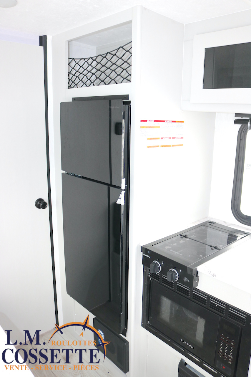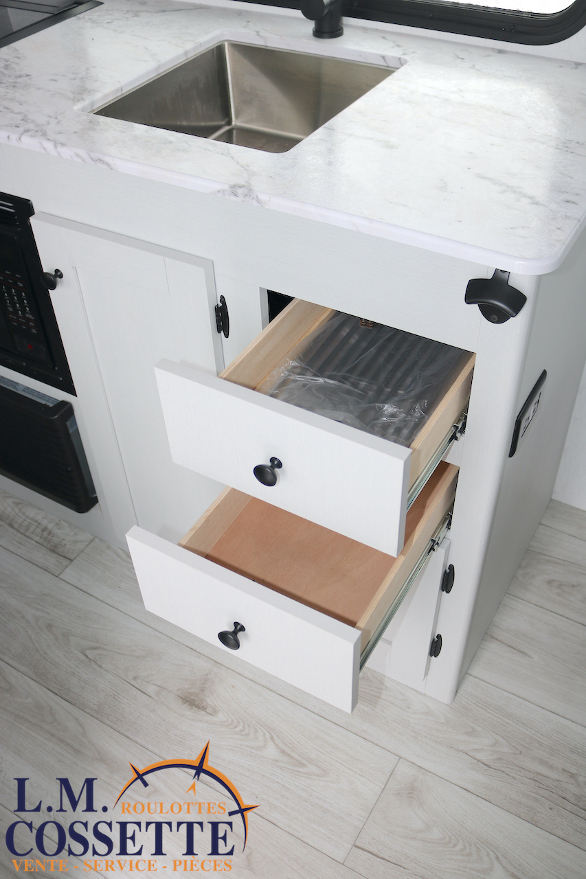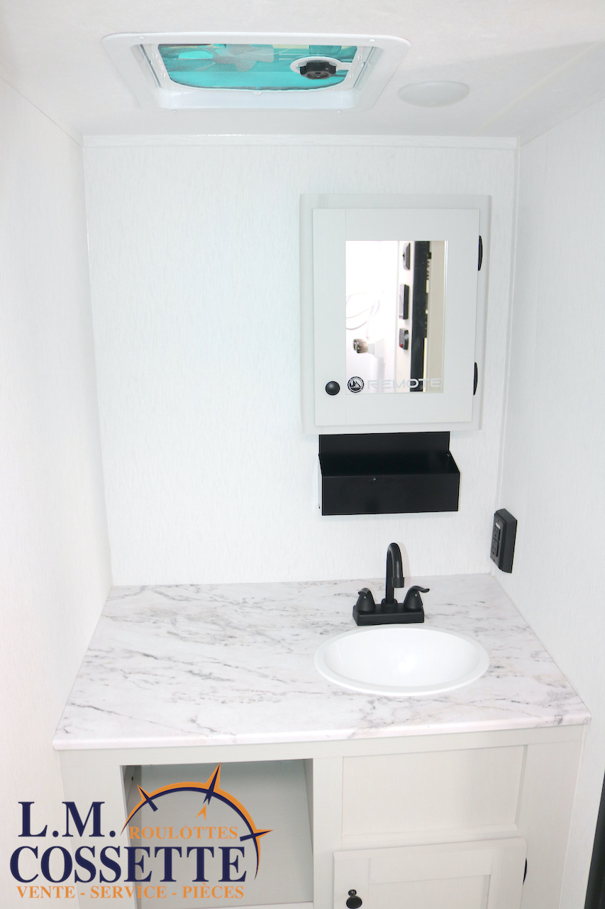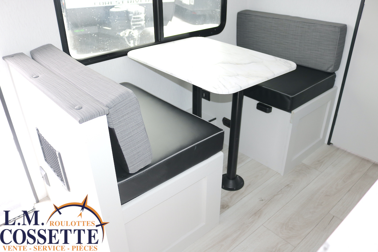 ÉLÉGANTE PETITE ROULOTTE POUR COUPLE !!! Elle possède une banquette pour deux personnes , surplombé par une grande fenêtre ! Son lit est accessible des deux côtés . Son comptoir comprend deux tiroirs , un évier en stainless , ainsi qu’un bel espace de travail . La salle de bain est vaste et très fonctionnelle . Son coffre extérieur fait la largeur de la roulotte , et ses roues dont de type ”off road” . Venez la voir , tout ces avantages vous convaincront que c’est la roulotte qu’il vous faut ! Vous pouvez nous rejoindre au (819)378-2491 .