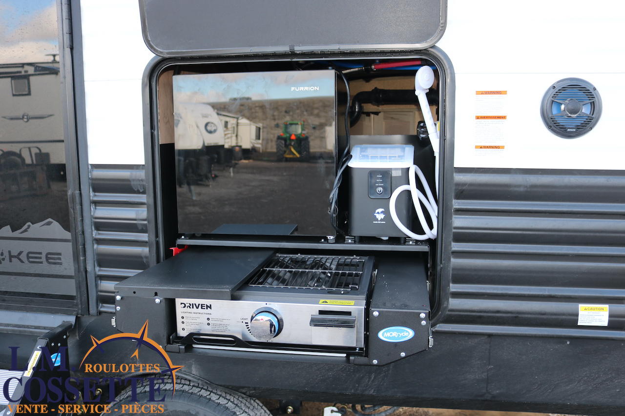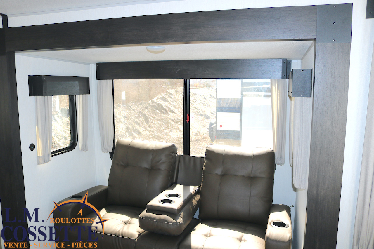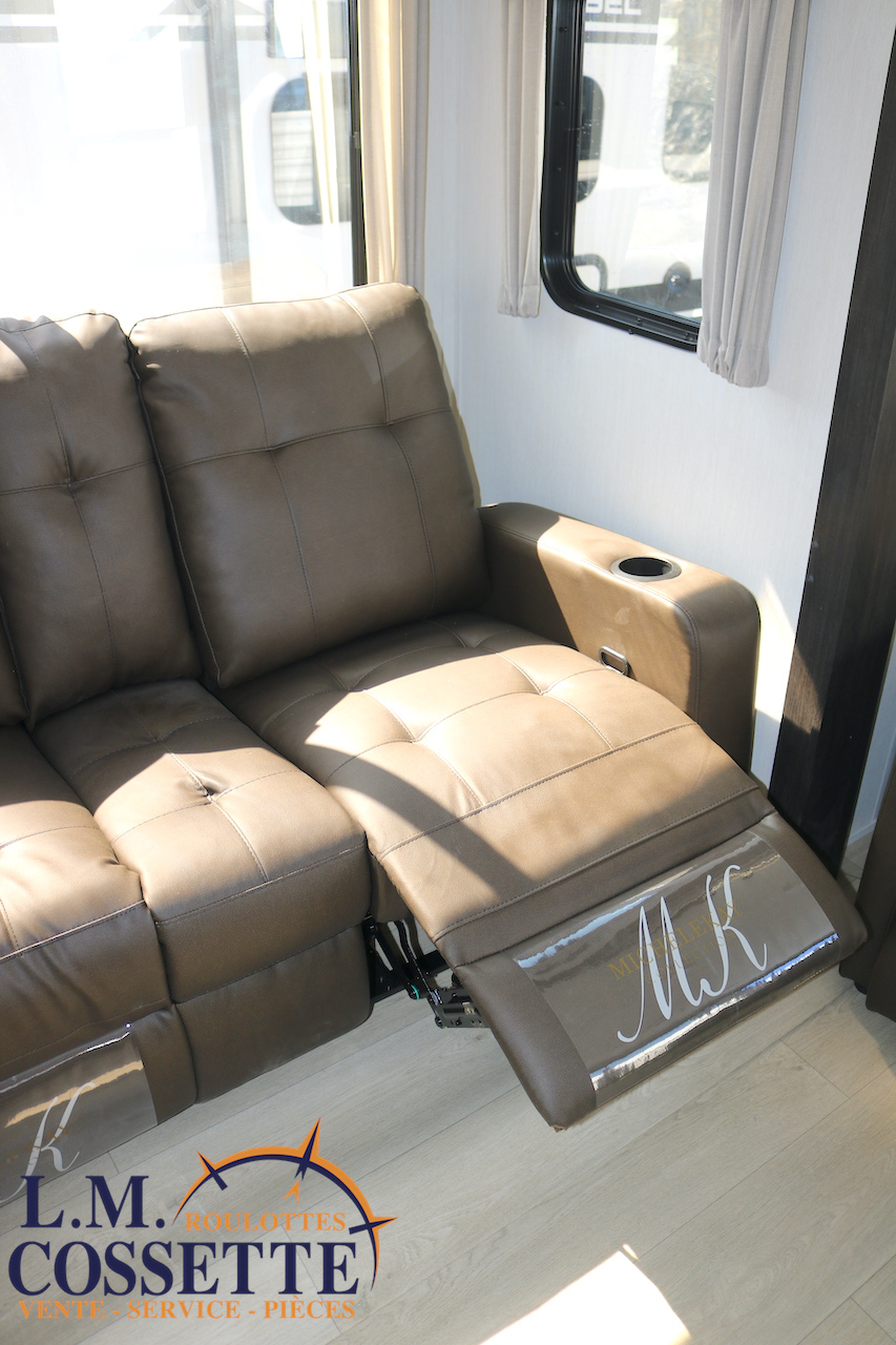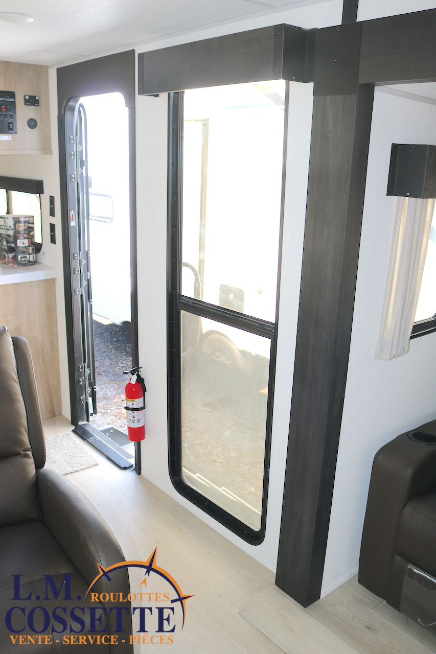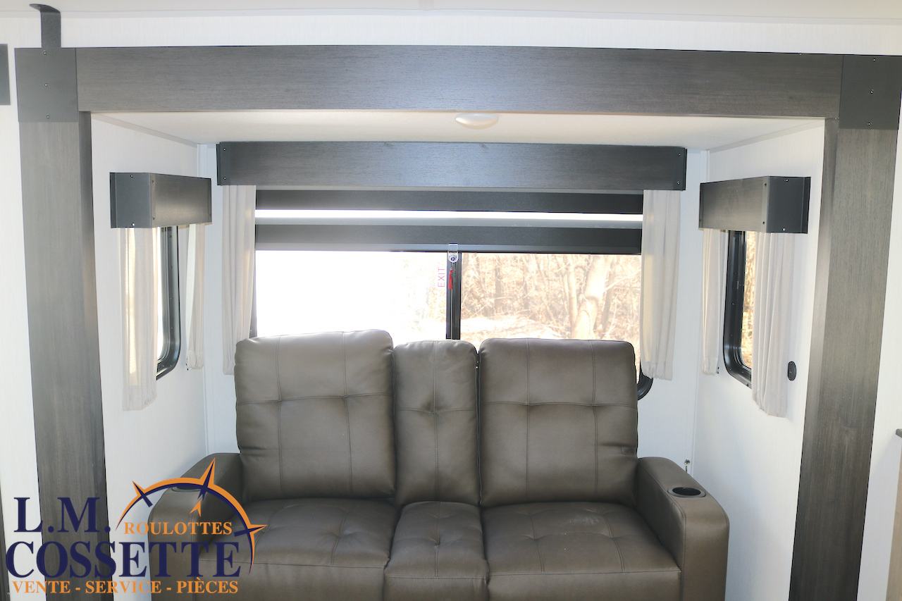 SPLENDIDE ROULOTTE AVEC IMMENSE SALON ARRIÈRE !!! Le salon arrière comprend deux divans muni d’appuis-jambes , ainsi que deux fauteuils muni , eux aussi , d’appuis-jambes . La fenestration arrière est incroyable grâce à ses multiples grandes fenêtres . De plus , un pratique comptoir lunch sépare la cuisine du salon . Dans la chambre , un rangement peut servir à installer une laveuse / sécheuse . La douche surdimensionnée , possède un petit banc , ainsi qu’une porte vitrée . Elle est équipé d’une petite cuisine extérieure comprenant un grill , un frigo , et même une machine à glaces . Venez la voir , vous serez étonné en la voyant ! Vous pouvez nous rejoindre au (819)378-2491 .