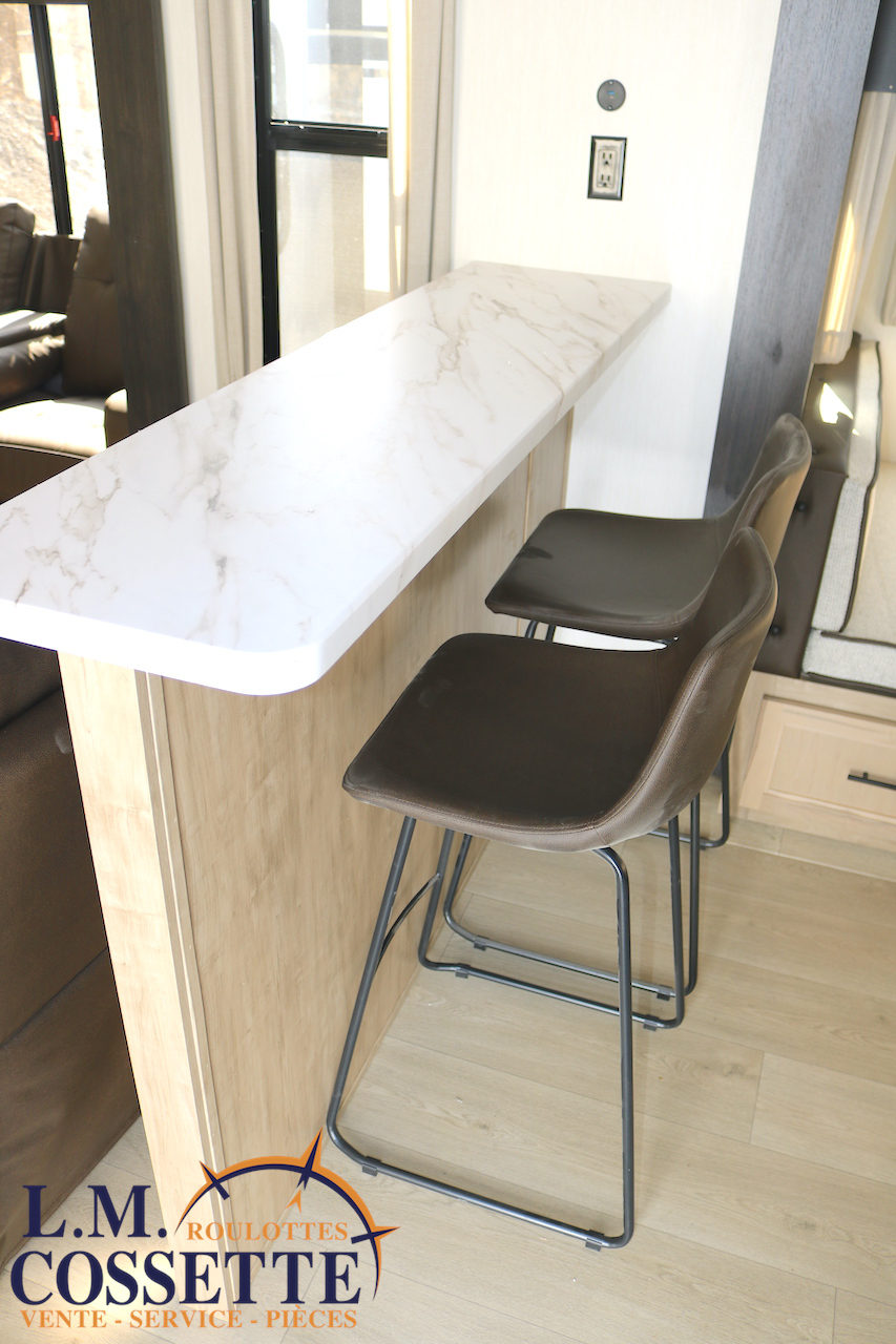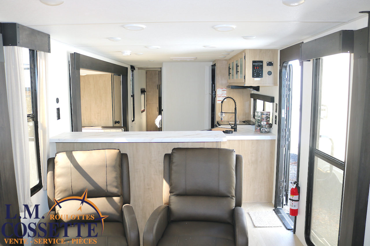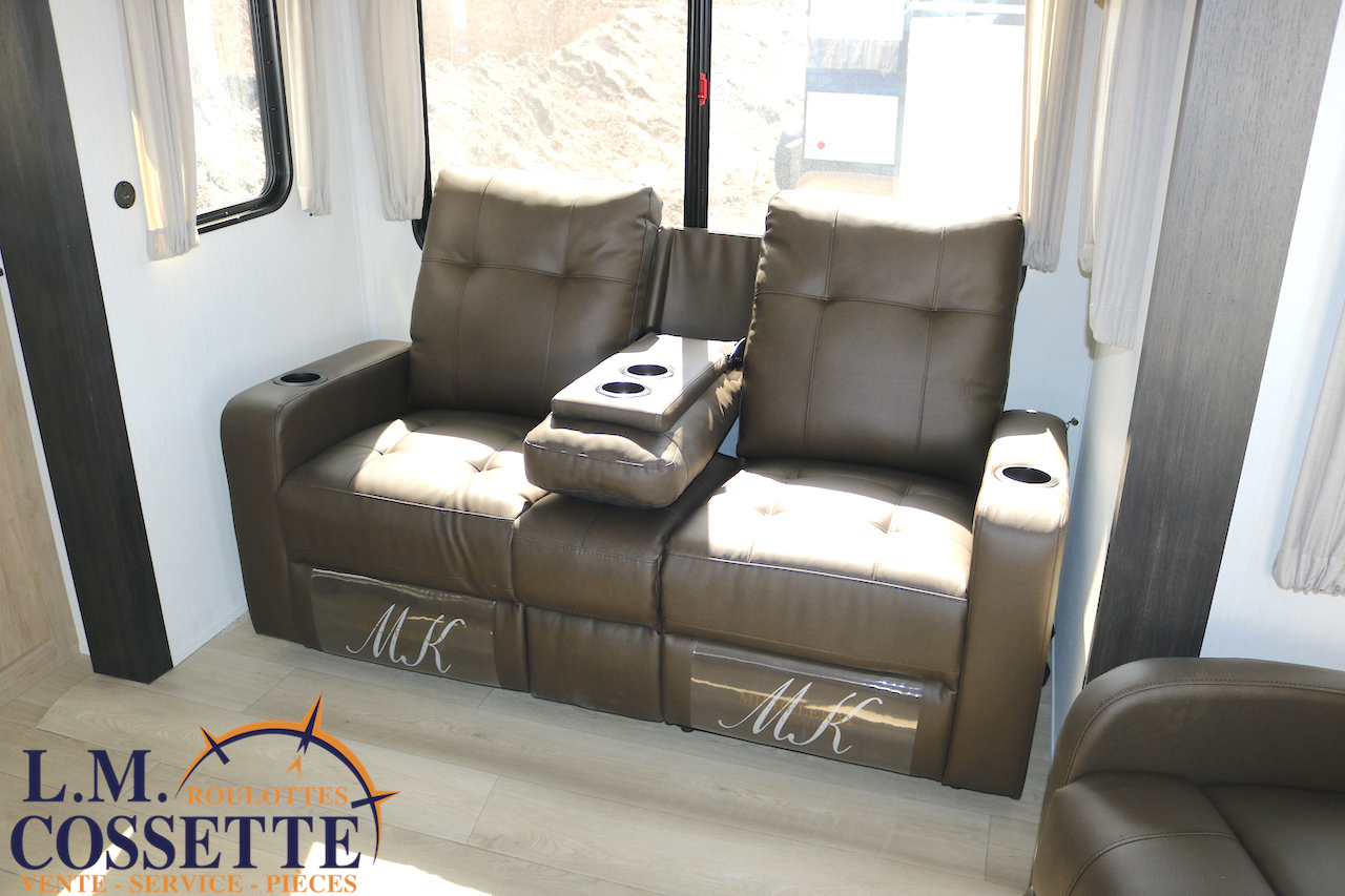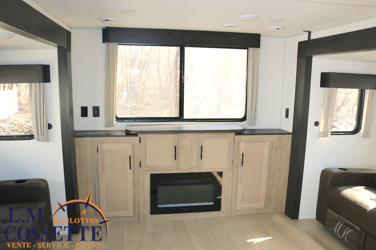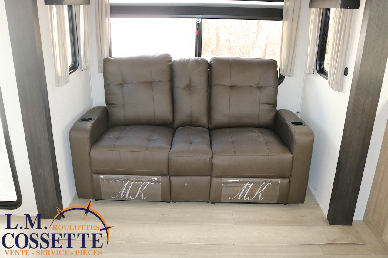 SPLENDIDE ROULOTTE AVEC IMMENSE SALON ARRIÈRE !!! Le salon arrière comprend deux divans muni d’appuis-jambes , ainsi que deux fauteuils muni , eux aussi , d’appuis-jambes . La fenestration arrière est incroyable grâce à ses multiples grandes fenêtres . De plus , un pratique comptoir lunch sépare la cuisine du salon . Dans la chambre , un rangement peut servir à installer une laveuse / sécheuse . La douche surdimensionnée , possède un petit banc , ainsi qu’une porte vitrée . Elle est équipé d’une petite cuisine extérieure comprenant un grill , un frigo , et même une machine à glaces . Venez la voir , vous serez étonné en la voyant ! Vous pouvez nous rejoindre au (819)378-2491 .